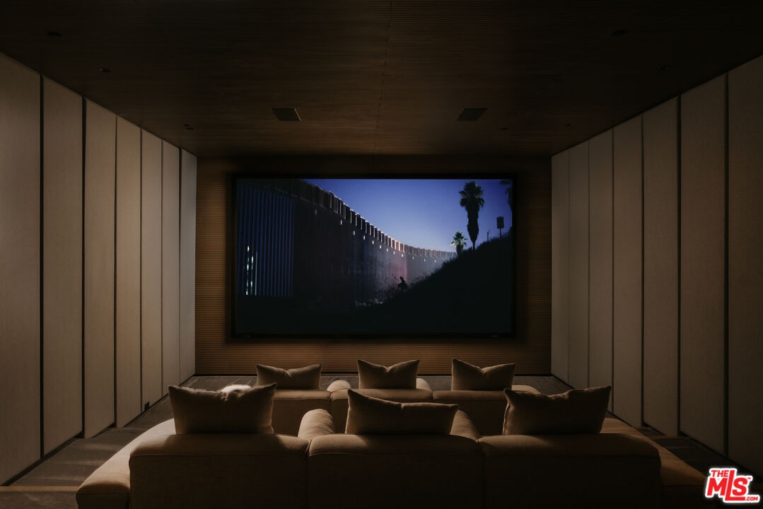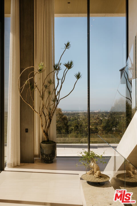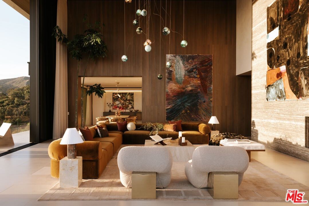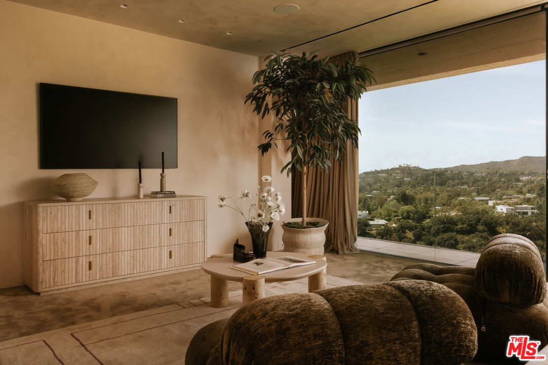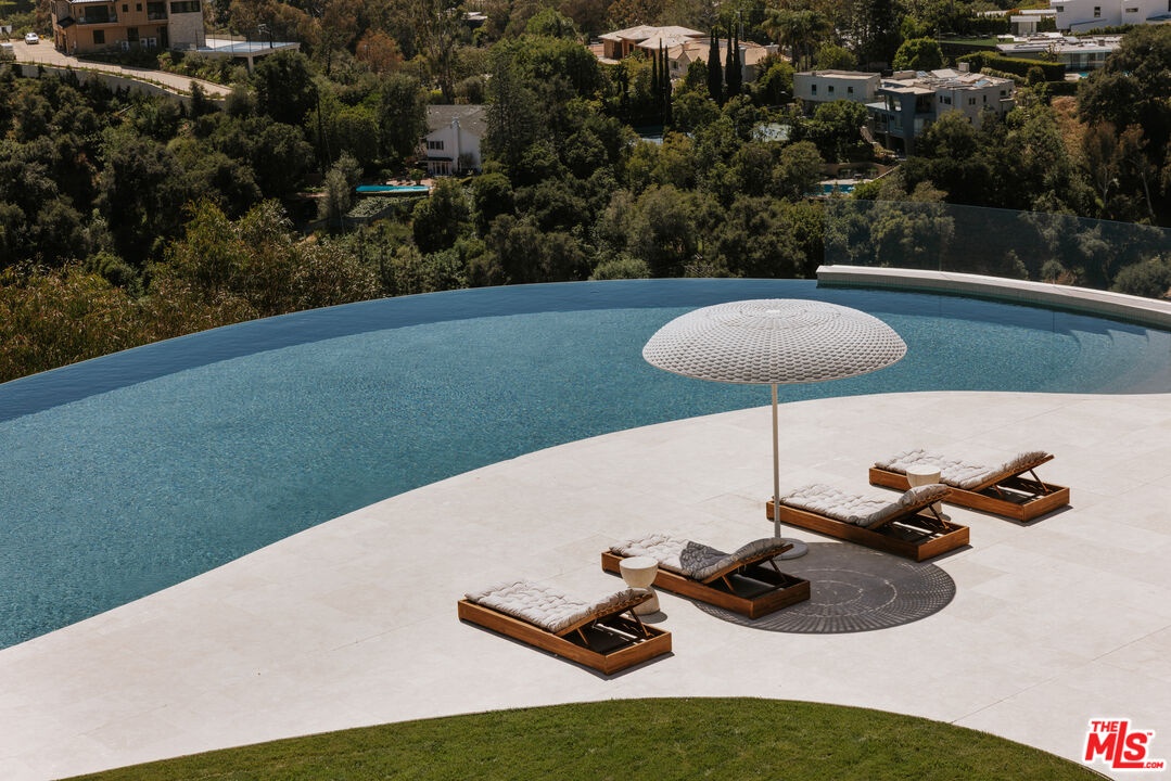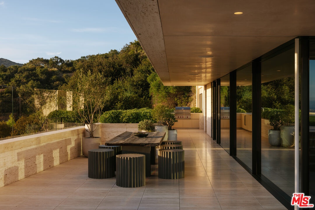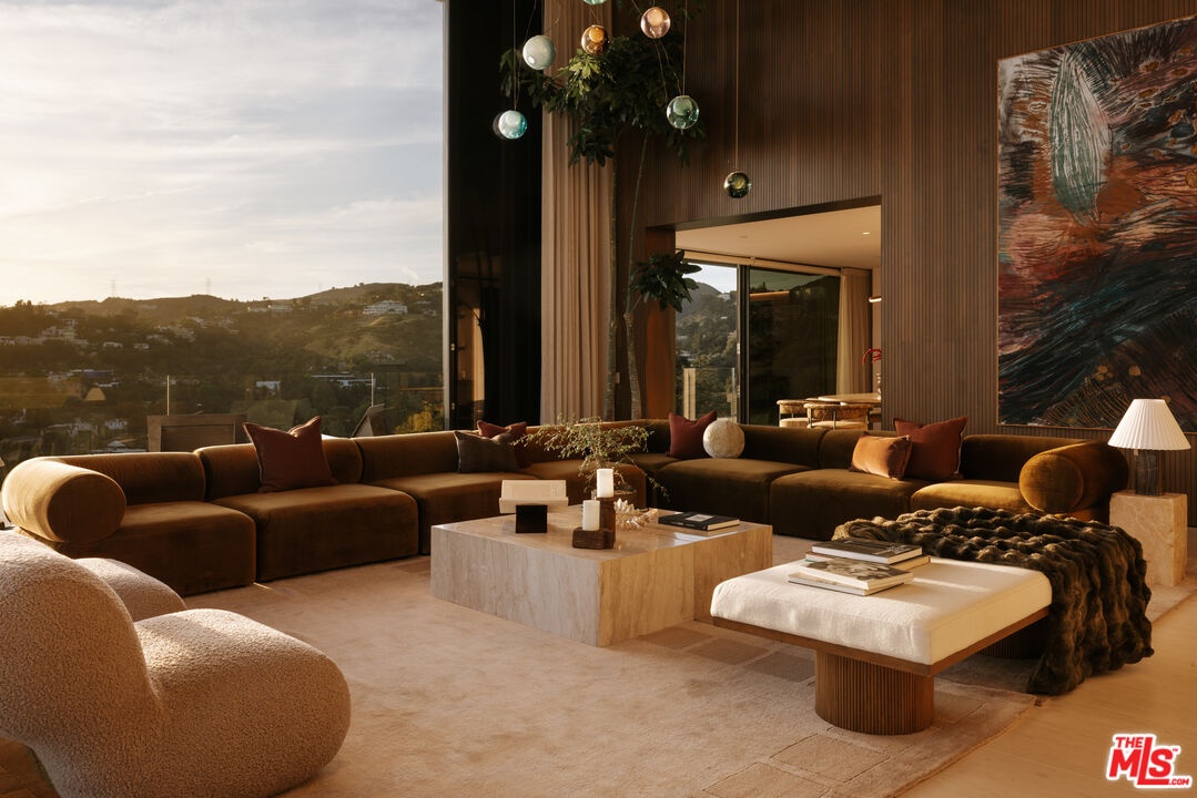 Sempre Vista. Representing one of the most compelling offerings in Los Angeles' luxury market in years. With over 12,500 square feet of Thomas Juul-Hansen architecture on 2 private acres in prime Brentwood. Juul-Hansen, the Danish architect, designed Sempre Vista as a monumental rectangular frame clad in sandblasted Alabastrino travertine, a finish chosen for its depth, warmth, and the way it holds light across the face of the building. Executed by Roderick Builders with the precision the design demanded, nearly 19-foot seamless motorized glass panels dissolve every wall, and the columns recede so completely at the lower level that the entire structure appears to float above the hillside. The views run coast to canyon, ocean to skyline, without a single interruption. Six bedroom suites, ten baths, elevator, double-height formal living room and foyer, Gaggenau kitchen with two oversized islands and custom oak cabinetry with recessed brass hardware, glass-enclosed temperature-controlled wine cellar, three-tier theater, massage room, sauna with a dedicated view window, gym, Gessi fixtures throughout, Cohiba granite primary bath with a cold plunge, steam shower, and in-shower TV, Calacatta Lincoln marble secondary bath, four-car garage, infinity pool curving with the natural contour of the hillside, and, at the crown, a 2,500+ square foot rooftop terrace with floating travertine decking and seamless glass railings where the Pacific, the mountains, and the entire Los Angeles basin unfold simultaneously. Situated on one of Brentwood's most coveted and private hillside addresses, less than five minutes from Sunset Boulevard, with views that reach from the ocean to downtown that few properties in this city achieve.