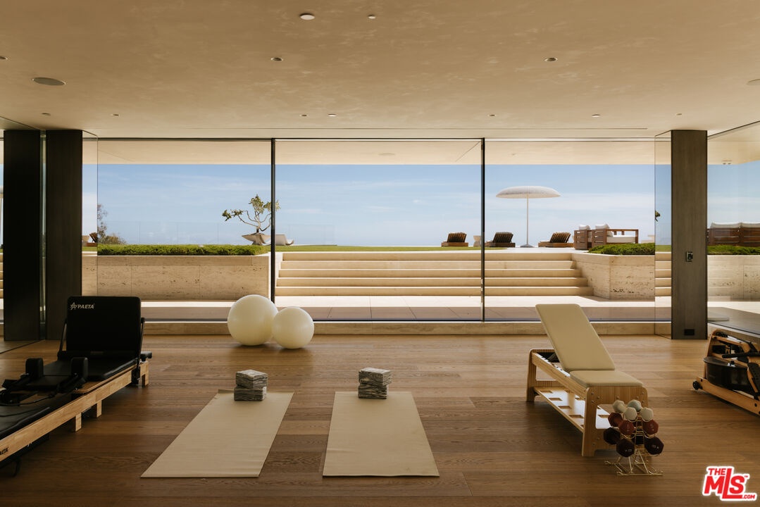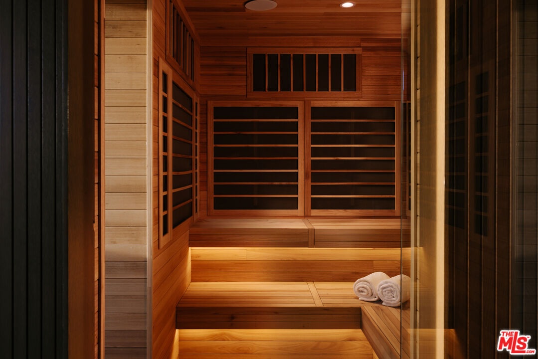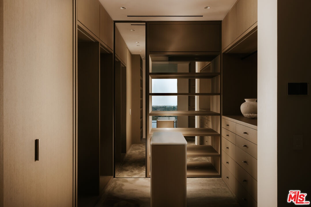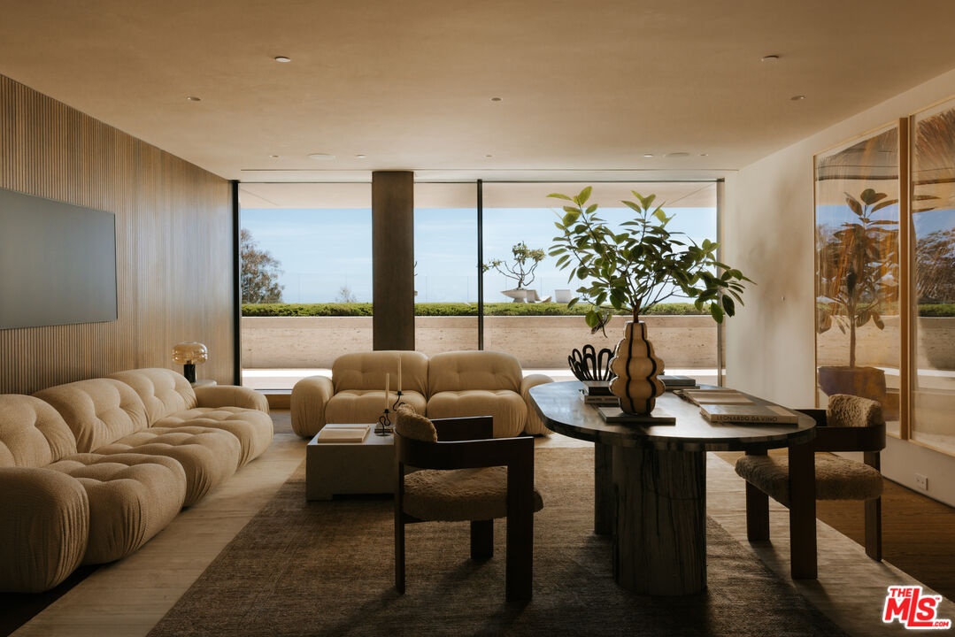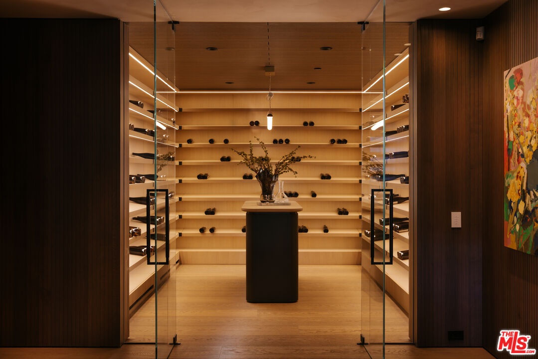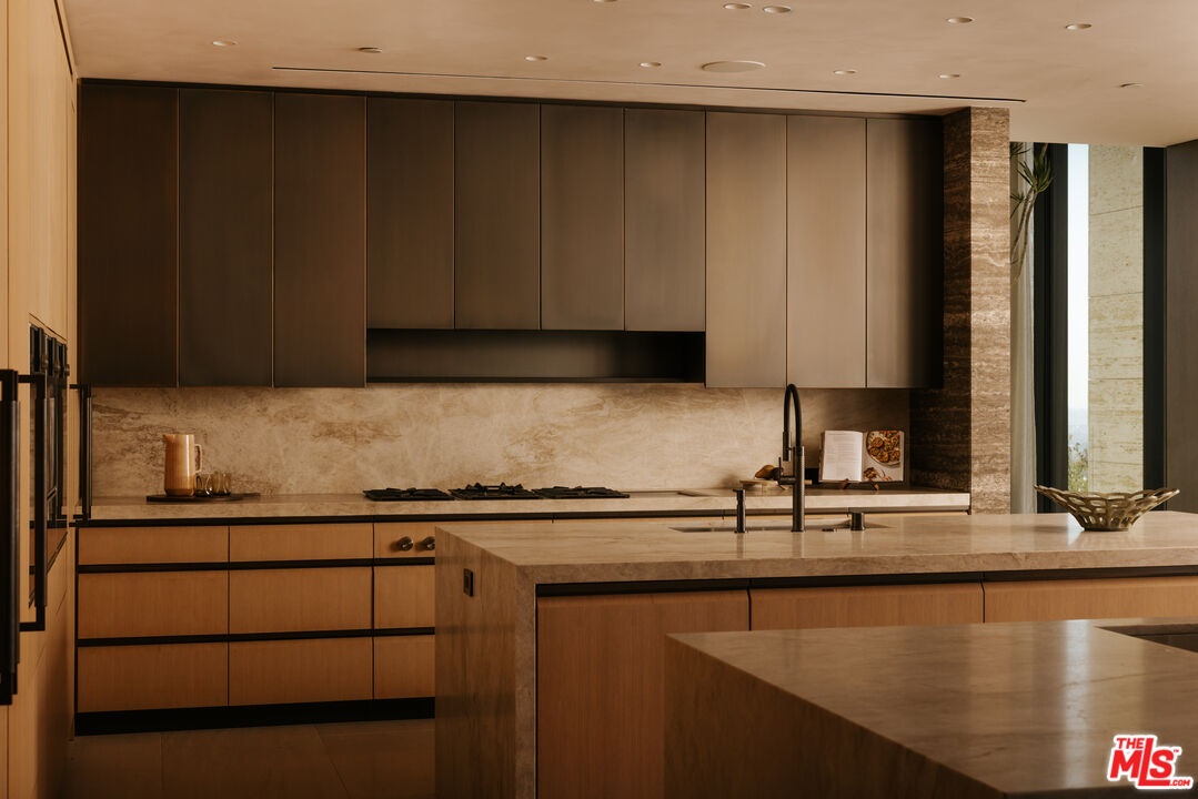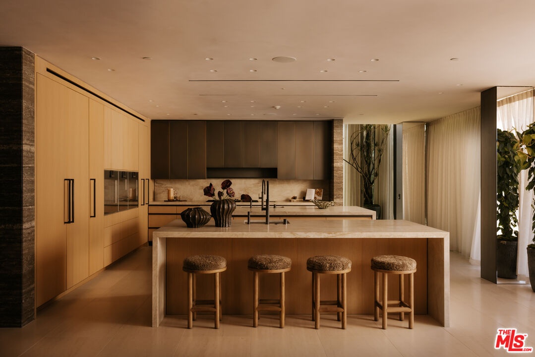 Sempre Vista. Representing one of the most compelling offerings in Los Angeles' luxury market in years. With over 12,500 square feet of Thomas Juul-Hansen architecture on 2 private acres in prime Brentwood. Juul-Hansen, the Danish architect, designed Sempre Vista as a monumental rectangular frame clad in sandblasted Alabastrino travertine, a finish chosen for its depth, warmth, and the way it holds light across the face of the building. Executed by Roderick Builders with the precision the design demanded, nearly 19-foot seamless motorized glass panels dissolve every wall, and the columns recede so completely at the lower level that the entire structure appears to float above the hillside. The views run coast to canyon, ocean to skyline, without a single interruption. Six bedroom suites, ten baths, elevator, double-height formal living room and foyer, Gaggenau kitchen with two oversized islands and custom oak cabinetry with recessed brass hardware, glass-enclosed temperature-controlled wine cellar, three-tier theater, massage room, sauna with a dedicated view window, gym, Gessi fixtures throughout, Cohiba granite primary bath with a cold plunge, steam shower, and in-shower TV, Calacatta Lincoln marble secondary bath, four-car garage, infinity pool curving with the natural contour of the hillside, and, at the crown, a 2,500+ square foot rooftop terrace with floating travertine decking and seamless glass railings where the Pacific, the mountains, and the entire Los Angeles basin unfold simultaneously. Situated on one of Brentwood's most coveted and private hillside addresses, less than five minutes from Sunset Boulevard, with views that reach from the ocean to downtown that few properties in this city achieve.