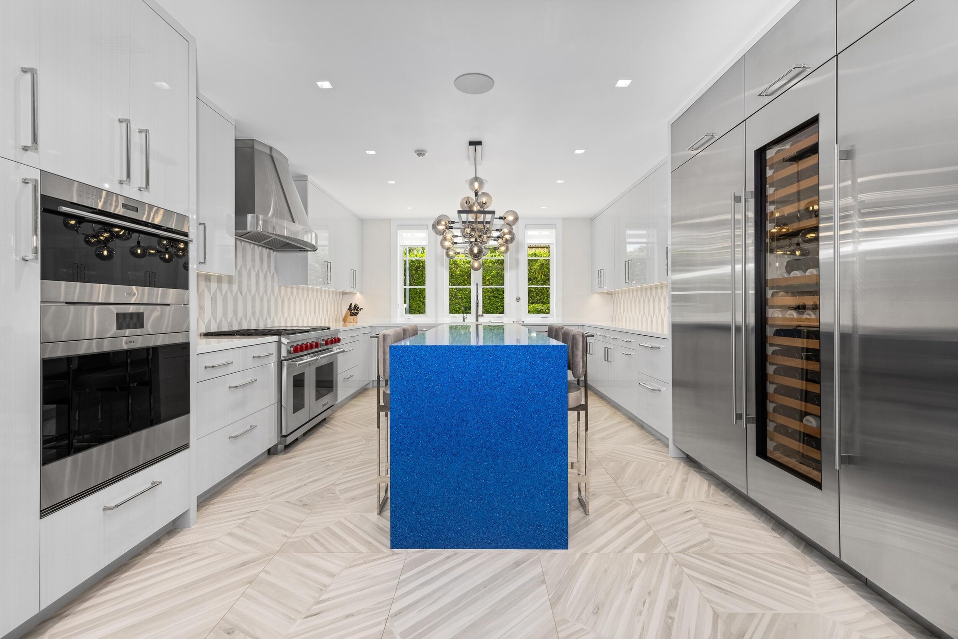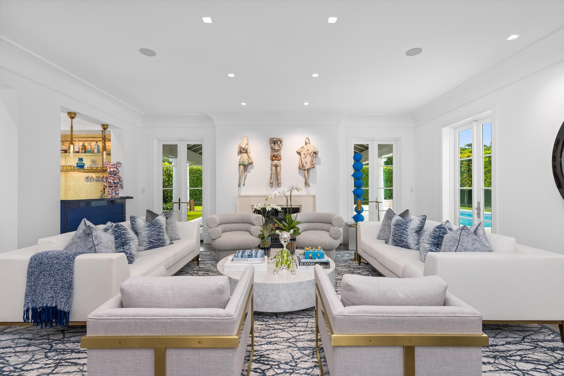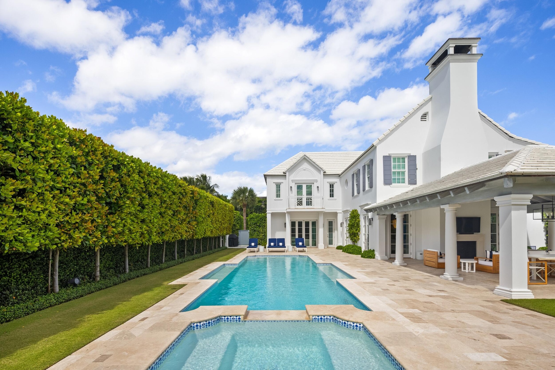 Stunning and pristine 5BR/5.2BA Georgian home beautifully renovated in 2022 with 7,500+/- square feet. Gorgeous and sophisticated marble and hardwood finishes throughout. Thoughtful interior design by Kenny Alpert. Immaculate landscaping surrounding fabulous backyard with resort-style pool, spa, and oversized loggia with fireplace. Living room features fireplace and stunning bar with wine fridges. Top-of-the-line eat-in kitchen with chef's island, wine fridge, and beautiful detailing. Sunny library with built-in shelving. Soaring ceilings, impact windows, and generator. Fantastic Estate Section location with beach access.