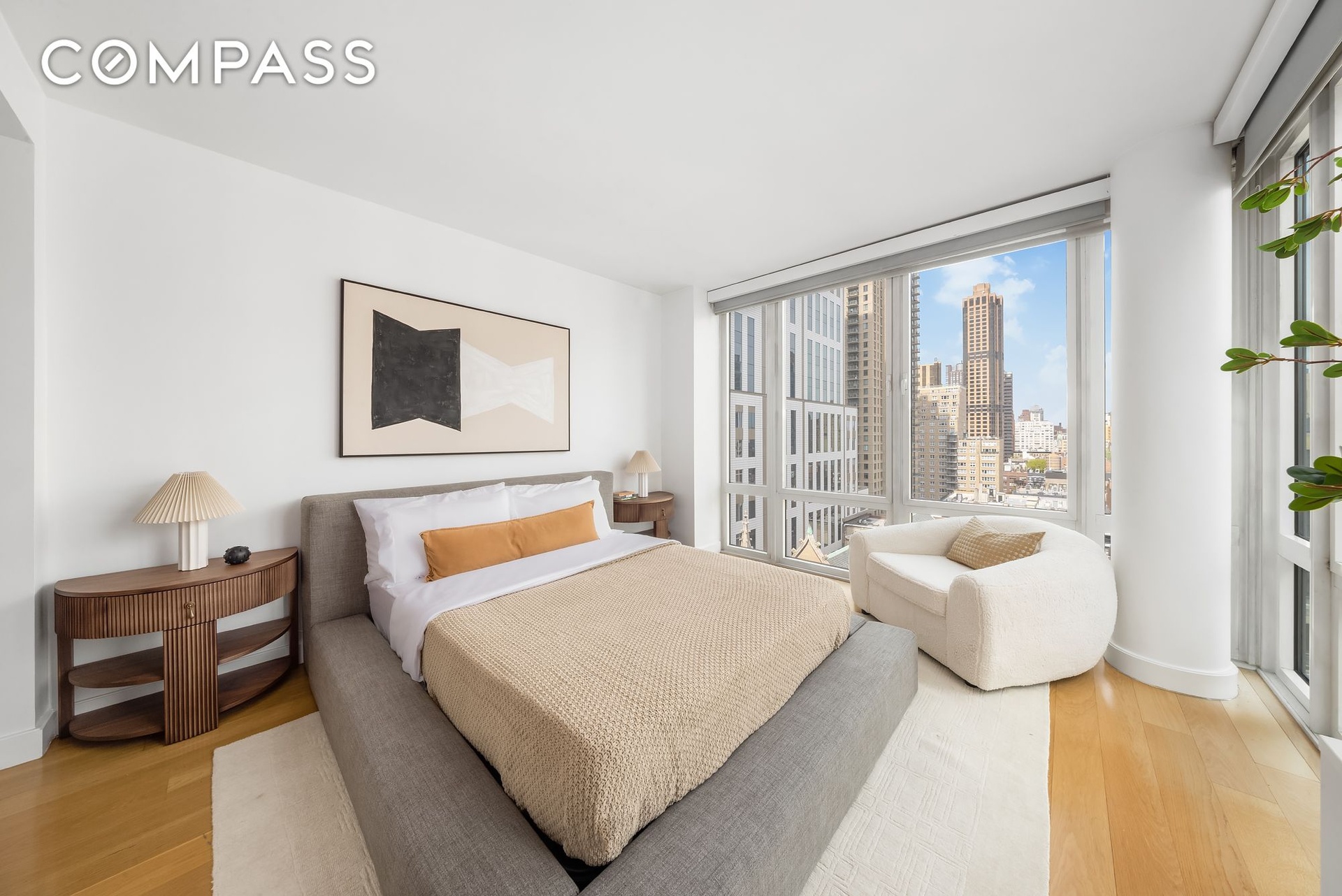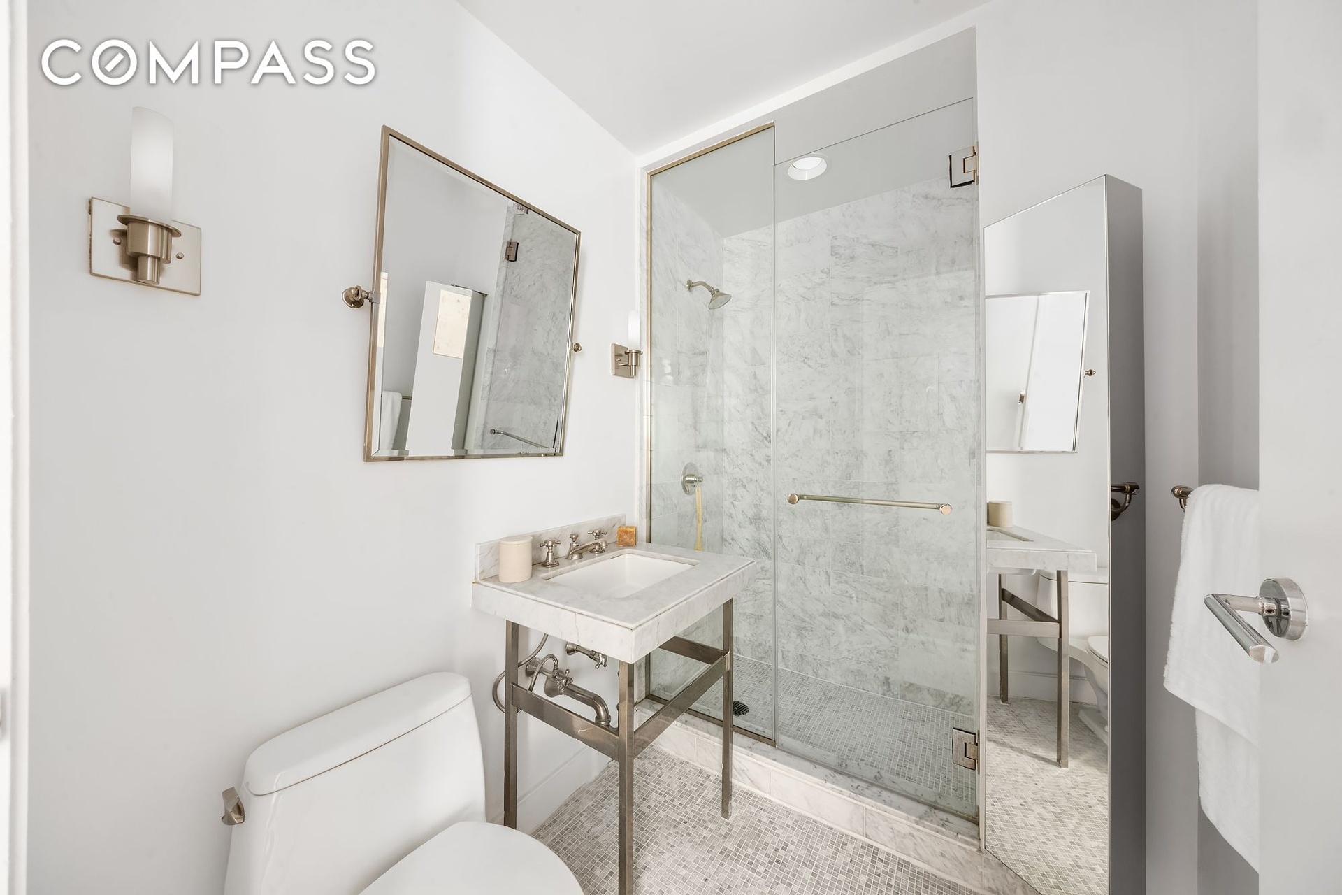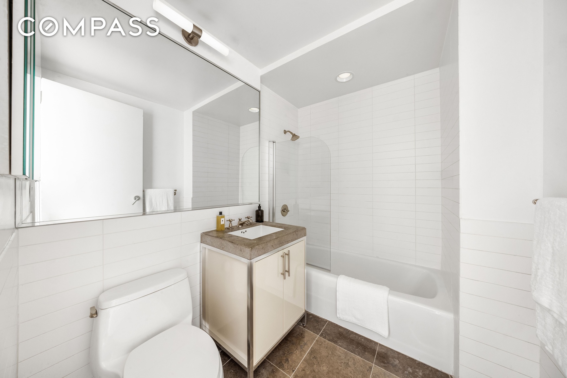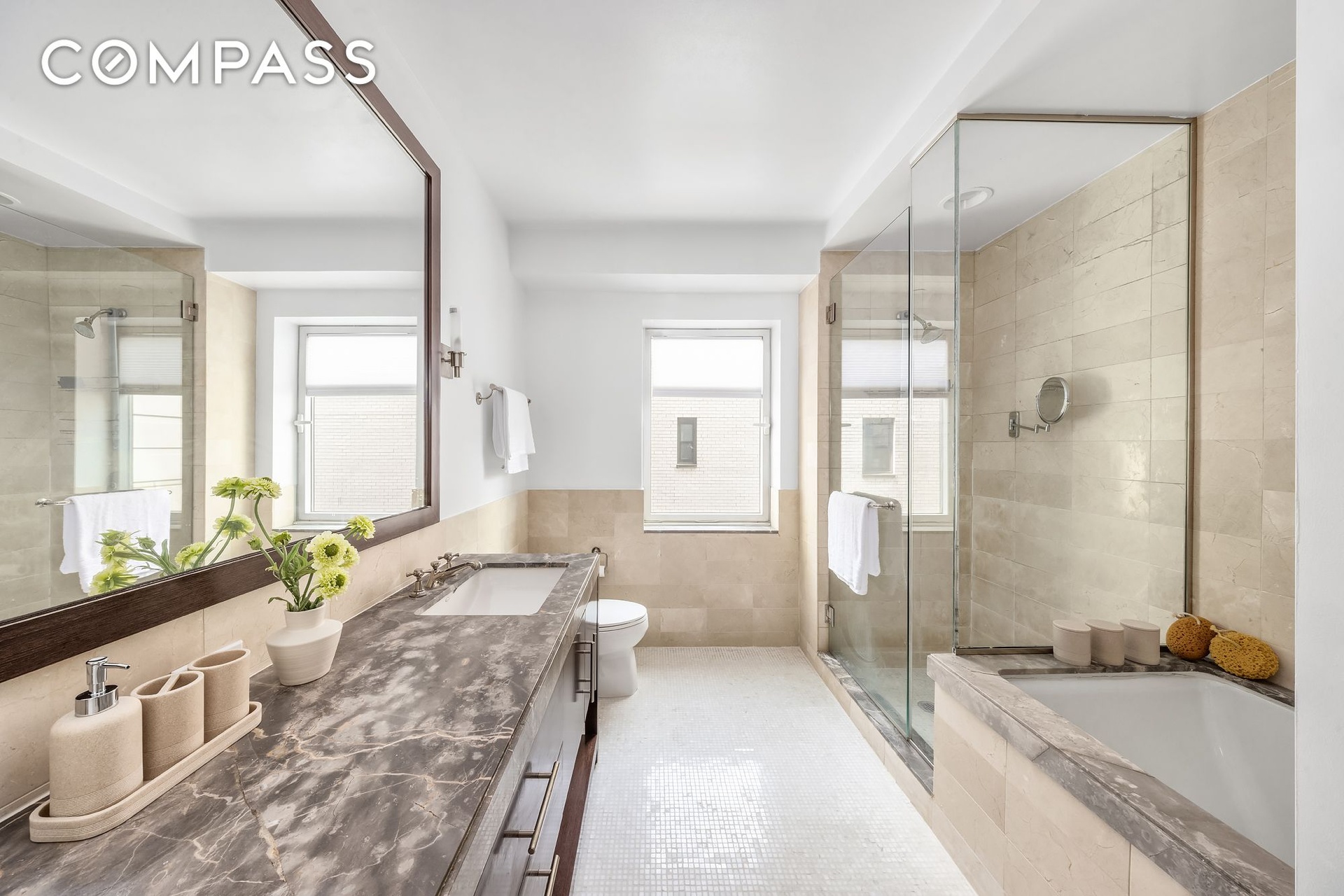Privately positioned in its own wing, the primary suite enjoys southeastern exposure and abundant natural light through floor-to-ceiling windows, offering open city and skyline views. The suite is appointed with two walk-in closets and a spacious en-suite bath, complete with mosaic tilework, double vanities, radiant heated floors, a soaking tub, and a separate glass-enclosed shower.