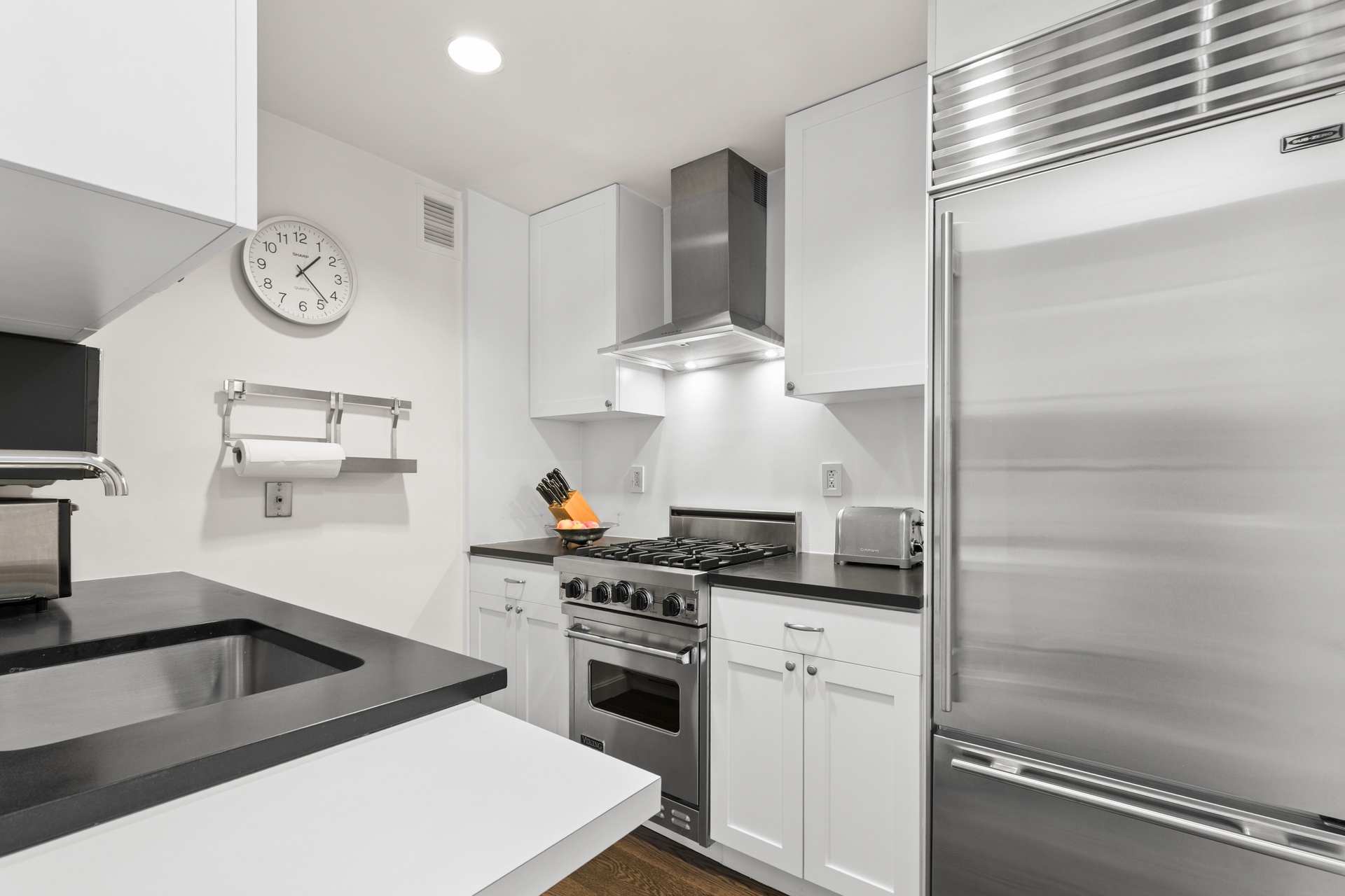 The kitchen is thoughtfully appointed with premium appliances, including a Viking range and Sub-Zero refrigerator, complemented by generous storage and workspace.
