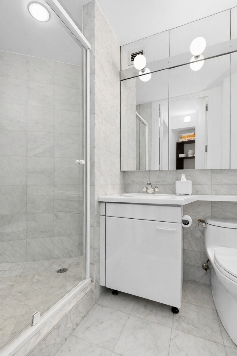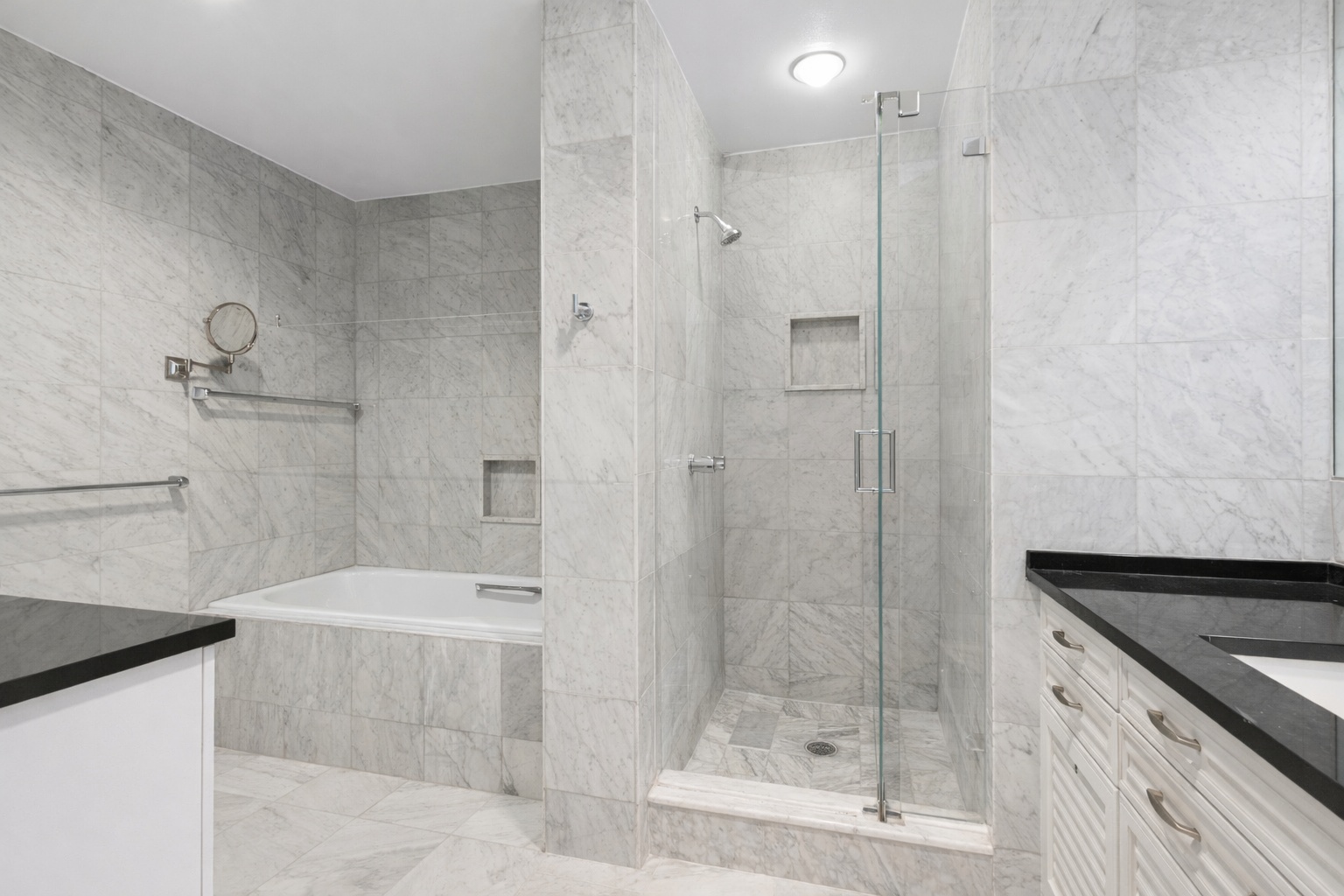 The primary suite is a serene retreat, featuring ample proportions, abundant closet space, and a luxurious five-fixture marble bathroom. The second bedroom also offers an en-suite bath and excellent storage, providing both comfort and privacy.