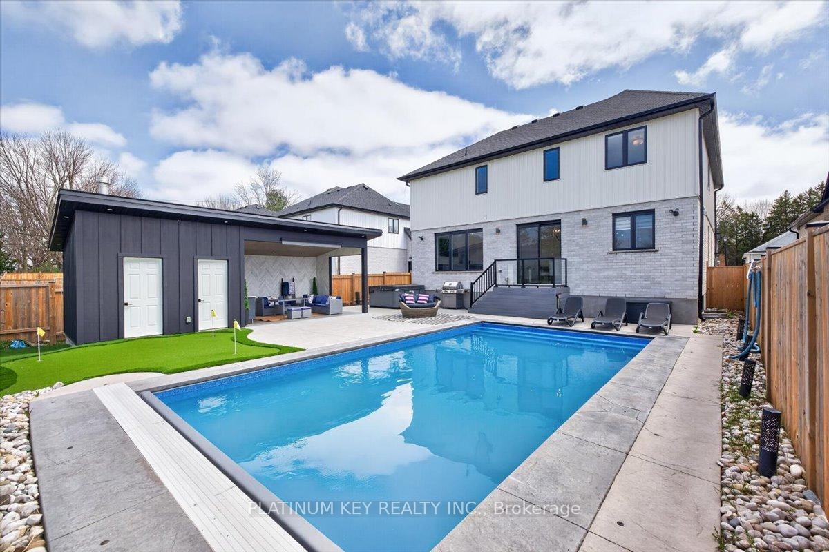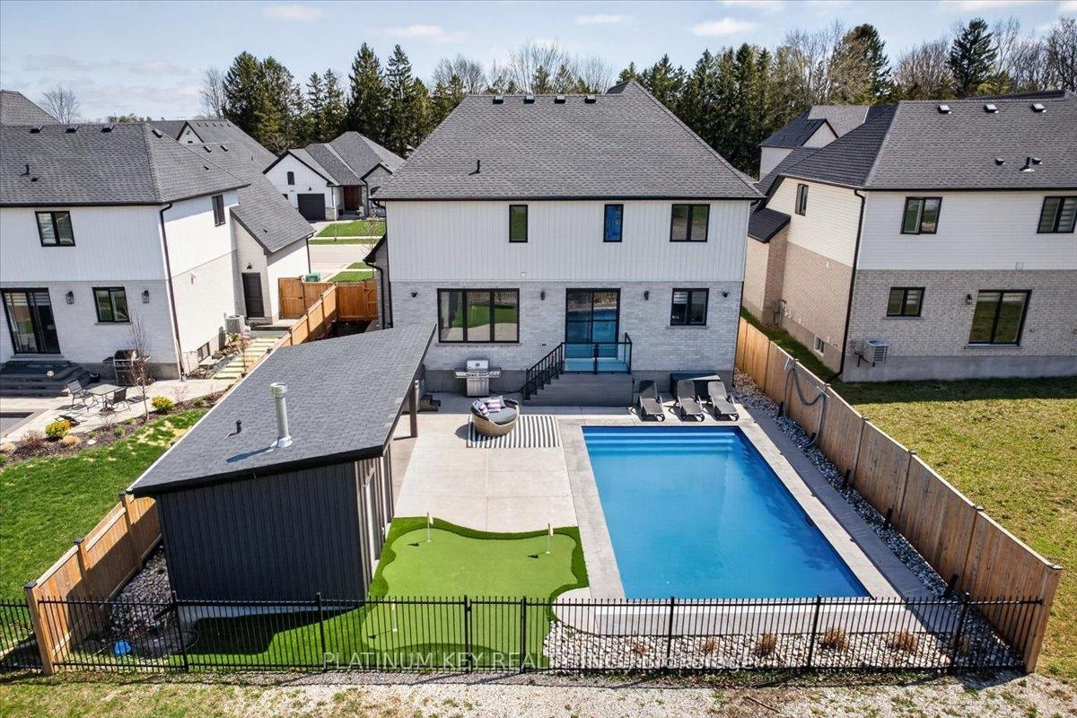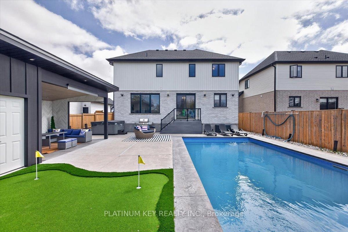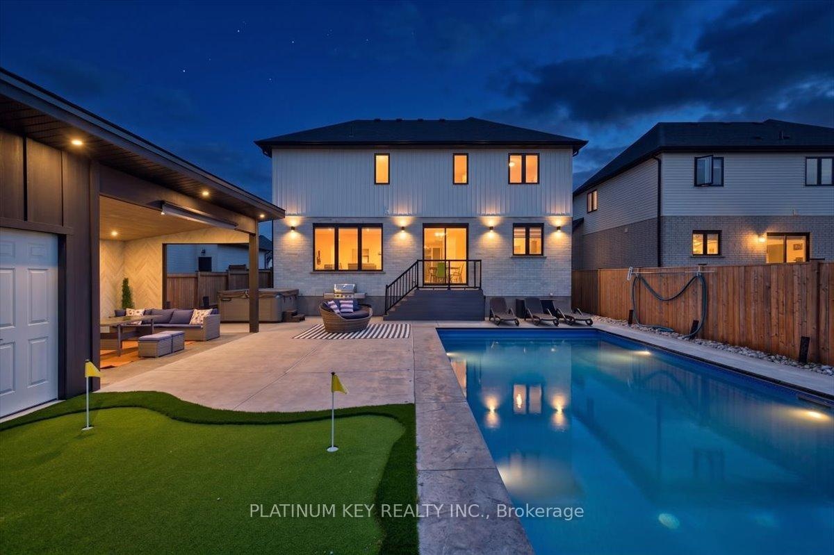 Located in Talbotville Meadows, this stunning 2 storey home offers 4+1 bedrooms, 4.5 bathrooms, a double car garage, and a premium lot backing directly onto Talbotville Optimist Heritage Park. The property features an in-ground heated saltwater pool and a pool cabana, ideal for indoor and outdoor living. The main floor includes a bright front office, formal dining room, and a butler's pantry with wet bar, beverage fridge, and walk-in pantry connecting through to the kitchen. The kitchen features a large centre island, quartz countertops, tile backsplash, pot filler, and apron-front sink, along with a spacious eating area and walkout to the backyard. The open-concept living room features a fireplace and is designed for both everyday living and entertaining. A 2-piece powder room and a dedicated laundry room with storage and access to the garage complete the main level. Upstairs, the primary bedroom is set behind double doors and includes a 5-piece ensuite with double vanities, soaker tub, and walk-in shower, along with a large walk-in closet (10'9" x 10'). The second bedroom features its own private 3-piece ensuite, while two additional bedrooms share a 5-piece main bathroom. The fully finished lower level adds a fifth bedroom, 3-piece bathroom, and a large rec room offering flexible use. The backyard is designed for both relaxation and entertaining, with a heated saltwater pool, electronic safety cover, concrete patio, gas BBQ hookup, and a private putting green. The pool cabana is fully serviced with plumbing and electricity and includes a covered seating area with wet bar, change room with bathroom, and a dedicated pump room. Talbotville Meadows is a growing community offering a quieter setting just minutes from St. Thomas and a short drive to London, with convenient access to Highway 401. The neighbourhood is known for its newer homes, access to green space, and proximity to parks like Talbotville Optimist Heritage Park.