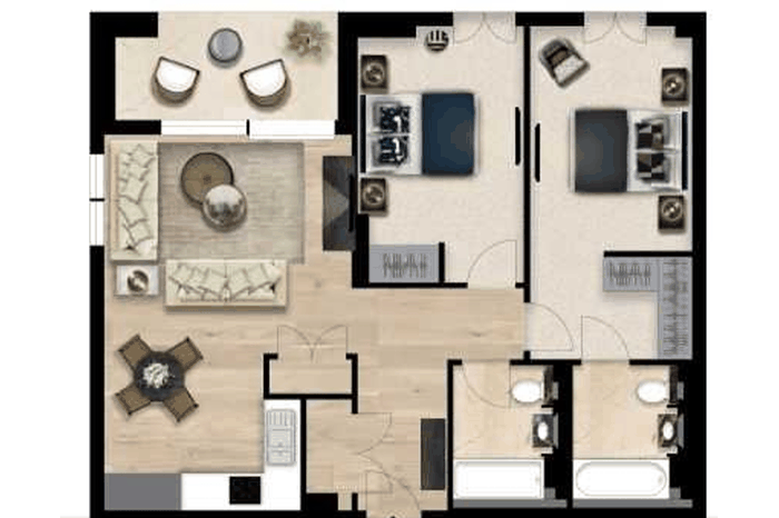 Both bedrooms are generously sized doubles, with the principal bedroom benefiting from a modern en-suite bathroom, alongside a separate family bathroom. The apartment also benefits from comfort cooling throughout, ensuring year-round comfort.
