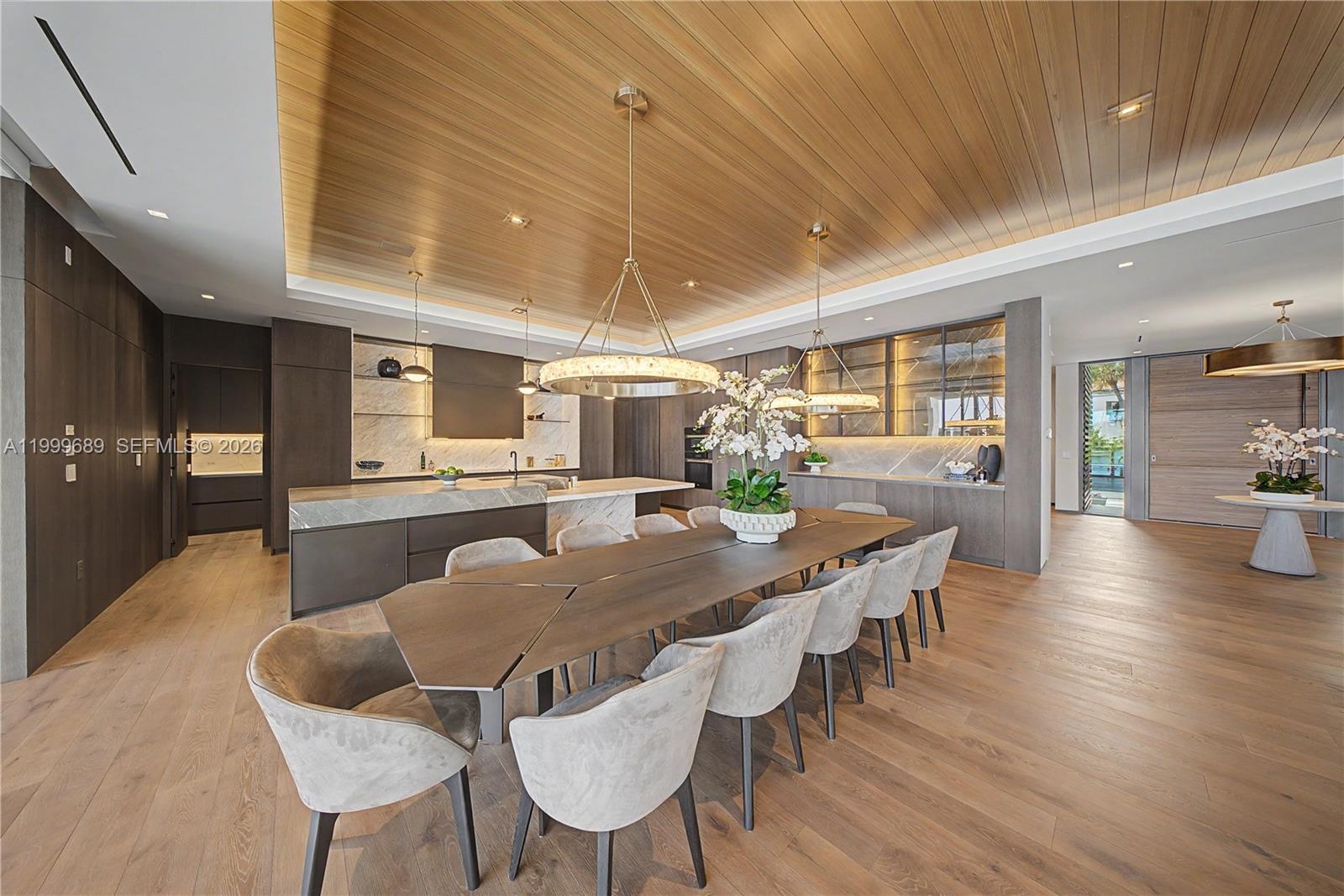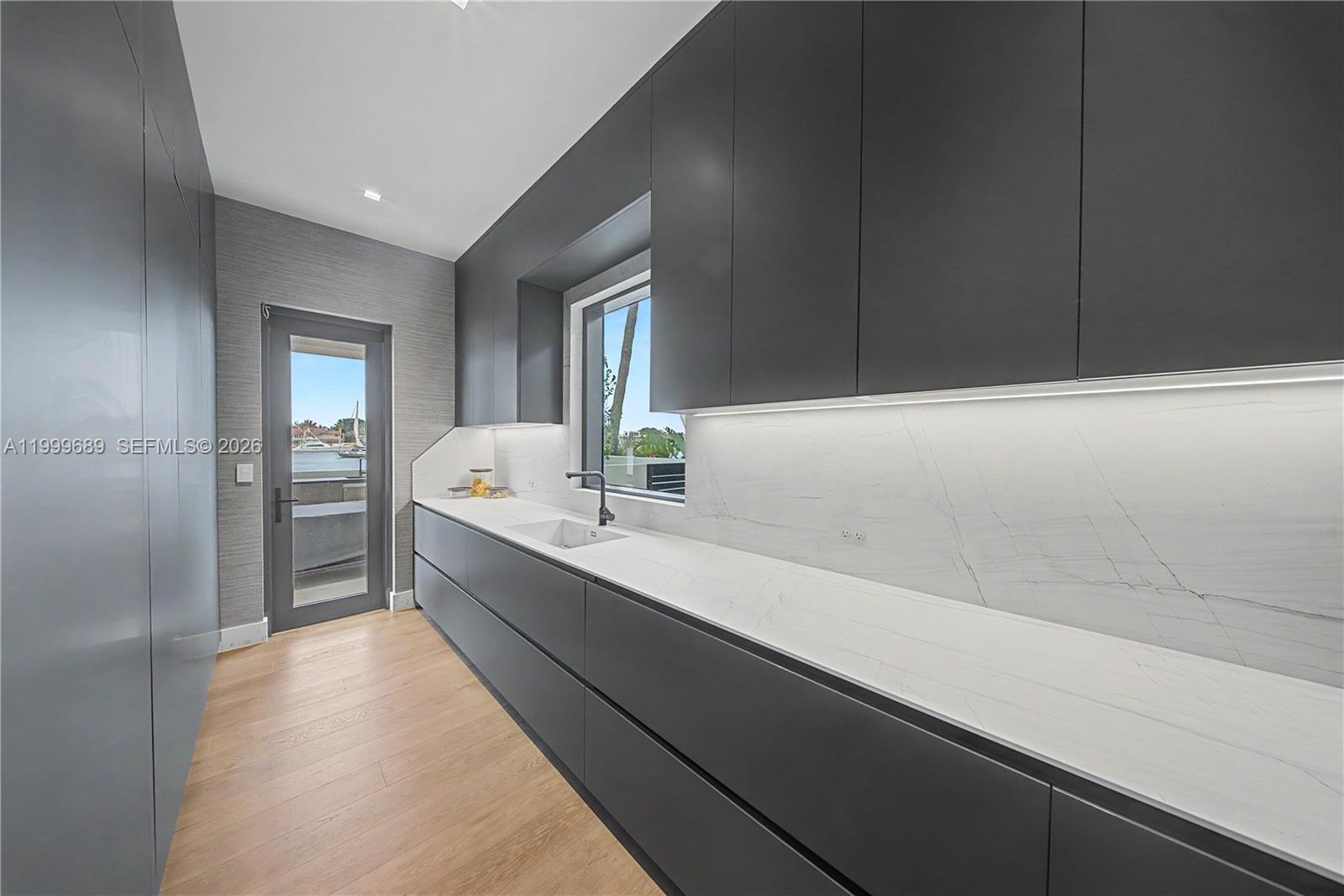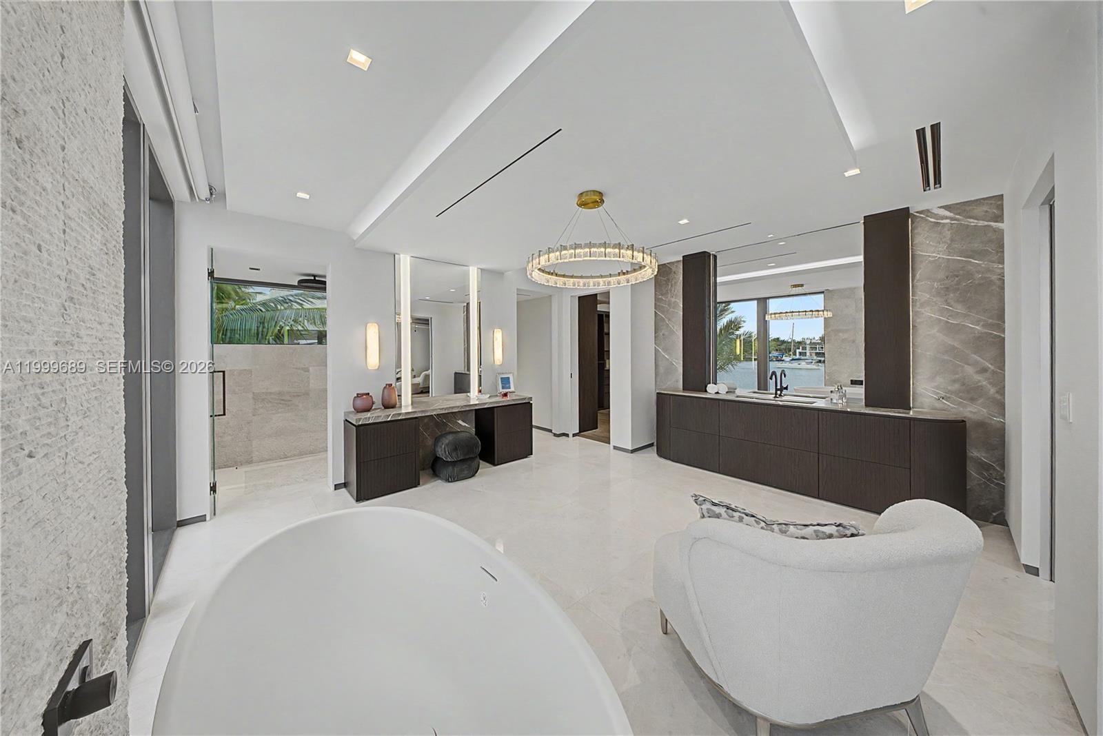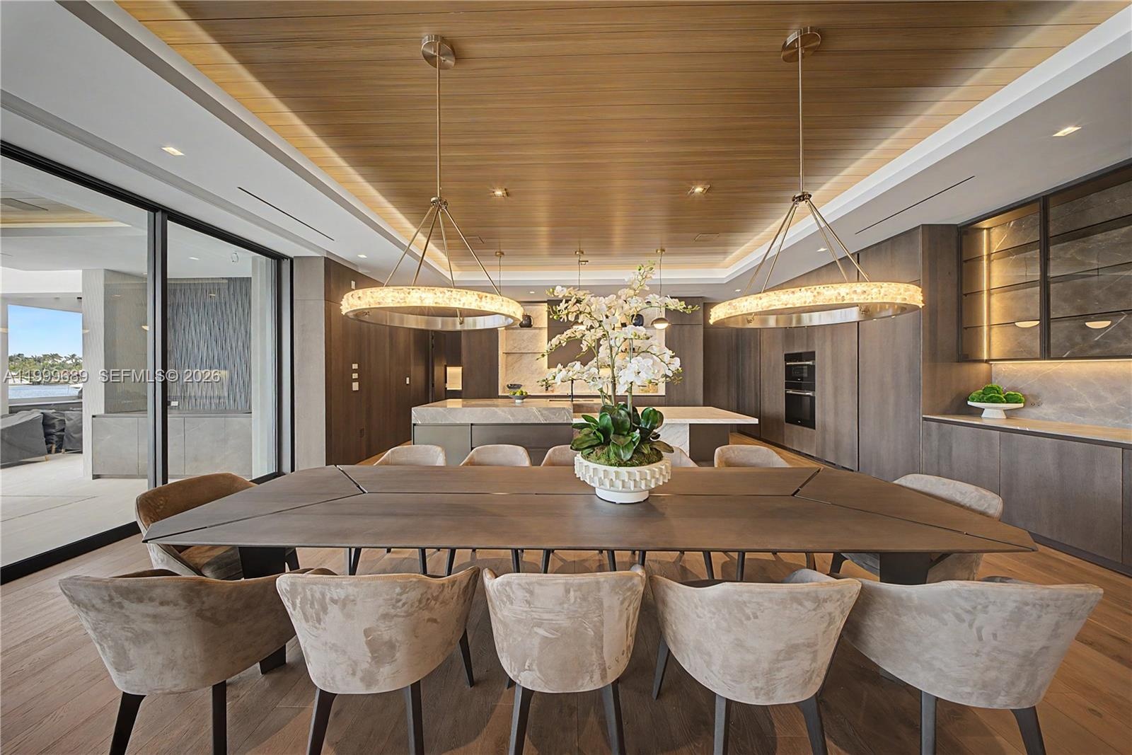 Spanning three levels, the residence features exquisite Italian finishes, walls of glass, and a seamless indoor-outdoor flow. The home includes seven bedrooms, a wellness center and gym, an executive office, and a primary suite positioned to capture sweeping water views, with a spacious his and her bathrooms oriented to the waterfront.