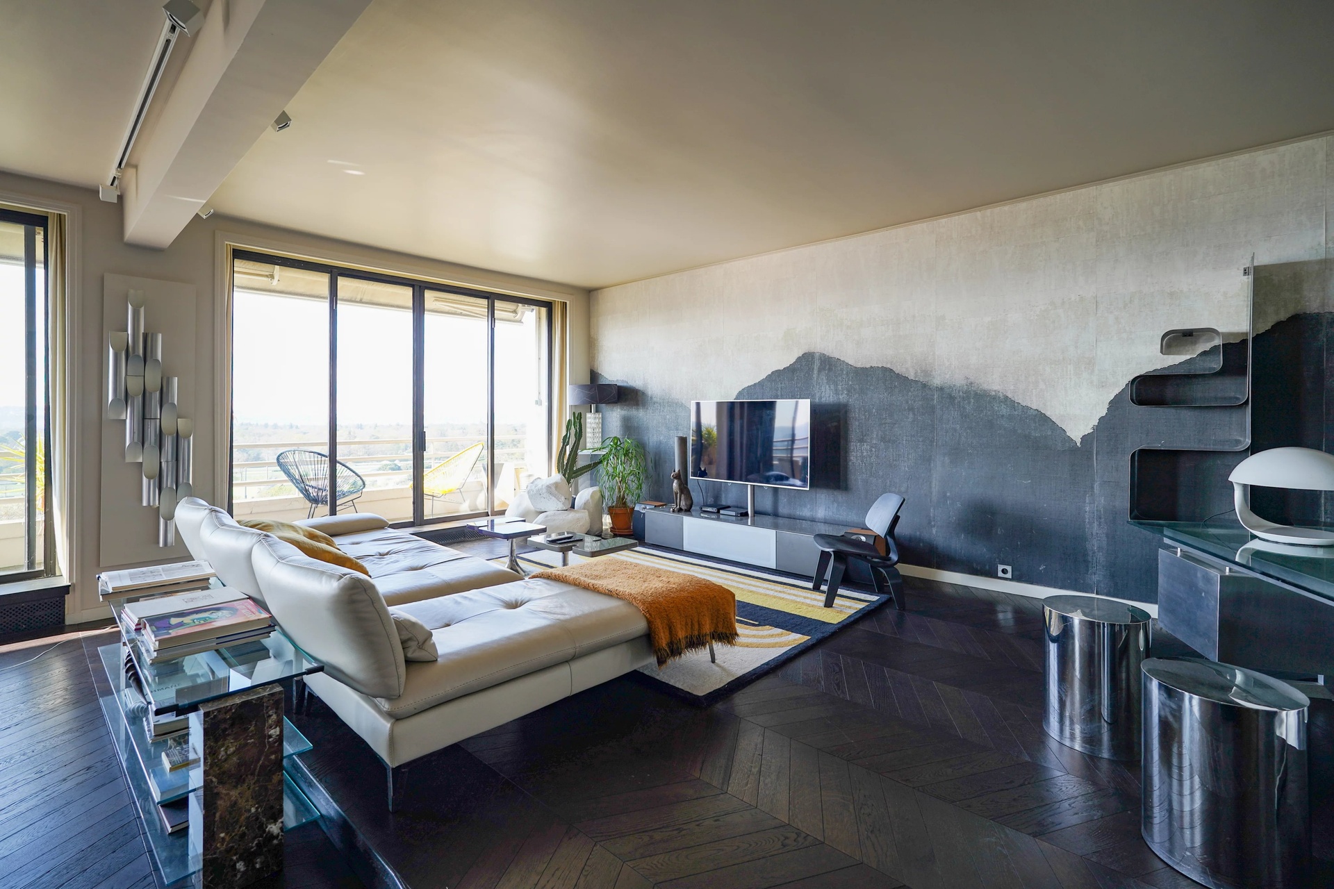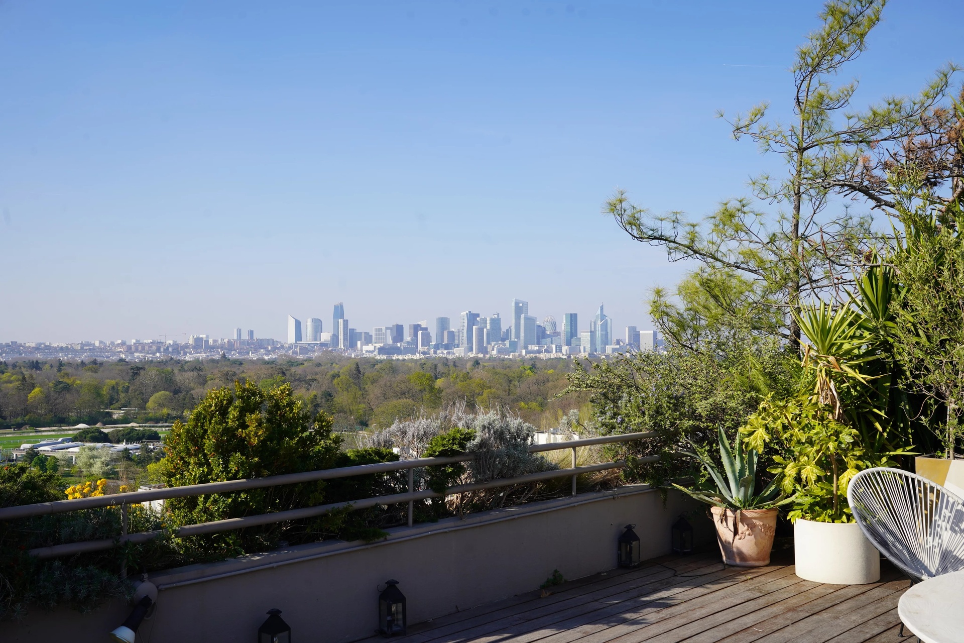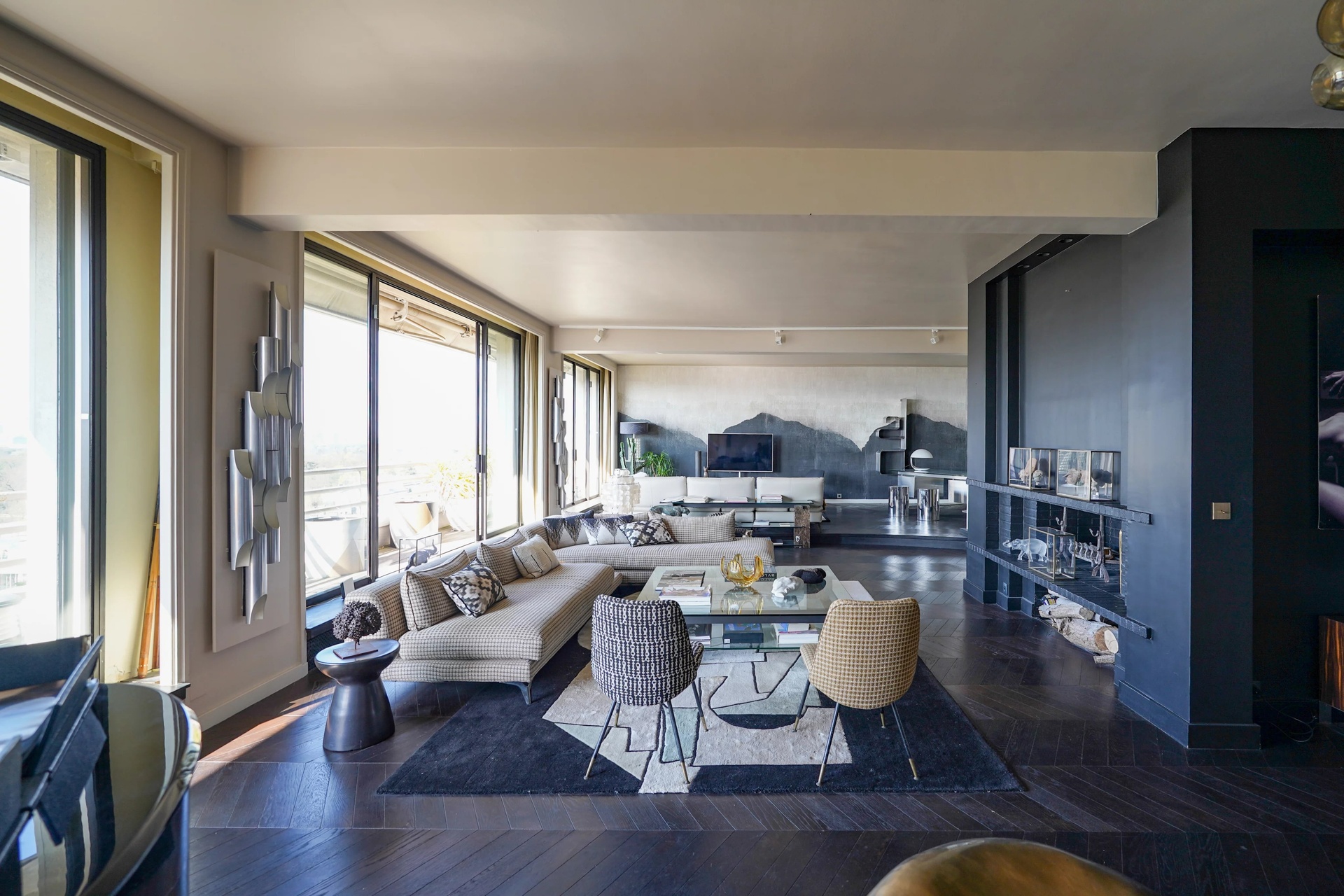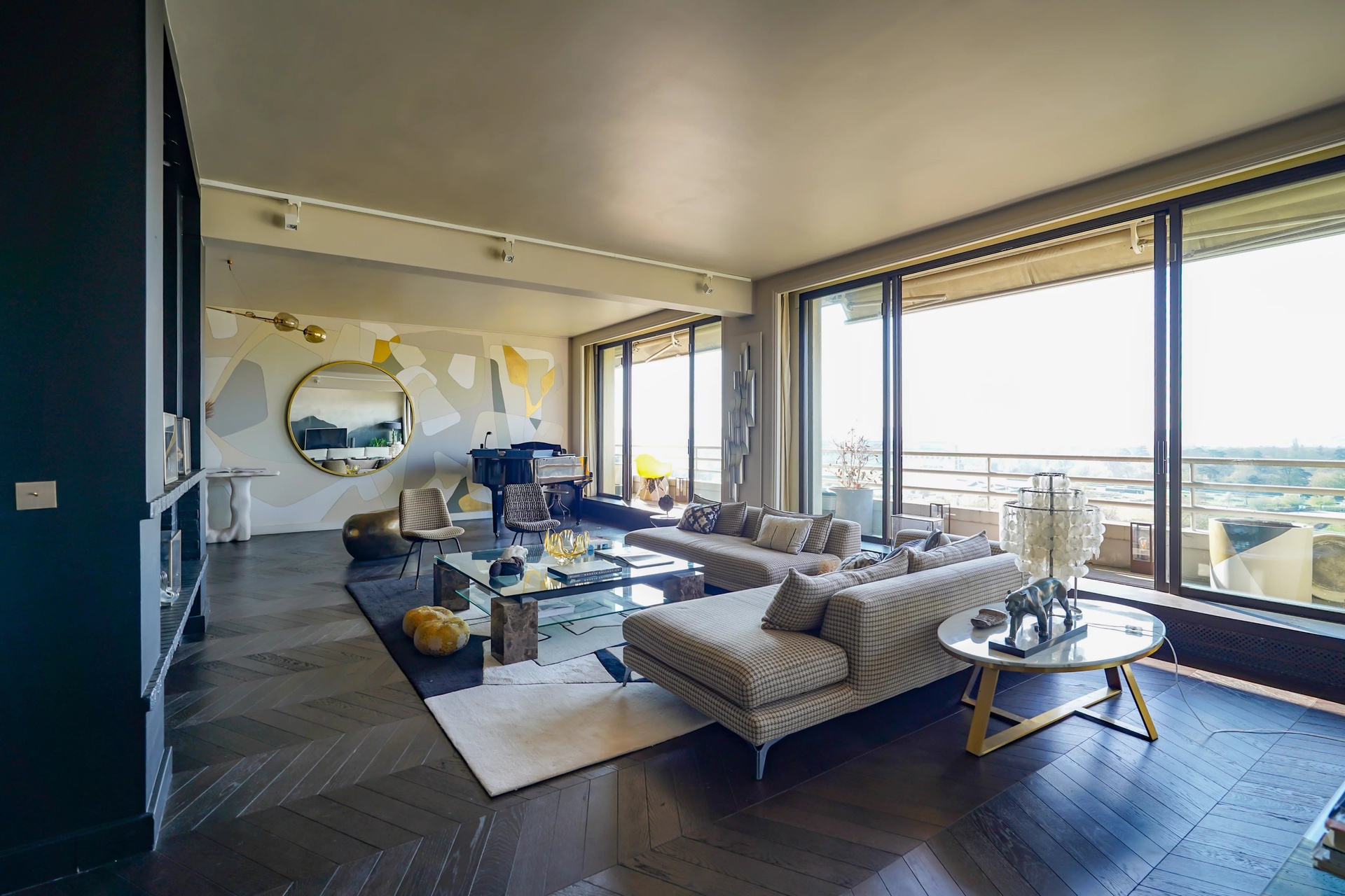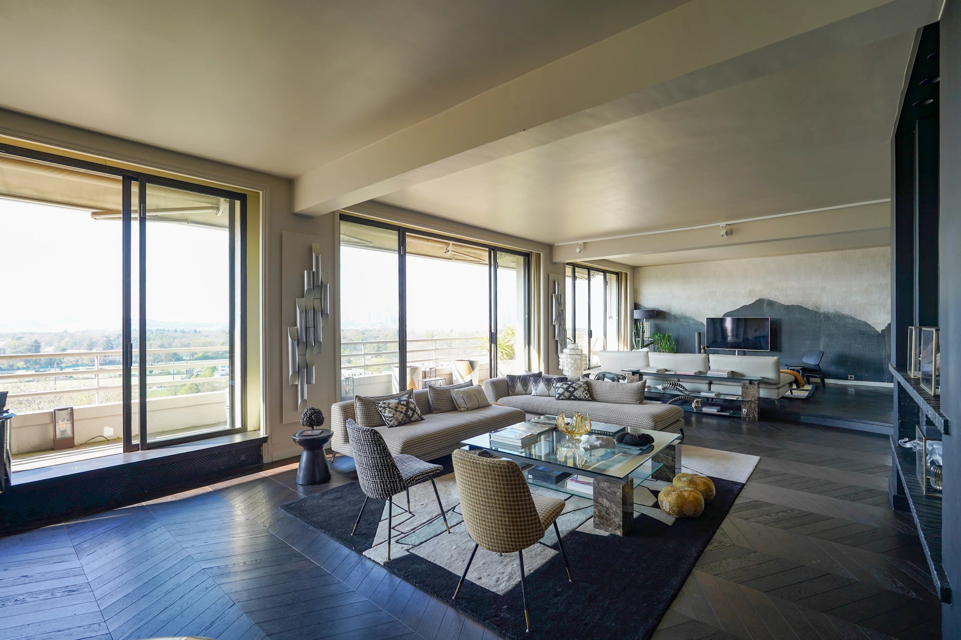 Extended by a remarkable set of terraces totaling over 150 m2, this unique property offers a rare living experience, between sky and city, with spectacular panoramic views of La Défense, the Longchamp racecourse, and the Eiffel Tower.