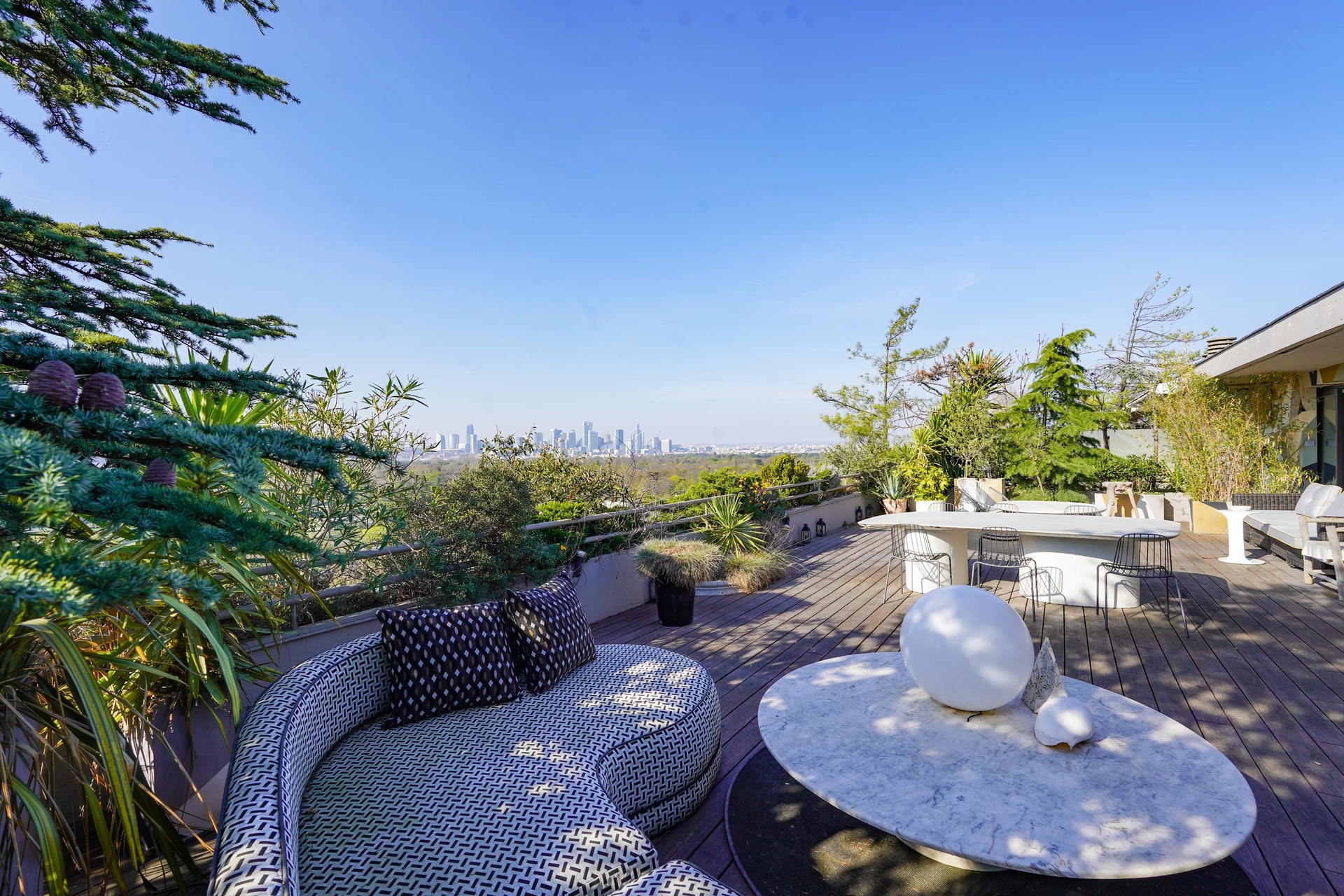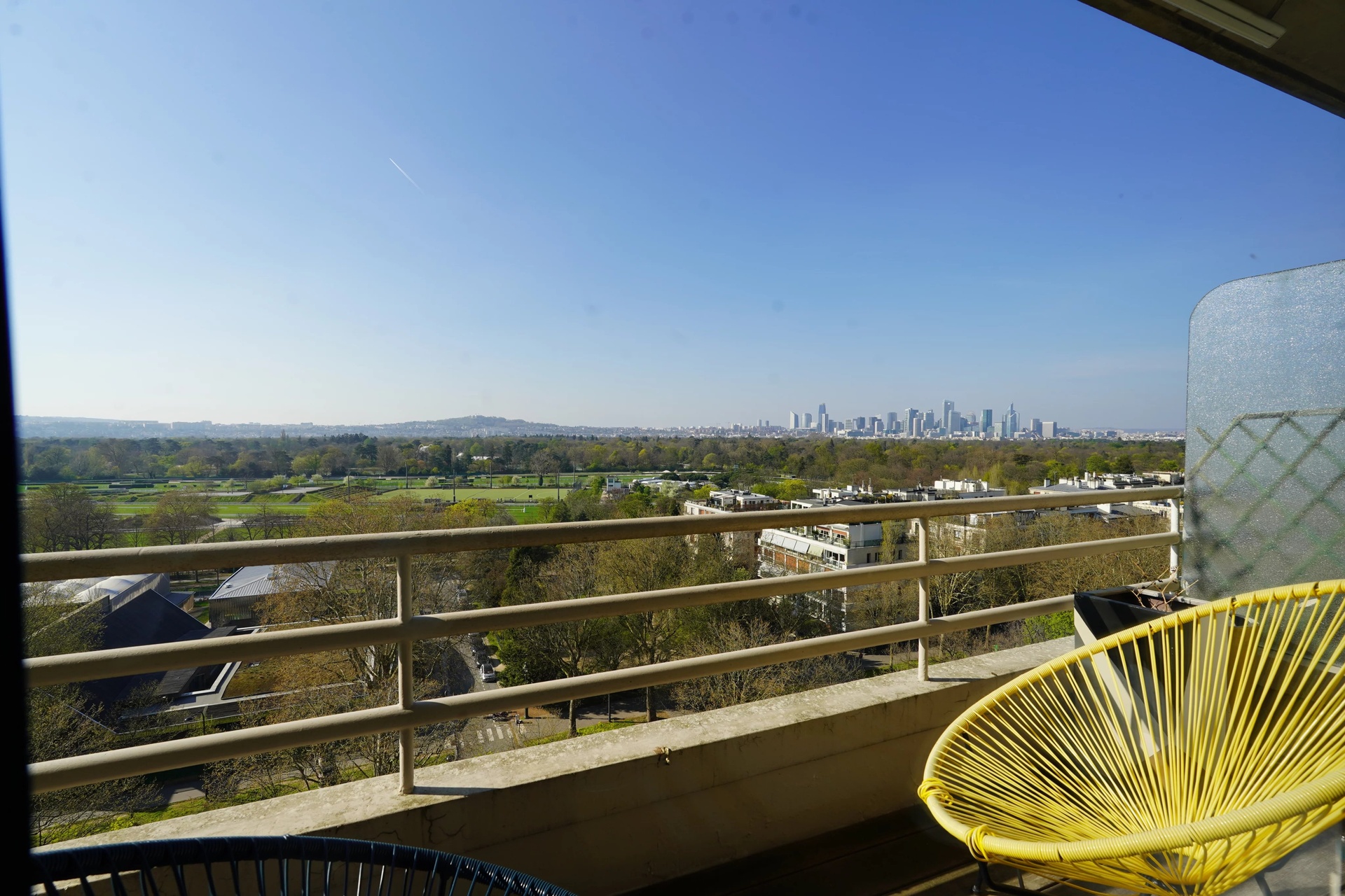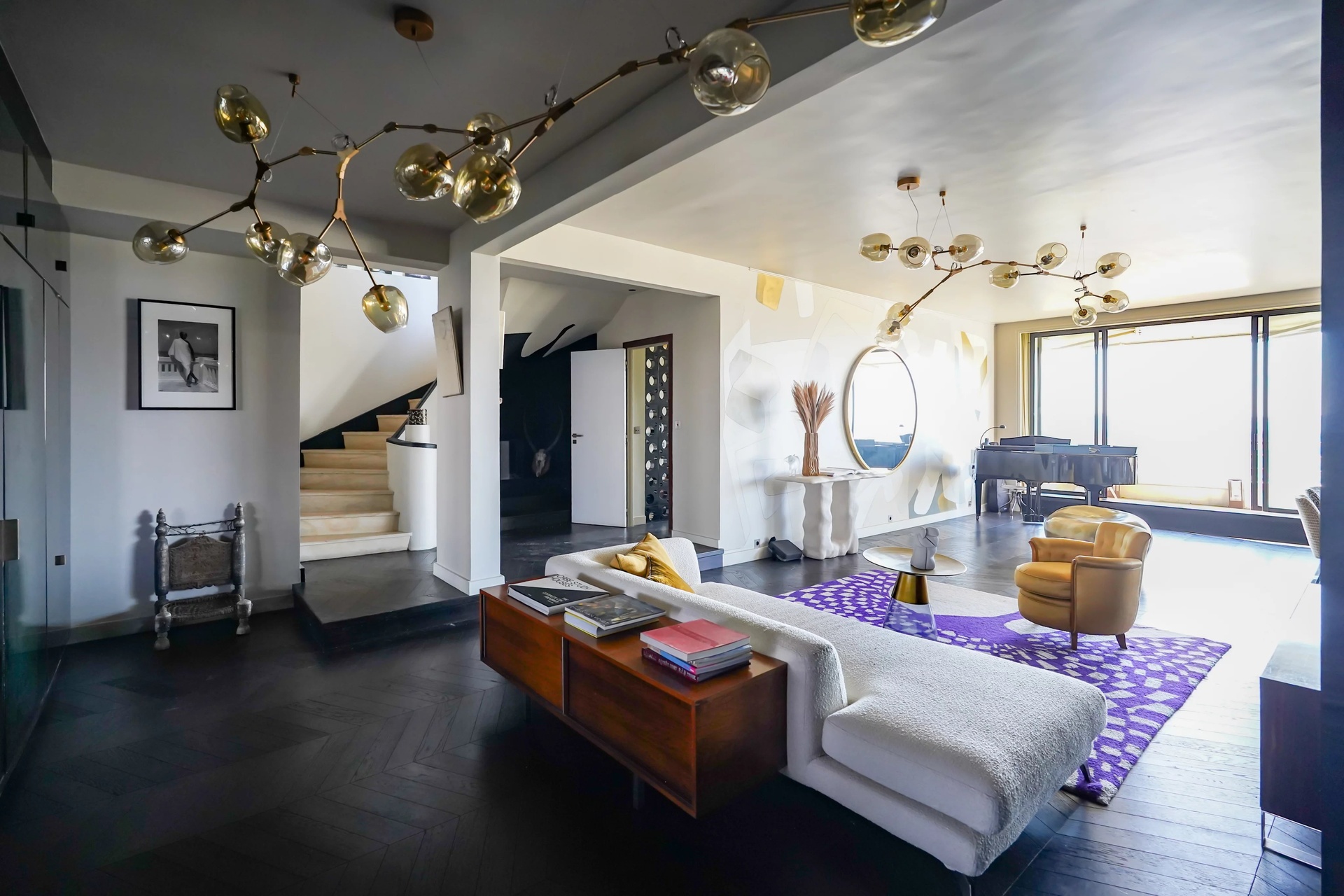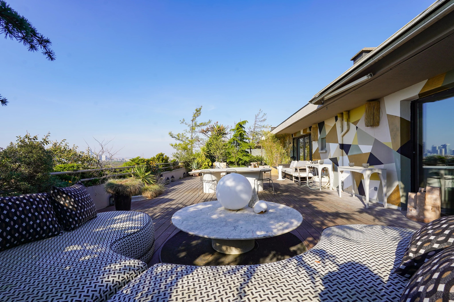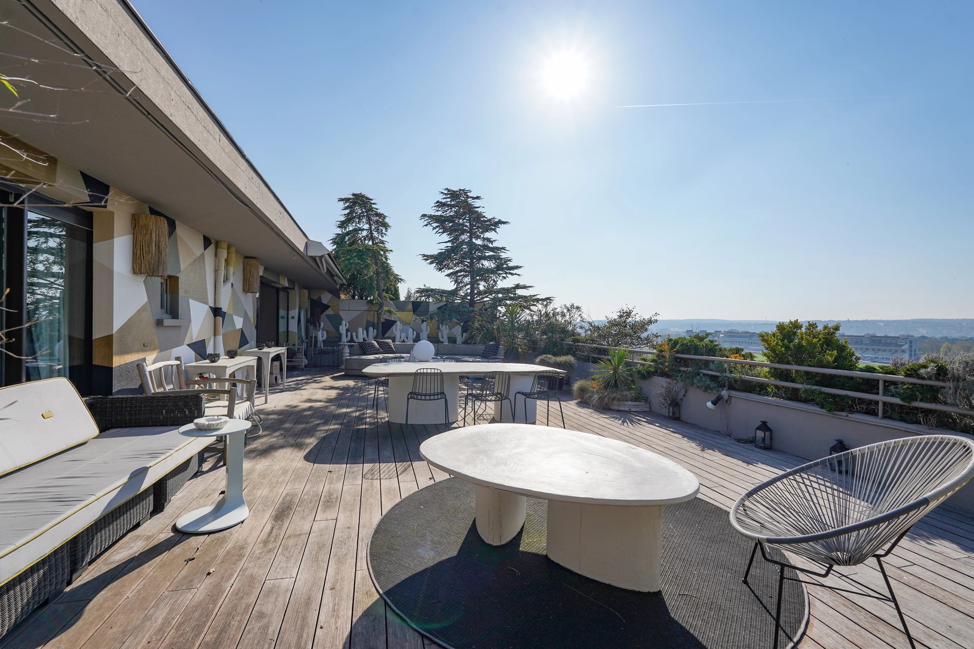 Extended by a remarkable set of terraces totaling over 150 m2, this unique property offers a rare living experience, between sky and city, with spectacular panoramic views of La Défense, the Longchamp racecourse, and the Eiffel Tower.