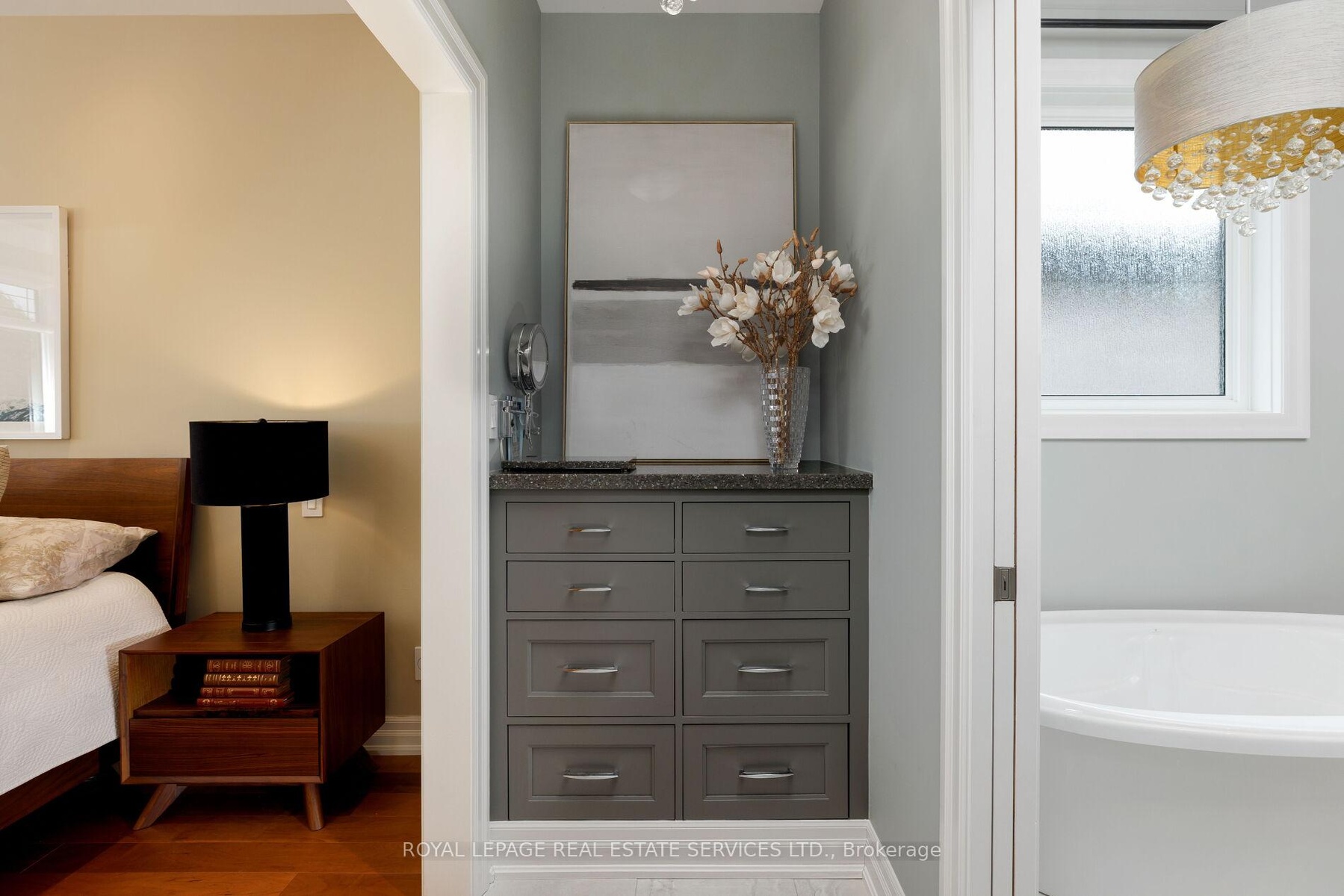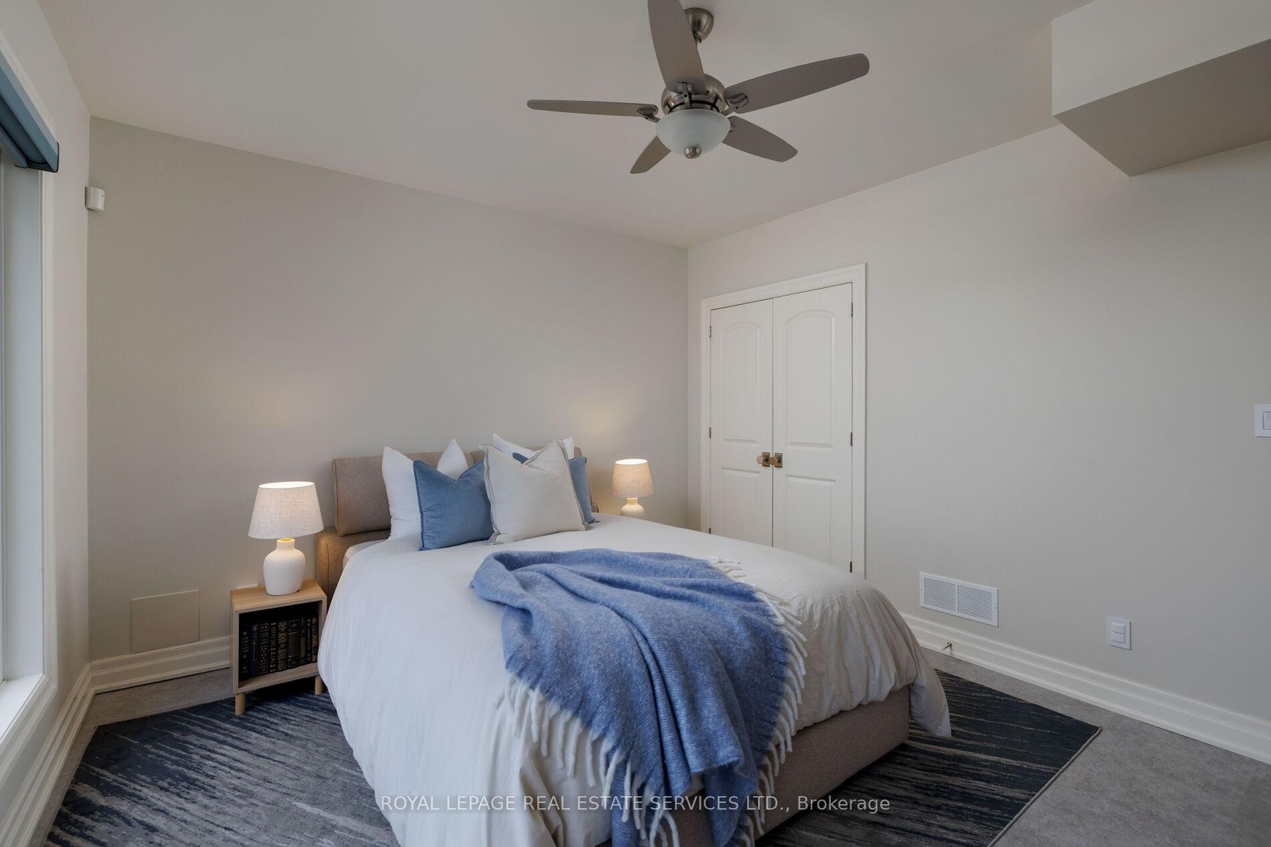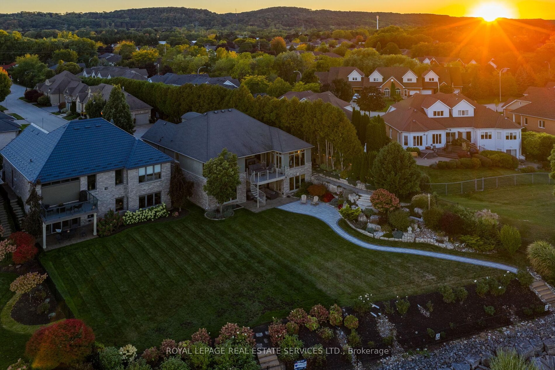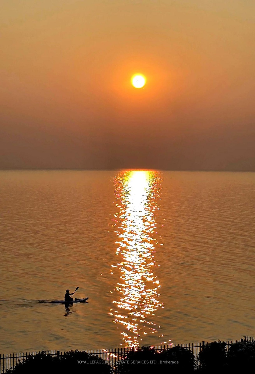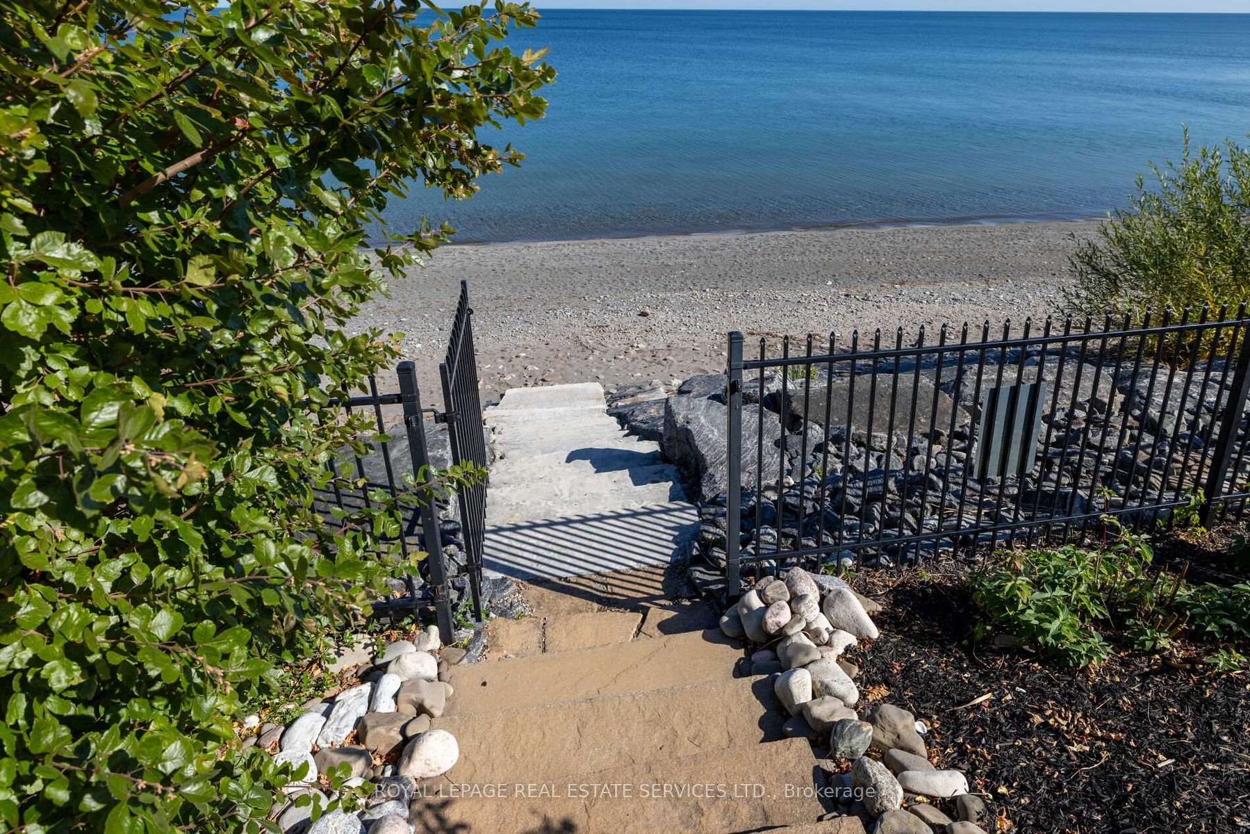 An upscale lakeside lifestyle awaits in Lakeland Landing, an exclusive detached bungalow condominium community in Grimsby on the shores of Lake Ontario. Siding onto a grove of trees, this stunning 4-bedroom residence with a beautifully finished walkout basement is one of only four estates with direct beach access. Enjoy nearby waterfront parks, the Grimsby Waterfront Trail, Forty Mile Creek Park, Foran's Marina, the shops and restaurants of Grimsby on the Lake, and wineries and fine dining minutes away with easy QEW access at the gateway to Ontario's Wine Country. Outstanding curb appeal and magnificent professional landscaping with a cobblestone driveway accommodating 6 cars, extensive use of armour stone, and the backyard is a private lakeside retreat with two terraces designed to capture sweeping water views. Custom-built by DeHaan Homes, the home showcases exceptional craftsmanship with 9 and 10-ft ceilings, engineered hardwood floors, custom millwork, designer lighting, and expansive windows capturing breathtaking lake views. The open-concept main level features functional, elegant living spaces, a great room with a quartzite feature wall, 2-sided gas fireplace and exceptional lake views, a chef's kitchen with upgraded quartz counters, 10' waterfall island with a breakfast bar, and premium appliances, and a dining area with a walkout to a covered terrace with a fireplace, frameless glass railings and a custom wrought iron staircase to the lower terrace. The primary suite offers lake views and a luxurious 5-piece ensuite. The walkout lower level includes a renovated family room with a fireplace, a second kitchen with Thermador appliances, a home theatre, two bedrooms, a 4-piece bath and terrace access. Recent upgrades (2022-2025) include renovated living spaces, updated kitchens, EV charger rough-in, electrical upgrades, and security window film.