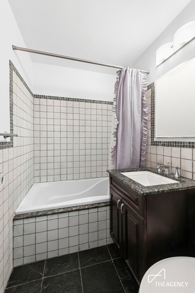 The primary suite is a serene retreat with western exposures. The secondary bedrooms are generously proportioned. Both bathrooms have been meticulously renovated with stone tilework and marble countertops, creating a spa-like experience. Additional highlights include multiple oversized closets, including two walk-ins, providing exceptional storage rarely found in rental offerings.