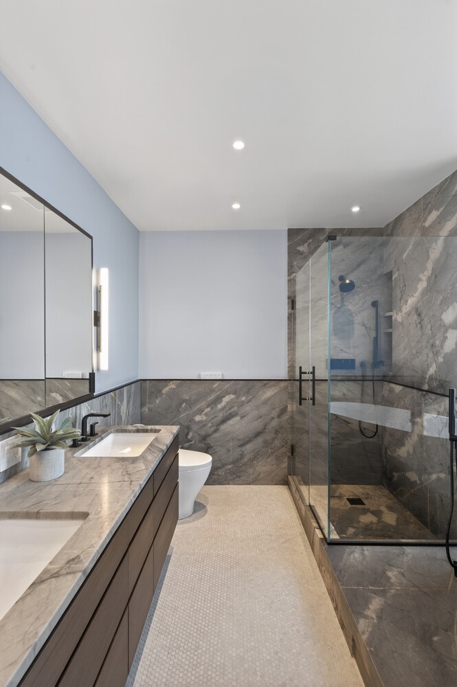The primary suite is a serene retreat with a walk-in closet and a spa-like bath clad in Quartzite Celeste from BAS Stone, complemented by a custom Wenge wood vanity. Two additional bedrooms are well-proportioned and thoughtfully positioned for privacy and flexibility.