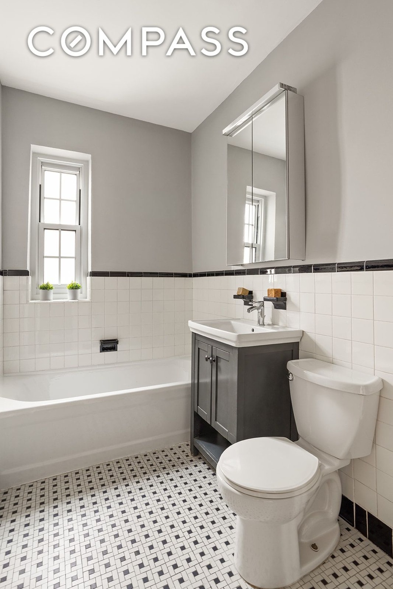 You'll immediately be charmed by all the pre-war details: high ceilings, original hardwood floors, and oversized windows that look out to the shared common garden. The spacious sunken living room and dining platform provide the perfect backdrop for entertaining or relaxing. The thoughtfully updated eat-in kitchen boasts stainless steel appliances, generous cabinetry, and a layout that makes cooking a delight. The well-proportioned bedroom, with plenty of room for a king sized bed, offers a peaceful haven with ample closet space.