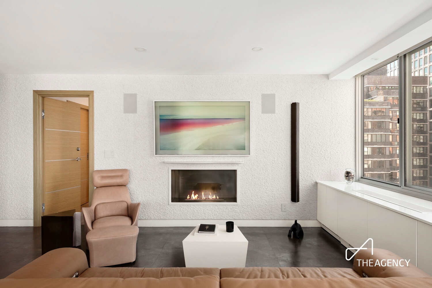 The expansive corner living and dining space is both dramatic and inviting, anchored by a sleek ventless fireplace and framed by panoramic exposures overlooking the architectural landmarks of Lincoln Center and Fordham University. Natural light pours in throughout the day, enhancing the home's sense of scale and quiet sophistication.