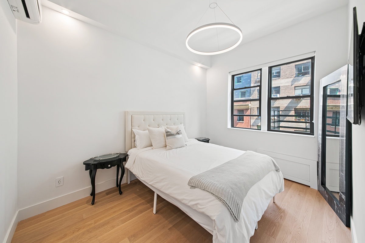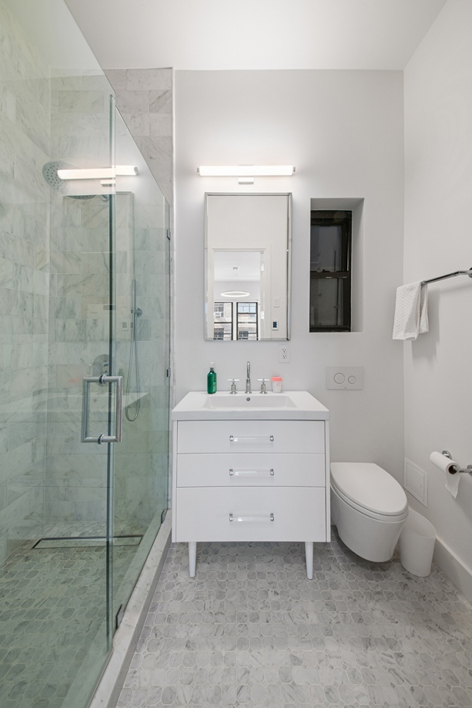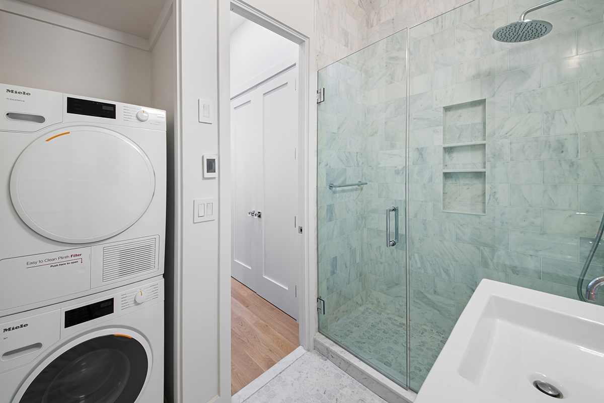No expense was spared in the renovation that combines optimal efficiency with flawless taste. The gourmet kitchen is a chef's dream, featuring sleek Glassos countertops, ample custom cabinetry, and brand new appliances, including a paneled Liebherr refrigerator, a Bertazzoni range, and a Bosch dishwasher. The spacious bedroom is a peaceful retreat with built-in custom closets. The spa-like bathroom is outfitted floor to ceiling with Carrara marble and features heated floors and a stacked Miele washer/dryer.