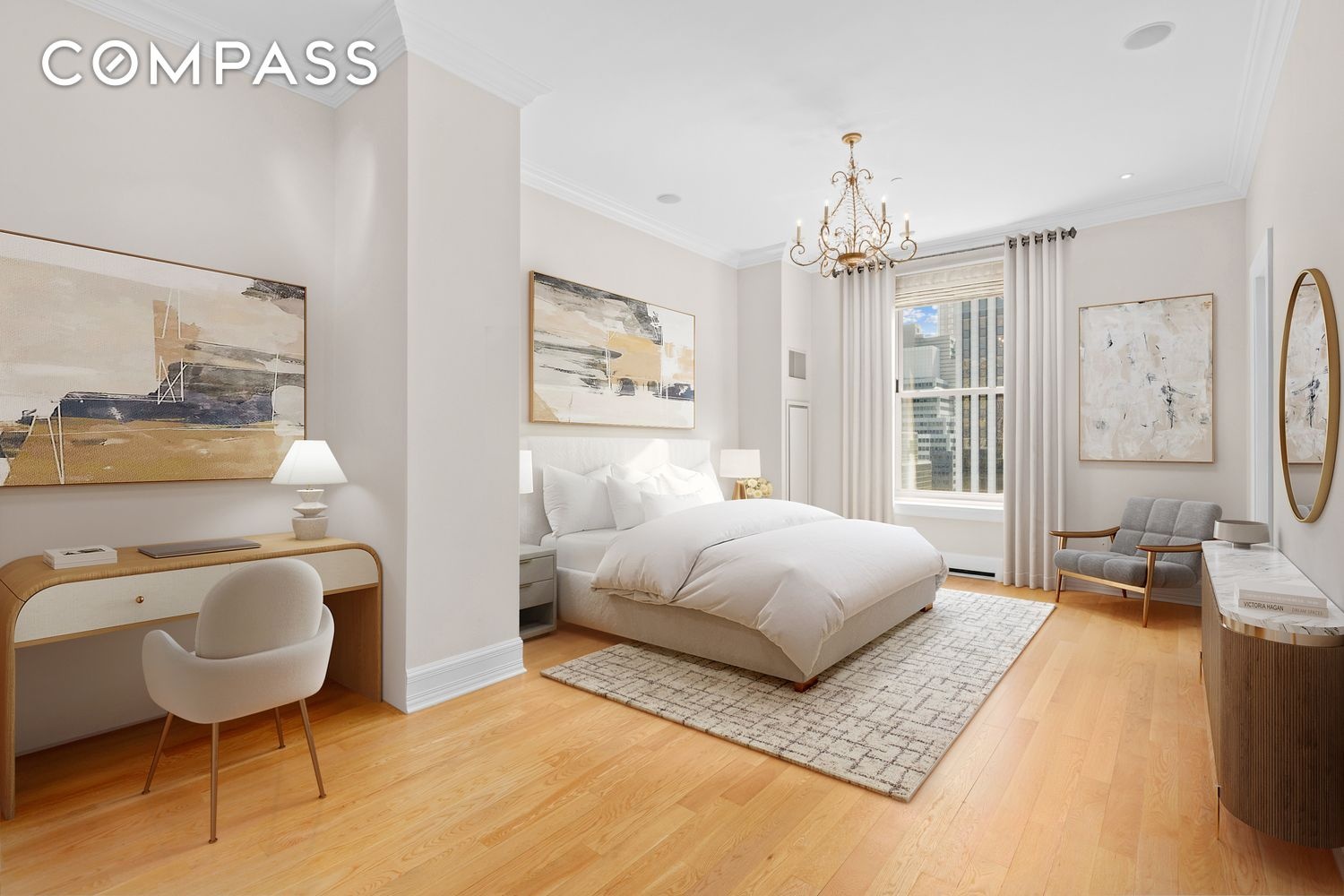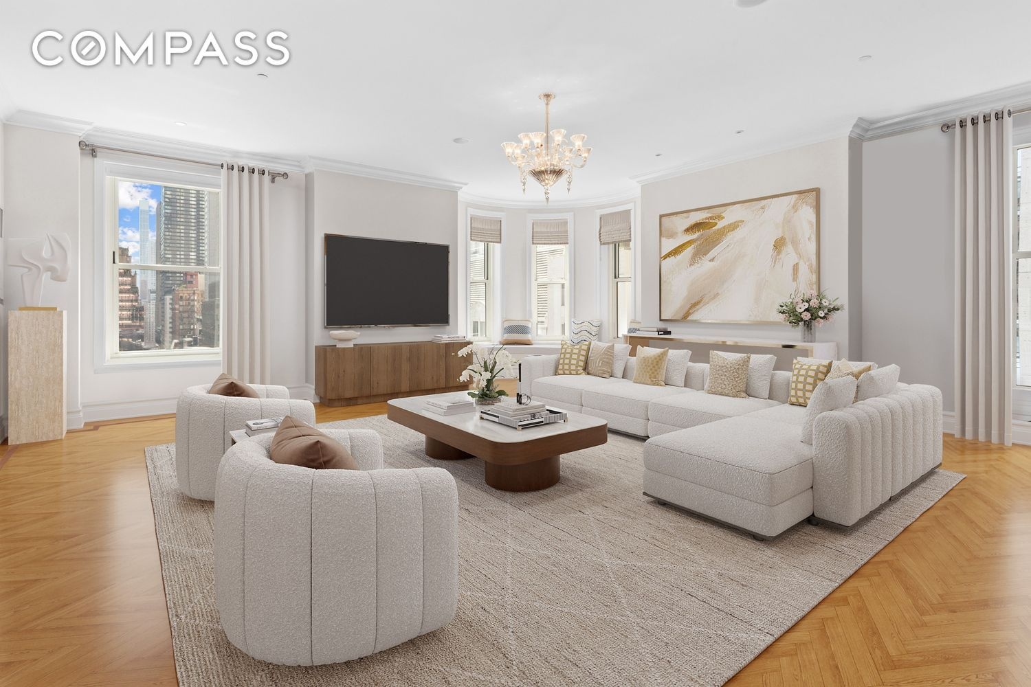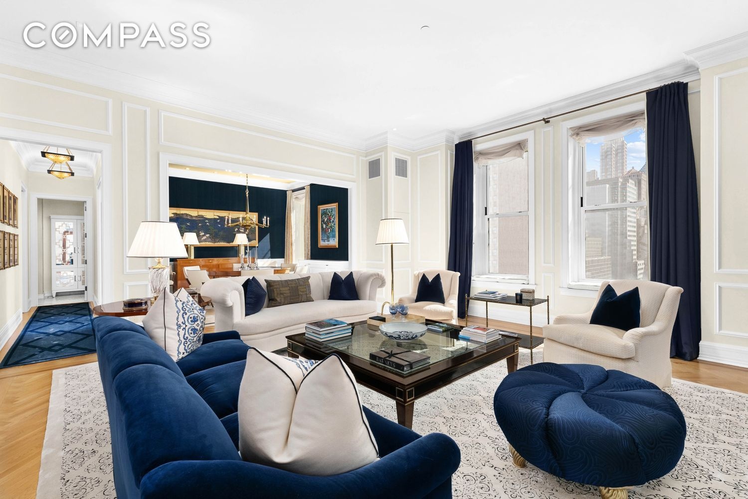 Residence 909 is a beautifully designed corner residence spanning approximately 2,900 square feet, offering 3 bedrooms and 2.5 bathrooms with sweeping views of Central Park and Fifth Avenue. Bathed in natural light, the home features an elegant foyer that opens into expansive living and dining rooms anchored by a rounded bay window overlooking the park. Rich architectural detailing, bespoke millwork, and a curated mix of herringbone, narrow plank, and parquet wood flooring define the interiors. The marble-clad chef’s kitchen is outfitted with a La Cornue range, Miele dishwasher, Sub-Zero refrigeration, and integrated wine storage, while a sophisticated den with coffered ceilings provides flexibility as a library or third bedroom. The primary suite is privately situated and features a custom walk-in closet and a luxurious five-fixture marble bath.