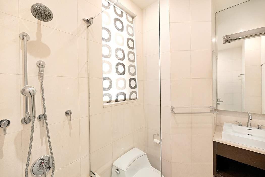 The generously sized corner bedroom benefits from east and south exposures, welcoming beautiful morning light. A dedicated dressing area, lined with multiple closets, leads to the bathroom.