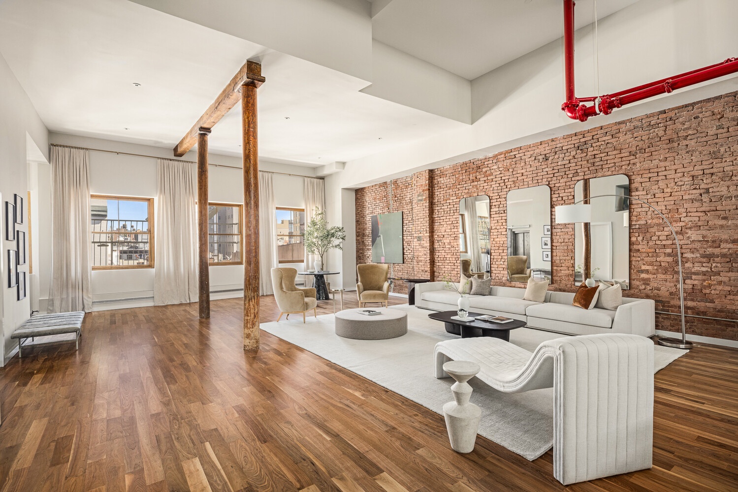 Arrive by key-locked elevator directly into your private world: 3,625 square feet of dramatic, light-filled interiors. The great room immediately captivates - a breathtaking expanse framed by a full wall of oversized windows, with 17-foot ceilings, original exposed brick, and authentic timber beams. Sunlight pours in, shifting throughout the day, animating the space and highlighting the raw beauty of true loft architecture refined for modern living.