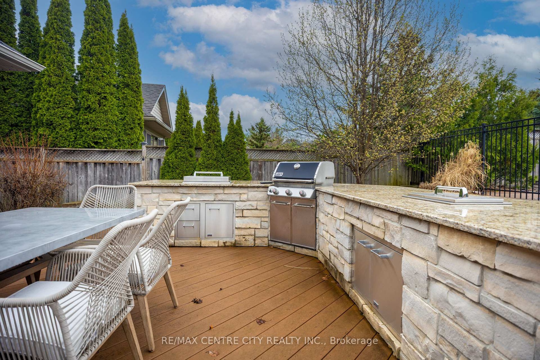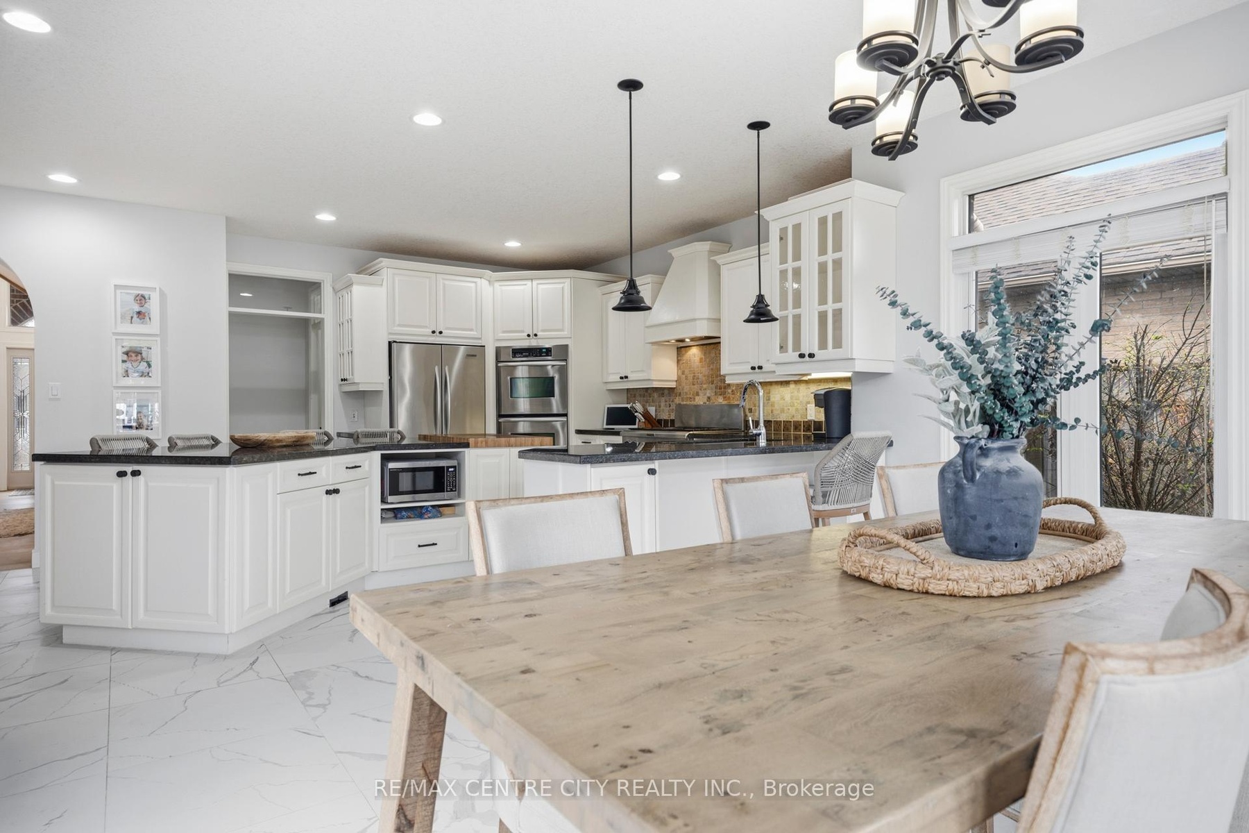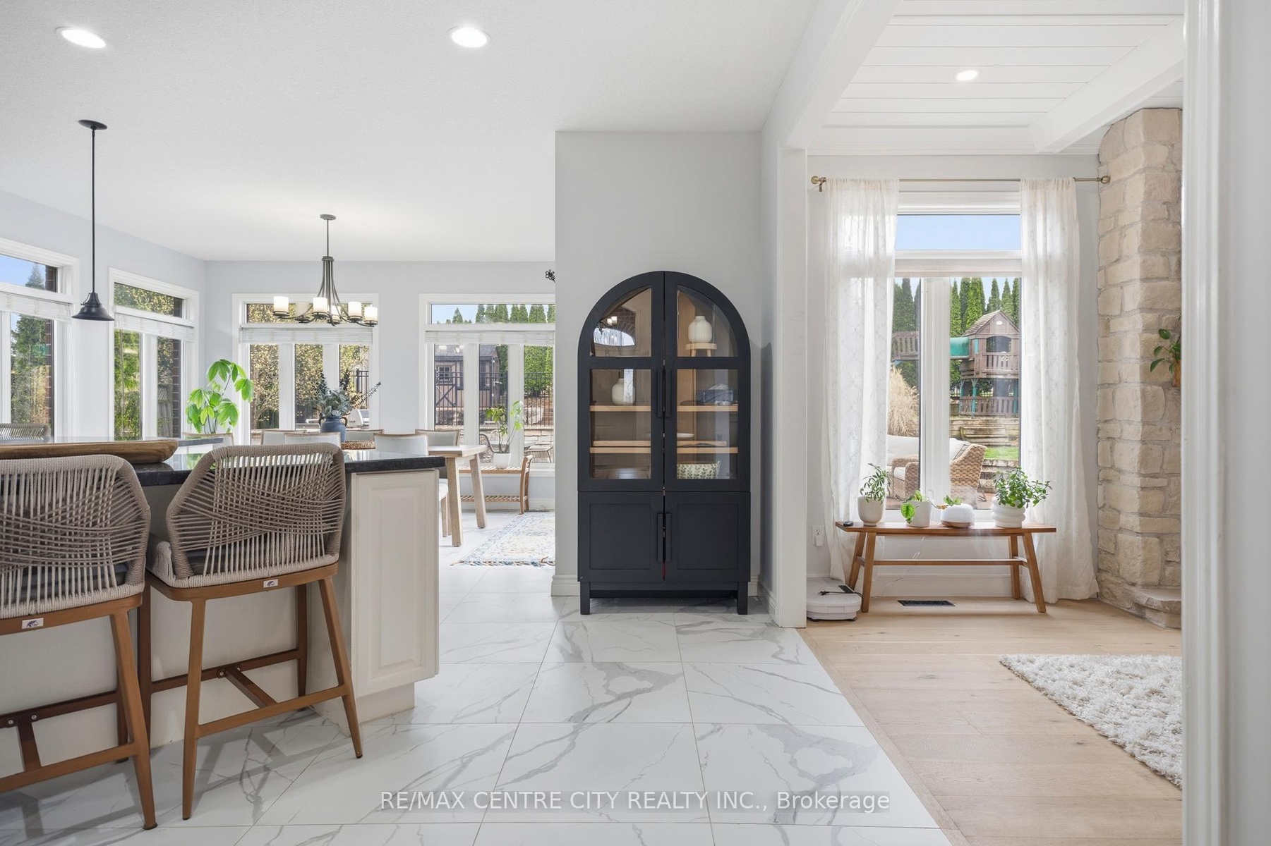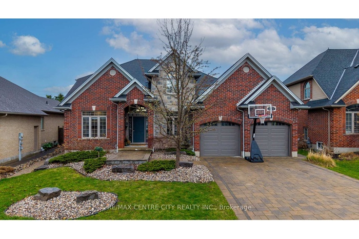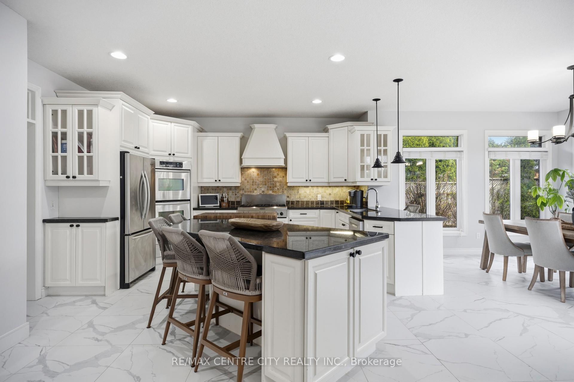 Located in one of London's most family-friendly neighbourhoods, just steps to Riverbend Park and a short walk to the vibrant West 5 district, this stunning estate home offers the perfect blend of lifestyle and convenience. Thoughtfully designed for both entertaining and everyday living, this impressive 4+1 bedroom, 3.5 bathroom home with a heated 3-car garage delivers exceptional space and functionality. Step inside to soaring 18ft ceilings and a striking new white oak staircase. The main level offers incredible versatility, featuring a custom office with built-in cabinetry and quartz countertops ideal as a workspace or formal dining room alongside a secondary office and a powder room. The oversized living room is complete with a new gas fireplace, stone surround, and custom millwork. The open-concept kitchen and dining area seamlessly combine style and function, offering ample prep space, a walk-in pantry, a professional-grade gas range, and a built-in double oven. Flooded with natural light, the dining area overlooks a private backyard oasis featuring a spacious composite deck with a custom outdoor kitchen, a heated in-ground pool, concrete lounging area, armour stone accents, and mature trees with no rear neighbours. Upstairs, the spacious primary retreat offers a private ensuite, complemented by three additional bedrooms and a beautifully updated main bathroom with double sinks and a tiled shower. The fully finished basement adds versatility with a fifth bedroom, second kitchen, 3-piece bath, and a family/games room ideal for entertaining or extended family living. Extensive updates of close to $100,000 over the past year include a new white oak staircase, custom millwork, LVP flooring throughout, second-floor bathroom, fresh paint, gas fireplace with stone surround, dishwasher, furnace, custom office cabinetry, and landscaping. Enjoy access to top-rated schools offering the best of city living, all set on a quiet, family-oriented street.