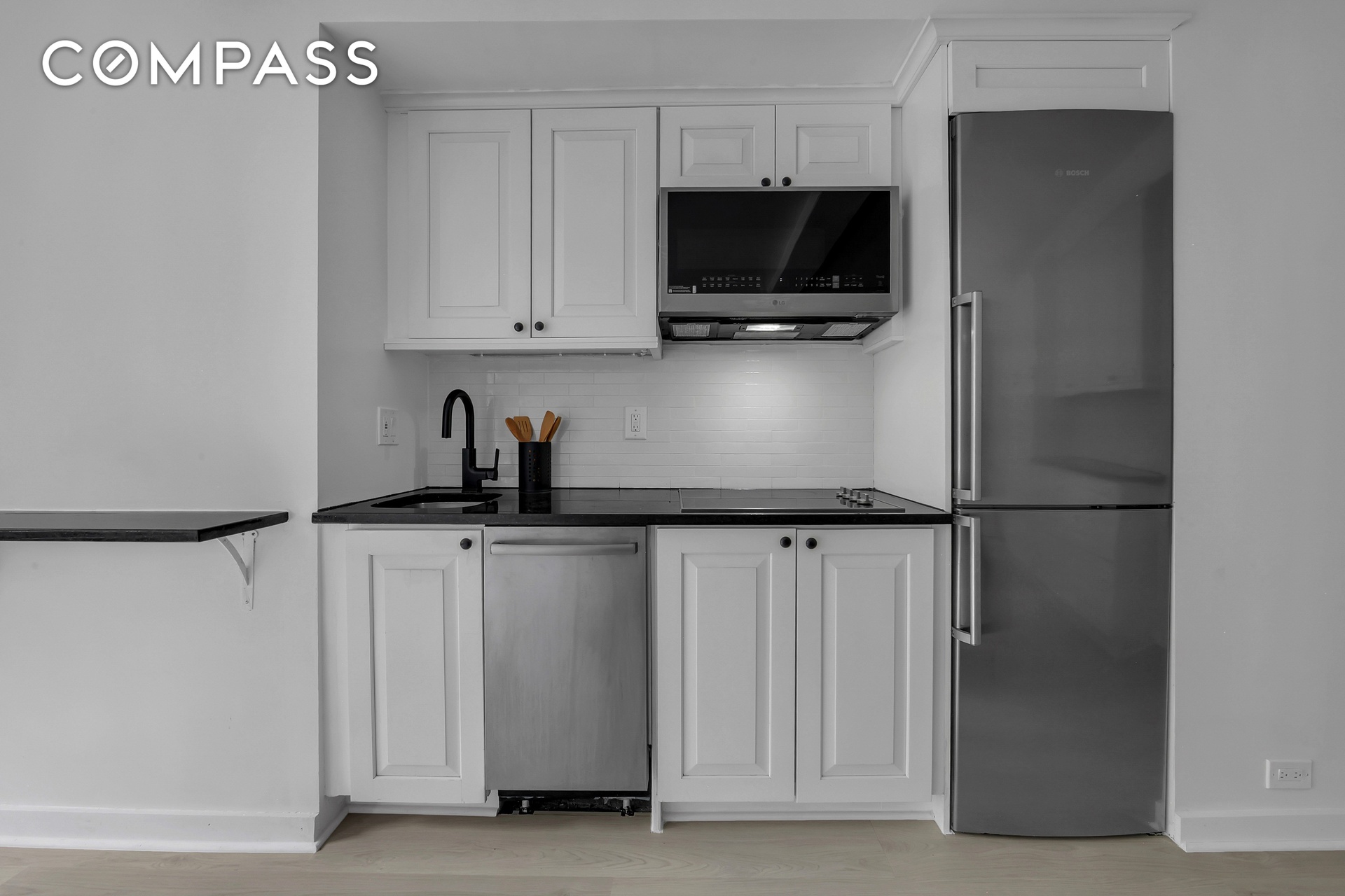 The renovated kitchen is designed for efficiency and style. It boasts striking black granite countertops, a classic subway-tiled backsplash, and premium stainless steel appliances, including a Bosch refrigerator and a Miele cooktop. There is an abundance of cabinet space and quiet-closing drawers.