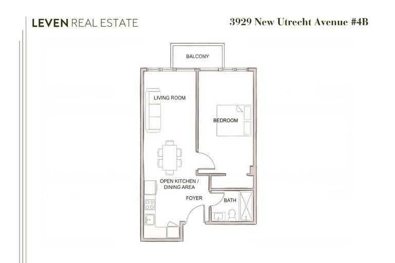 Positioned on the top floor of a well-maintained condominium, Residence 4B at 3929 New Utrecht Avenue offers a bright, efficient layout and a private outdoor space accessible from both the living room and the bedroom. The living area is well-proportioned, allowing for both lounging and dining, and opens directly onto the private balcony, extending the living experience outdoors. The open kitchen is outfitted with stainless steel appliances and has more than ample cabinet storage space perfect for everyday functionality. The bedroom is comfortably scaled and features a large closet, with direct access to the same private balcony. The home is complete with a well-considered tiled bath appointed with bright, crisp white tiled walls, a tub, and under-the-sink cabinet storage.