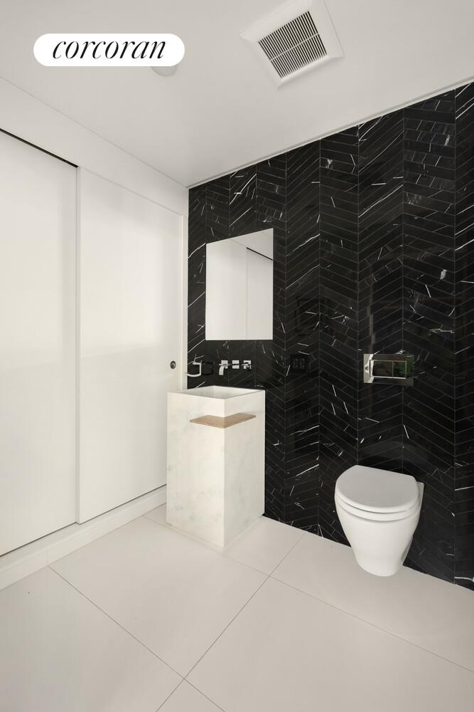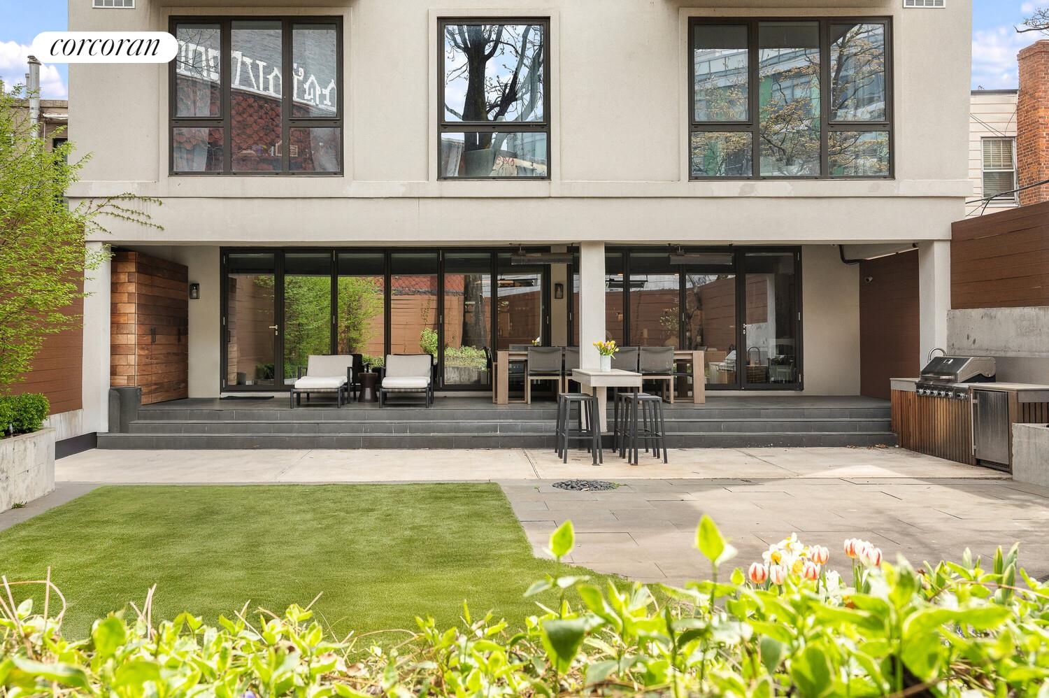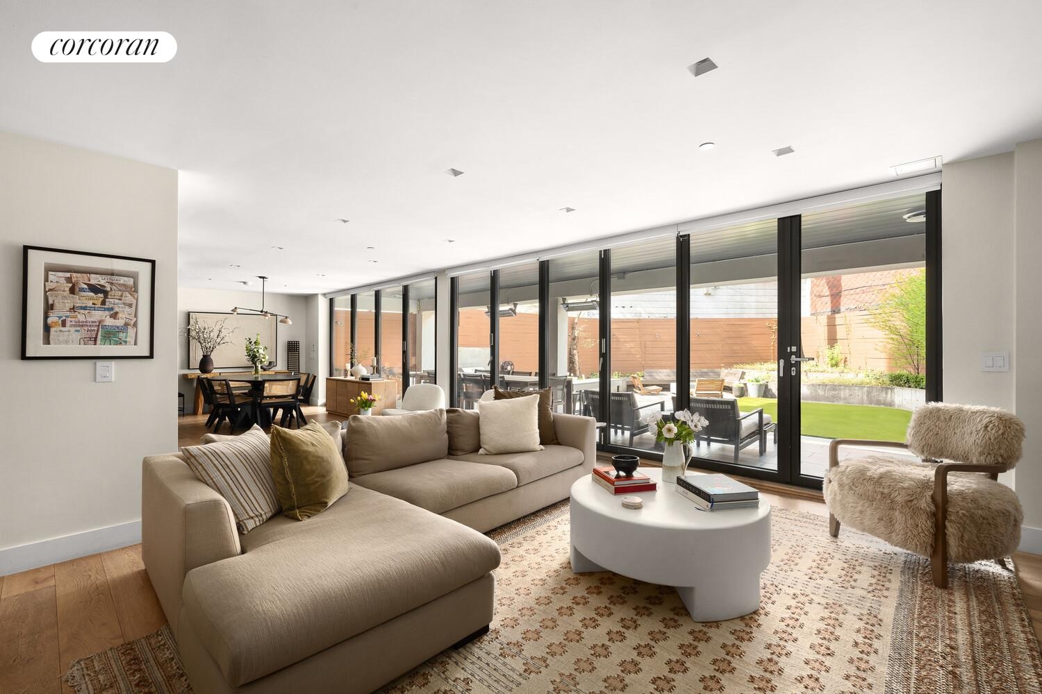 The main level features a spacious open layout with distinct living, dining, and kitchen areas that flow seamlessly together. Wide plank wood flooring runs throughout, complementing a sleek kitchen with marble countertops and custom cabinetry. Marble finishes extend into the powder room, adding a cohesive, elevated touch. The true standout of the home is the expansive private outdoor space, showcased by the main level's full wall of floor-to-ceiling glass doors that open completely, creating a seamless indoor-outdoor living experience, ideal for entertaining or everyday living.