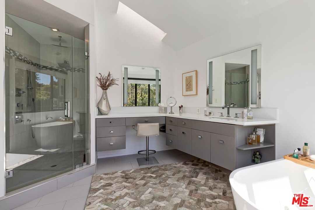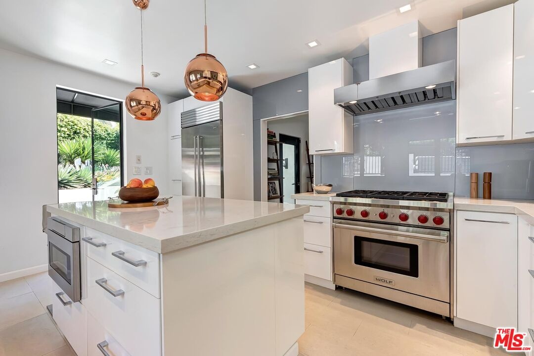 Experience refined contemporary living in this beautifully designed residence, ideally situated just minutes from the heart of Beverly Hills. Beautiful entry welcomes you with an elegant spiral staircase and exquisite travertine flooring, setting the tone for the home's sophisticated style. The light-filled living room features dramatic walls of glass that seamlessly open to serene patio spaces, perfect for effortless indoor-outdoor entertaining. A formal dining room offers an elegant setting for gatherings, while the chef's kitchen is appointed with top-of-the-line appliances and designed for both function and beauty. A stylish powder room completes the main level.The spectacular primary suite is a private retreat, boasting dual bathrooms, an expansive custom-fitted closet, and a versatile sitting room or office. Step out onto the private terrace and enjoy tranquil treetop views. A well-appointed second bedroom suite provides comfort and privacy for family or guests. Outdoors, professionally landscaped gardens create a lush, romantic setting, highlighted by a charming pergola ideal for al fresco dining or relaxation. 2-car garage. A rare opportunity to enjoy sophisticated living in one of the city's most coveted locations.