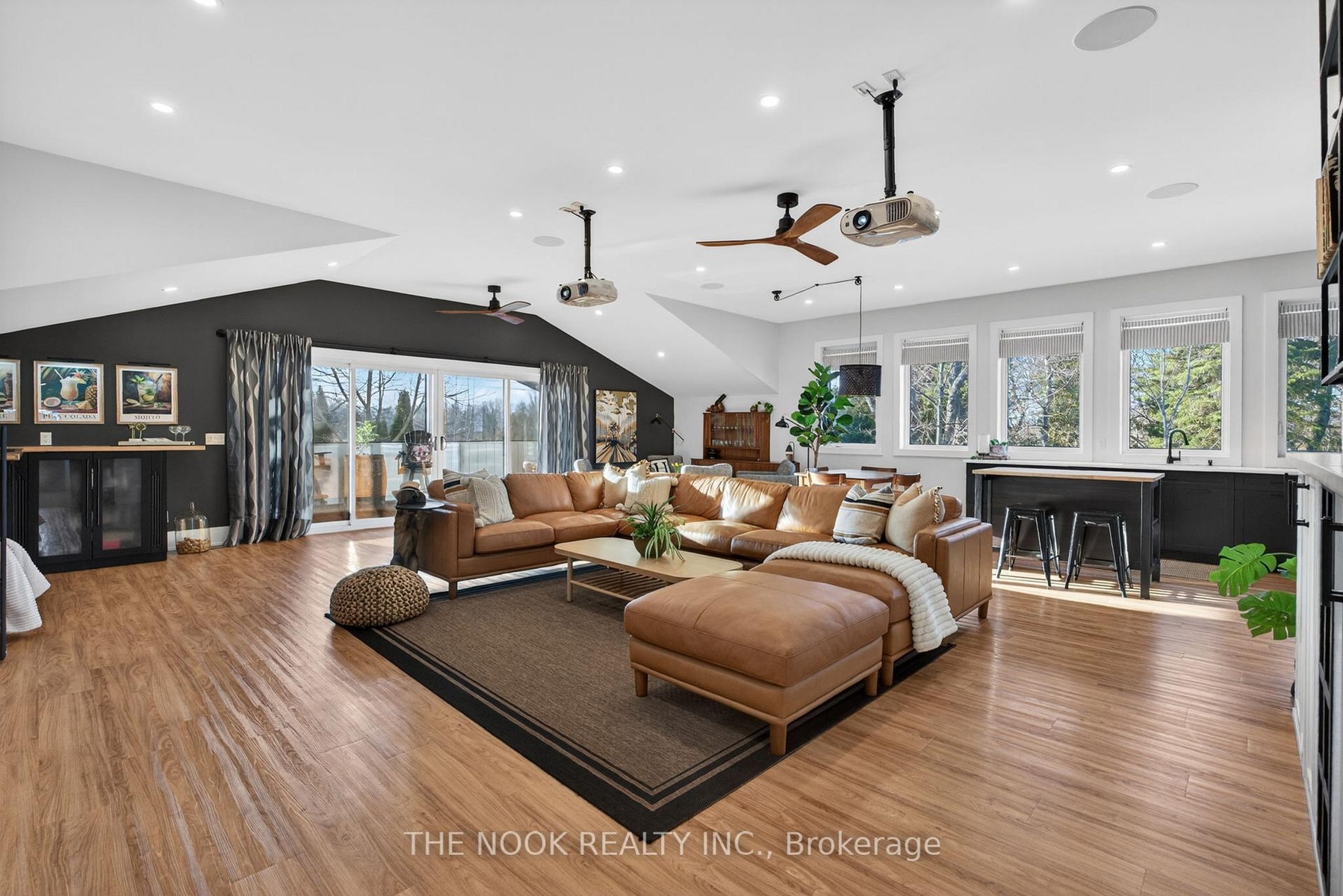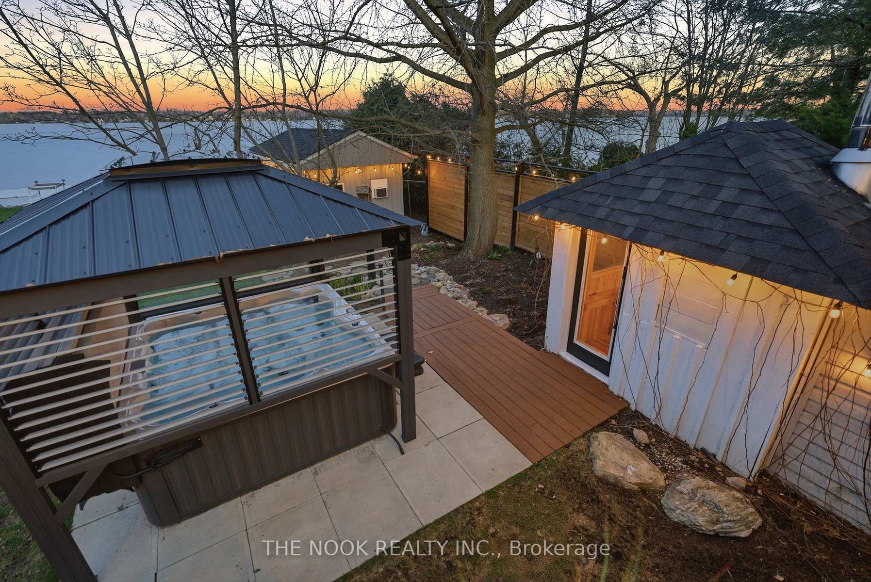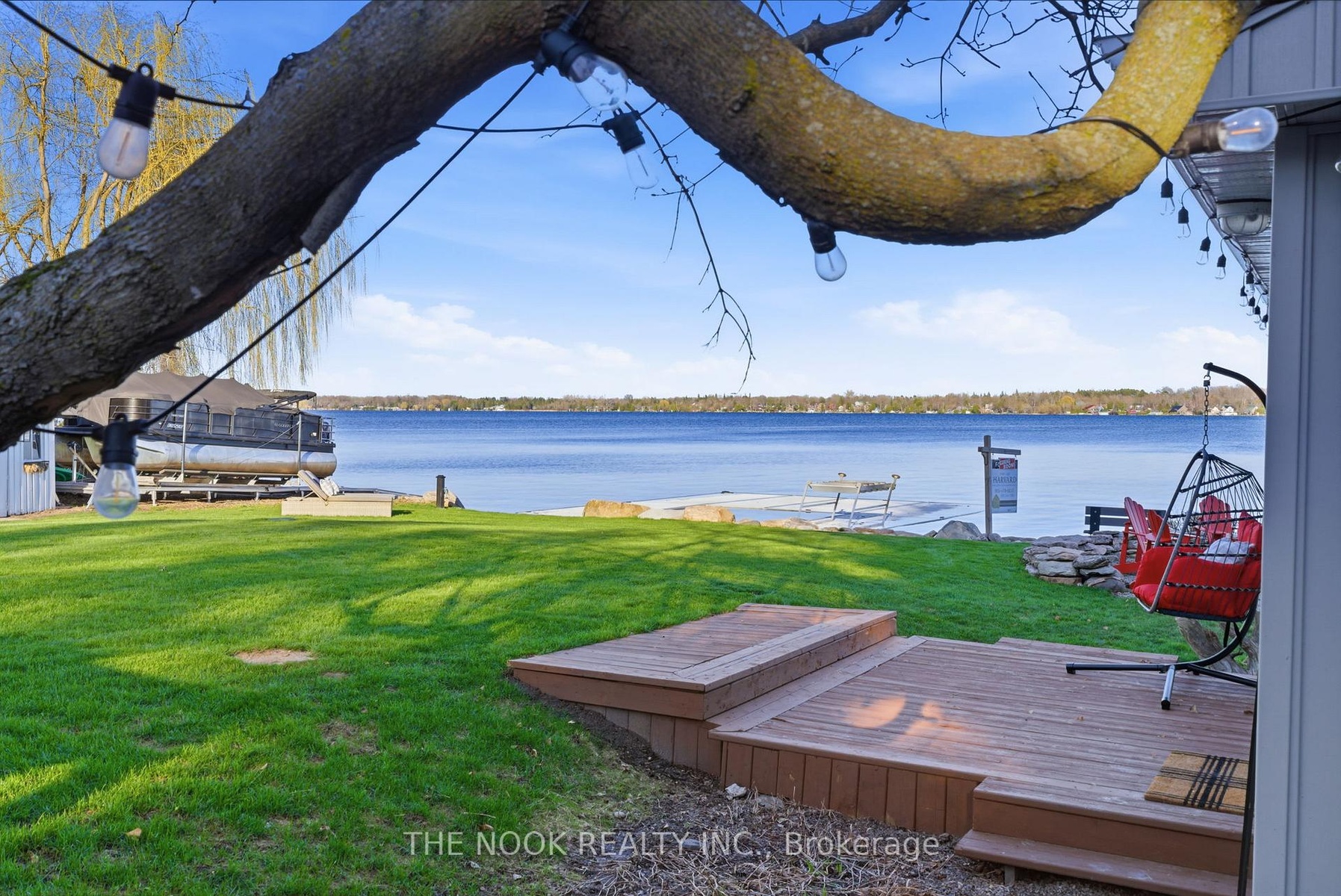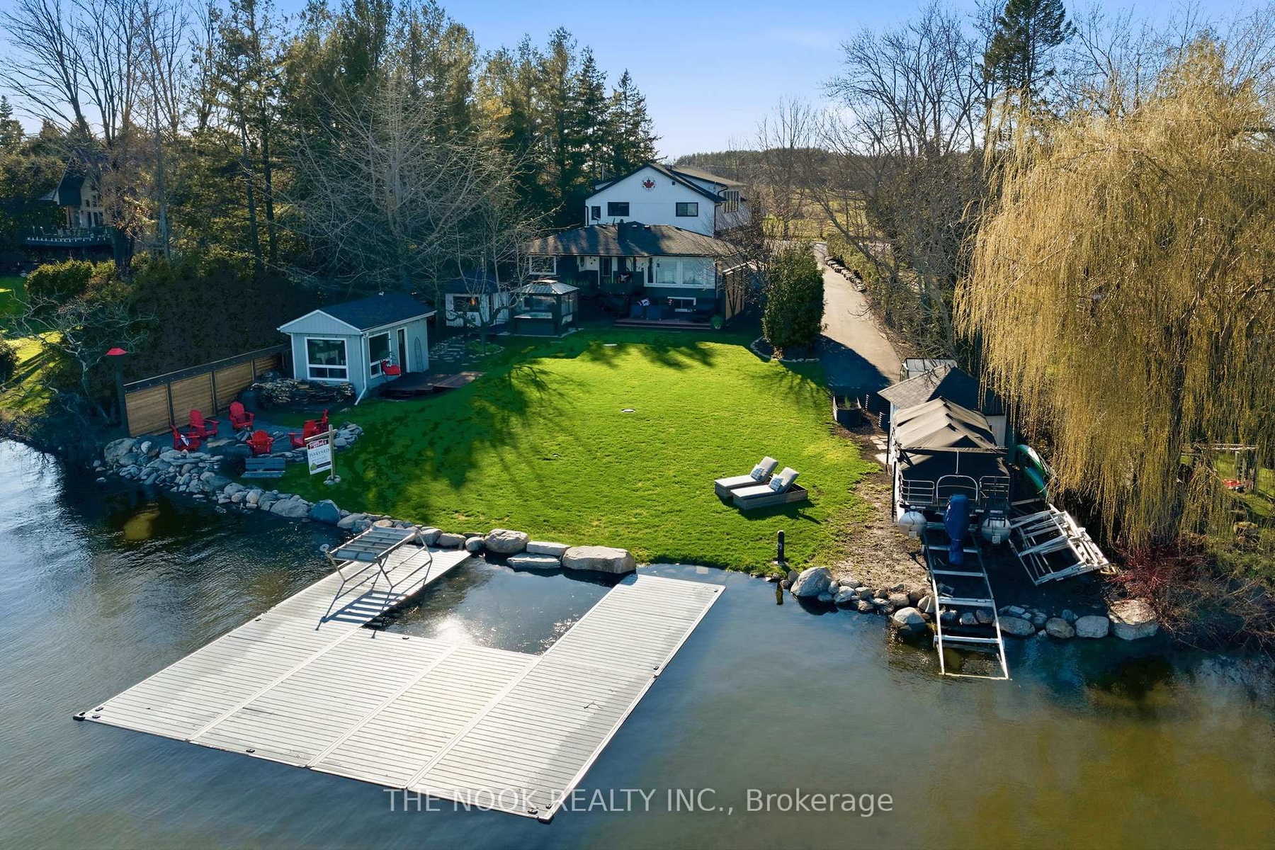 A rare waterfront estate offering uncompromising luxury, privacy, and multi-generational versatility, this fully reimagined residence presents a refined lakeside lifestyle defined by architectural clarity, elevated design, and exceptional south-facing views. Rebuilt in 2023 with over $1M in curated upgrades, the home blends modern sophistication with effortless livability, delivering comfort, scale, and understated elegance. Expansive principal living spaces are anchored by picturesque lake-facing windows that flood the interior with natural light and open to a composite terrace designed for quiet mornings, sunset entertaining, and year-round connection to the water. The kitchen is executed with precision and restraint, featuring quartz surfaces, an oversized island, premium appliances, and bespoke cabinetry integrated into the open-concept layout. Designed for privacy and flexibility, the residence includes a serene upper-level loft retreat with kitchenette, bar, and screened-in terrace, along with a fully finished walk-up lower level offering a second kitchen and generous living space, ideal for extended family or discreet guest accommodation. Outdoors, the property is composed as a private waterfront sanctuary with direct lake access, custom dock, expansive entertaining areas, fire feature, hot tub pavilion, and a newly constructed sauna. An unfinished bunkie with hydro offers future potential for guest accommodation, studio, or additional living space. Behind the aesthetics, the home is supported by dual HVAC systems, dual 200-amp service, new septic (2023), upgraded water filtration, spray foam insulation, and integrated security. The insulated three-car garage and workshop adds a WETT-certified fireplace, EV charging, and dedicated workspace with private bath-crafted for those seeking a true waterfront legacy estate.
