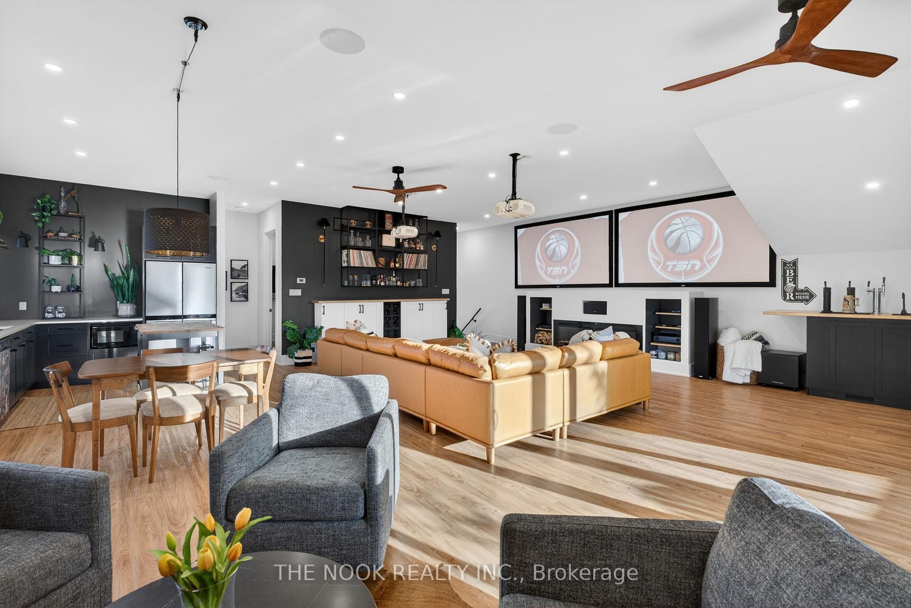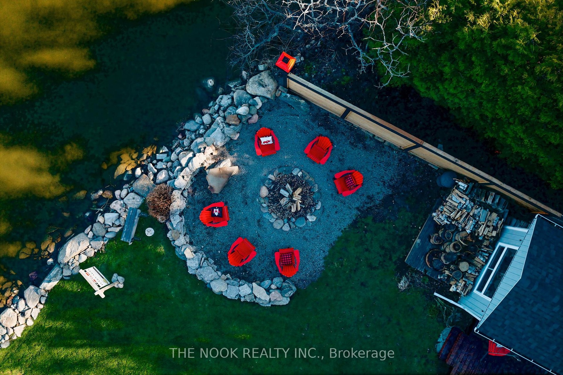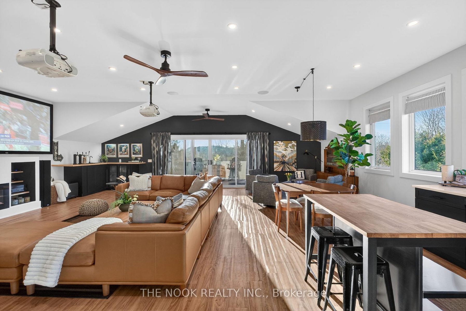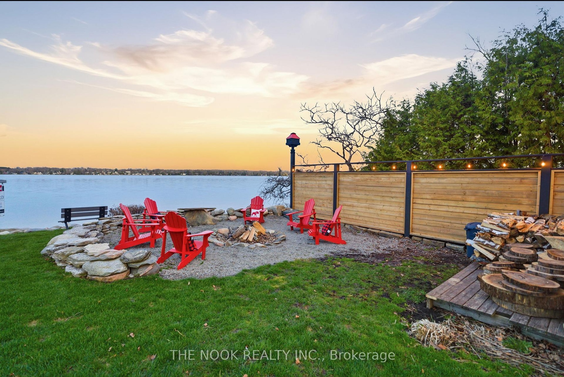 A rare waterfront estate offering uncompromising luxury, privacy, and multi-generational versatility, this fully reimagined residence presents a refined lakeside lifestyle defined by architectural clarity, elevated design, and exceptional south-facing views. Rebuilt in 2023 with over $1M in curated upgrades, the home blends modern sophistication with effortless livability, delivering comfort, scale, and understated elegance. Expansive principal living spaces are anchored by picturesque lake-facing windows that flood the interior with natural light and open to a composite terrace designed for quiet mornings, sunset entertaining, and year-round connection to the water. The kitchen is executed with precision and restraint, featuring quartz surfaces, an oversized island, premium appliances, and bespoke cabinetry integrated into the open-concept layout. Designed for privacy and flexibility, the residence includes a serene upper-level loft retreat with kitchenette, bar, and screened-in terrace, along with a fully finished walk-up lower level offering a second kitchen and generous living space, ideal for extended family or discreet guest accommodation. Outdoors, the property is composed as a private waterfront sanctuary with direct lake access, custom dock, expansive entertaining areas, fire feature, hot tub pavilion, and a newly constructed sauna. An unfinished bunkie with hydro offers future potential for guest accommodation, studio, or additional living space. Behind the aesthetics, the home is supported by dual HVAC systems, dual 200-amp service, new septic (2023), upgraded water filtration, spray foam insulation, and integrated security. The insulated three-car garage and workshop adds a WETT-certified fireplace, EV charging, and dedicated workspace with private bath-crafted for those seeking a true waterfront legacy estate.