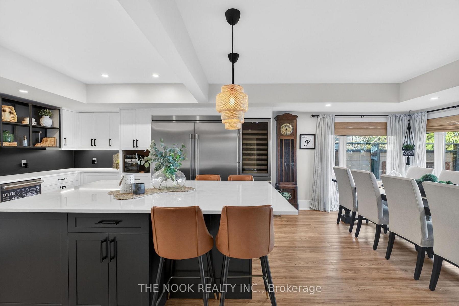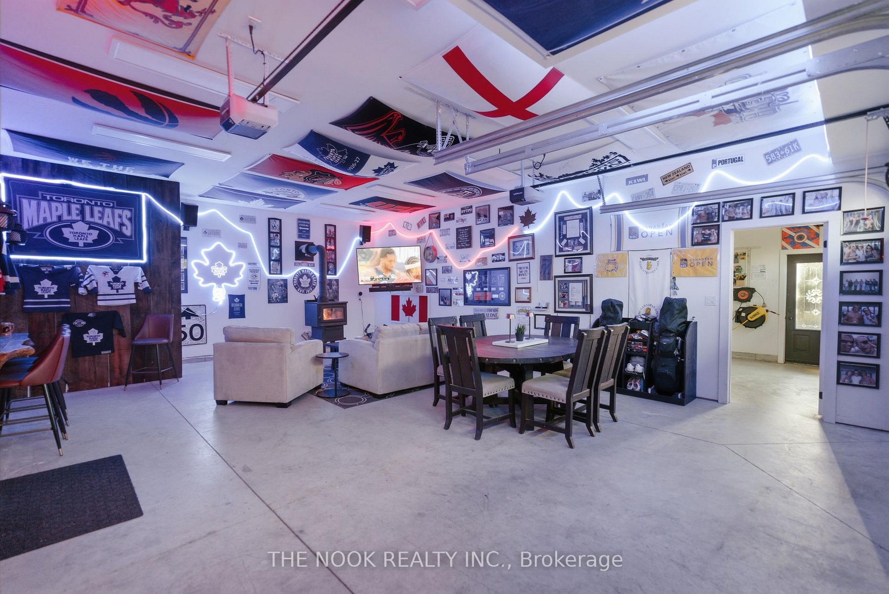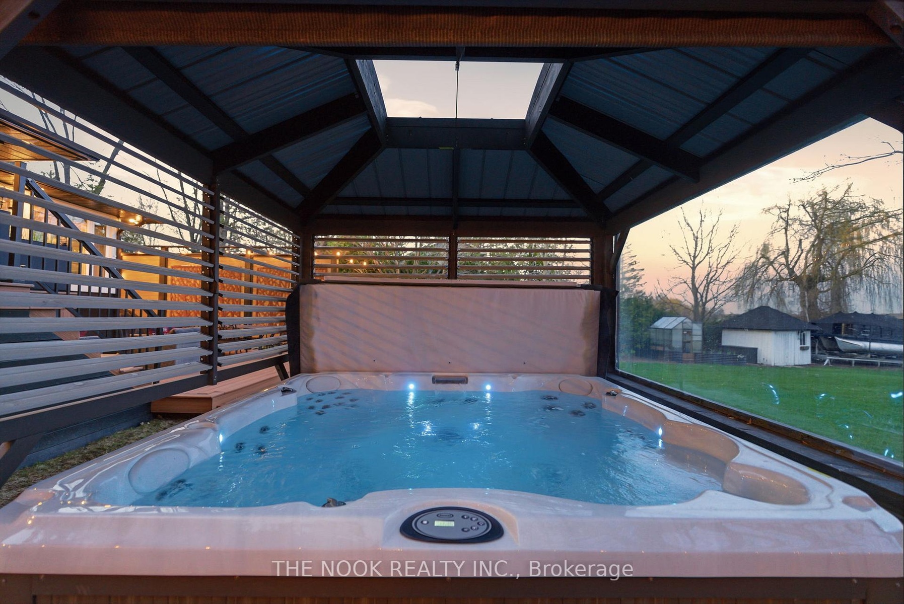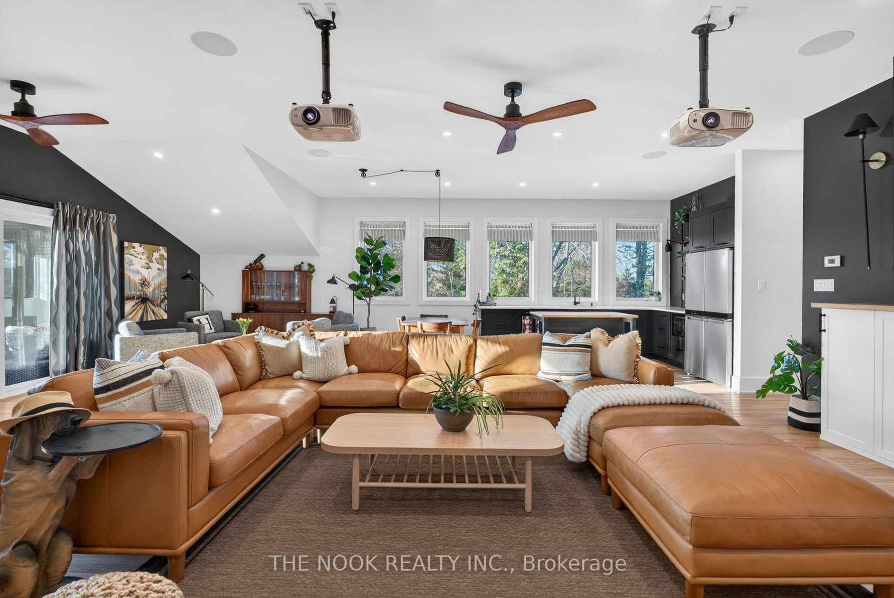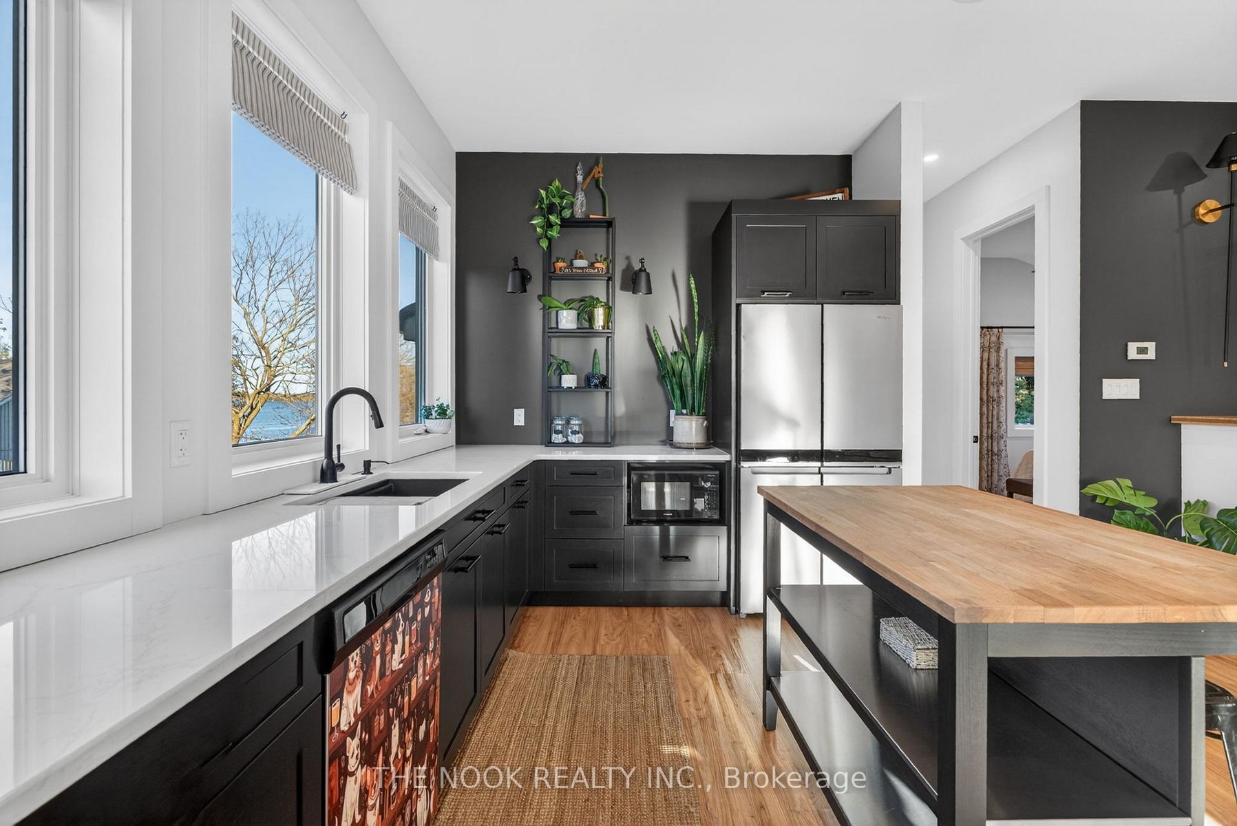 A rare waterfront estate offering uncompromising luxury, privacy, and multi-generational versatility, this fully reimagined residence presents a refined lakeside lifestyle defined by architectural clarity, elevated design, and exceptional south-facing views. Rebuilt in 2023 with over $1M in curated upgrades, the home blends modern sophistication with effortless livability, delivering comfort, scale, and understated elegance. Expansive principal living spaces are anchored by picturesque lake-facing windows that flood the interior with natural light and open to a composite terrace designed for quiet mornings, sunset entertaining, and year-round connection to the water. The kitchen is executed with precision and restraint, featuring quartz surfaces, an oversized island, premium appliances, and bespoke cabinetry integrated into the open-concept layout. Designed for privacy and flexibility, the residence includes a serene upper-level loft retreat with kitchenette, bar, and screened-in terrace, along with a fully finished walk-up lower level offering a second kitchen and generous living space, ideal for extended family or discreet guest accommodation. Outdoors, the property is composed as a private waterfront sanctuary with direct lake access, custom dock, expansive entertaining areas, fire feature, hot tub pavilion, and a newly constructed sauna. An unfinished bunkie with hydro offers future potential for guest accommodation, studio, or additional living space. Behind the aesthetics, the home is supported by dual HVAC systems, dual 200-amp service, new septic (2023), upgraded water filtration, spray foam insulation, and integrated security. The insulated three-car garage and workshop adds a WETT-certified fireplace, EV charging, and dedicated workspace with private bath-crafted for those seeking a true waterfront legacy estate.