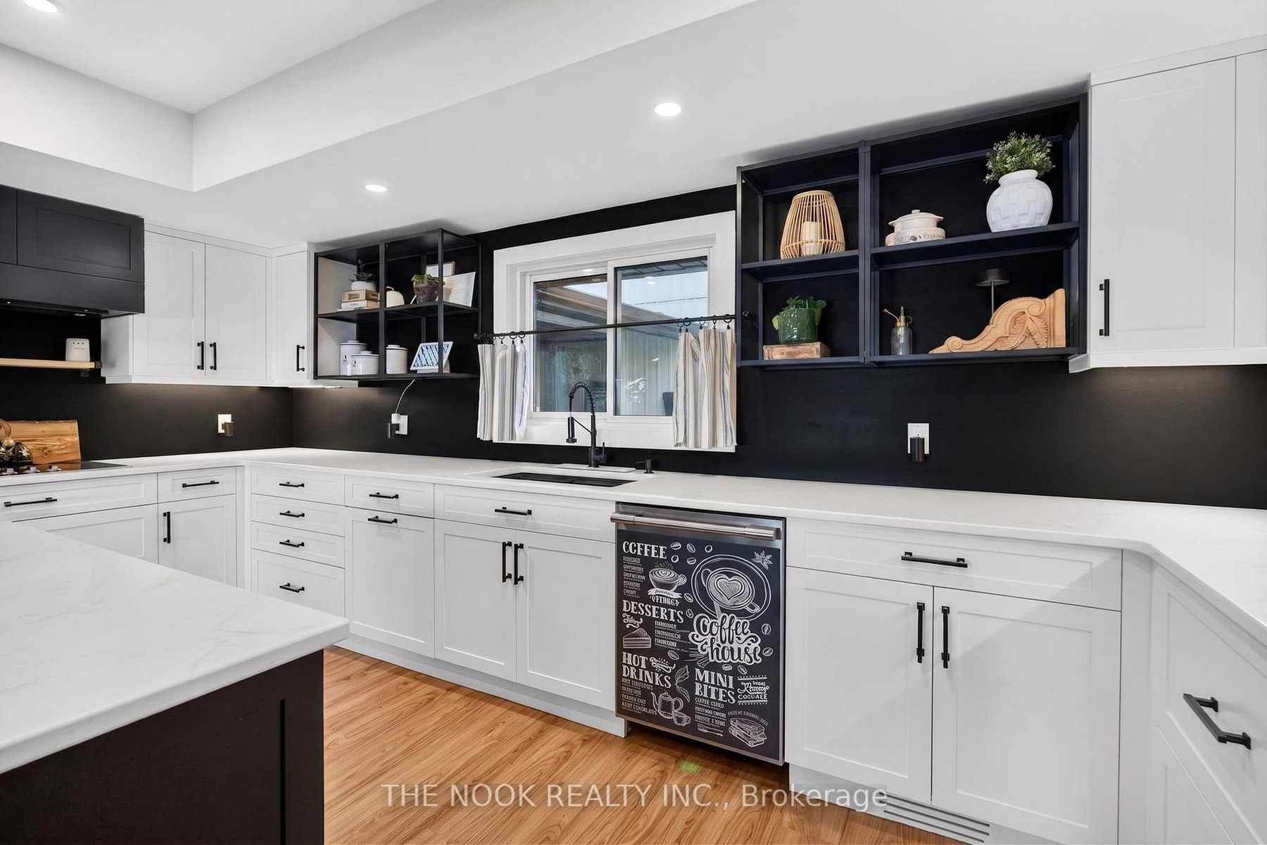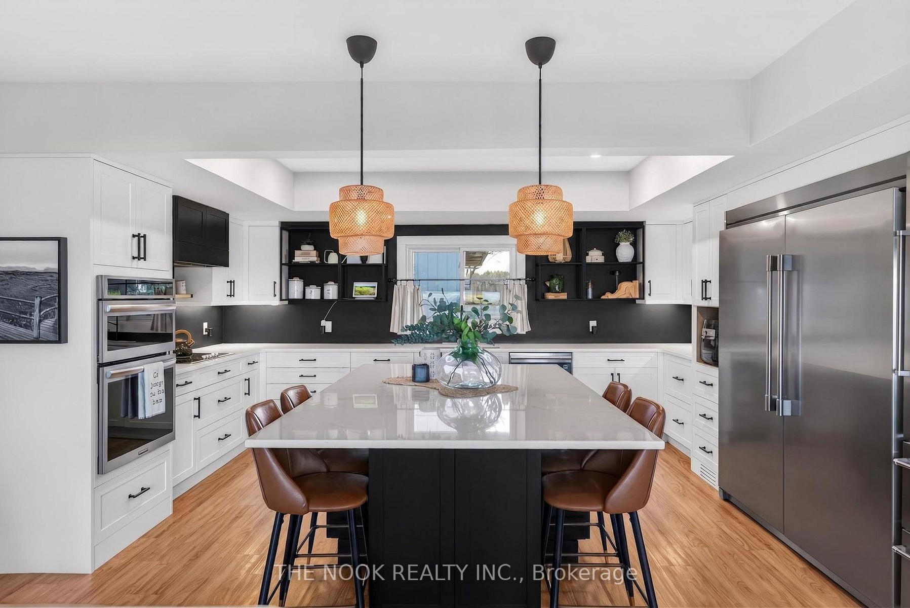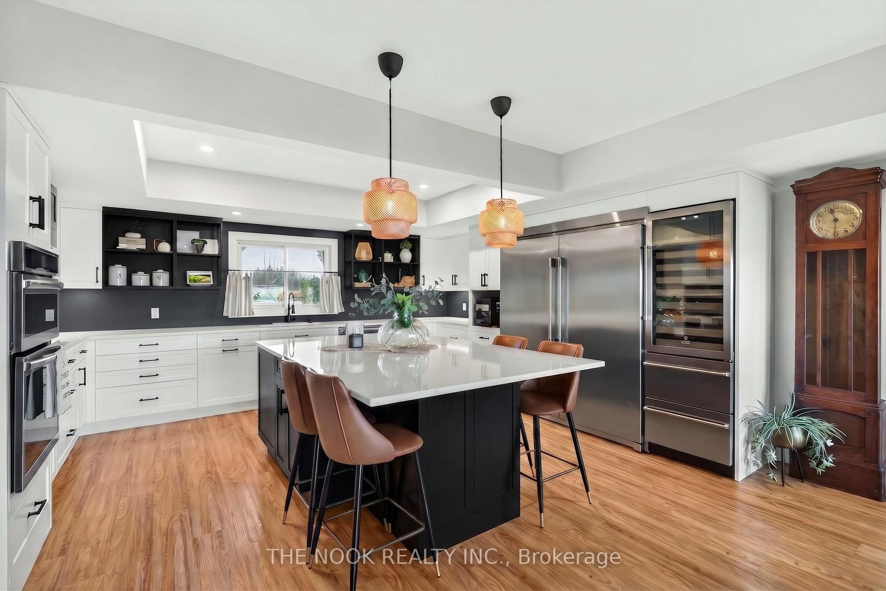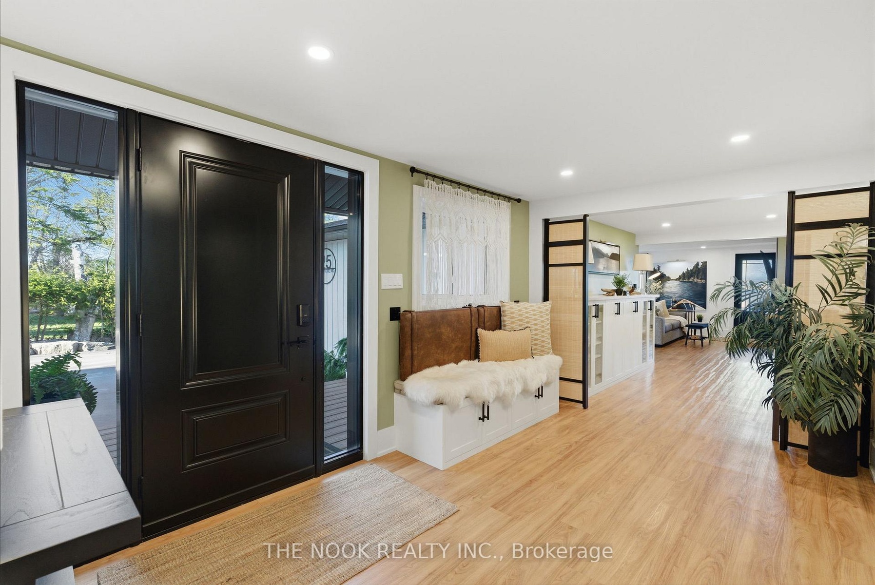 A rare waterfront estate offering uncompromising luxury, privacy, and multi-generational versatility, this fully reimagined residence presents a refined lakeside lifestyle defined by architectural clarity, elevated design, and exceptional south-facing views. Rebuilt in 2023 with over $1M in curated upgrades, the home blends modern sophistication with effortless livability, delivering comfort, scale, and understated elegance. Expansive principal living spaces are anchored by picturesque lake-facing windows that flood the interior with natural light and open to a composite terrace designed for quiet mornings, sunset entertaining, and year-round connection to the water. The kitchen is executed with precision and restraint, featuring quartz surfaces, an oversized island, premium appliances, and bespoke cabinetry integrated into the open-concept layout. Designed for privacy and flexibility, the residence includes a serene upper-level loft retreat with kitchenette, bar, and screened-in terrace, along with a fully finished walk-up lower level offering a second kitchen and generous living space, ideal for extended family or discreet guest accommodation. Outdoors, the property is composed as a private waterfront sanctuary with direct lake access, custom dock, expansive entertaining areas, fire feature, hot tub pavilion, and a newly constructed sauna. An unfinished bunkie with hydro offers future potential for guest accommodation, studio, or additional living space. Behind the aesthetics, the home is supported by dual HVAC systems, dual 200-amp service, new septic (2023), upgraded water filtration, spray foam insulation, and integrated security. The insulated three-car garage and workshop adds a WETT-certified fireplace, EV charging, and dedicated workspace with private bath-crafted for those seeking a true waterfront legacy estate.