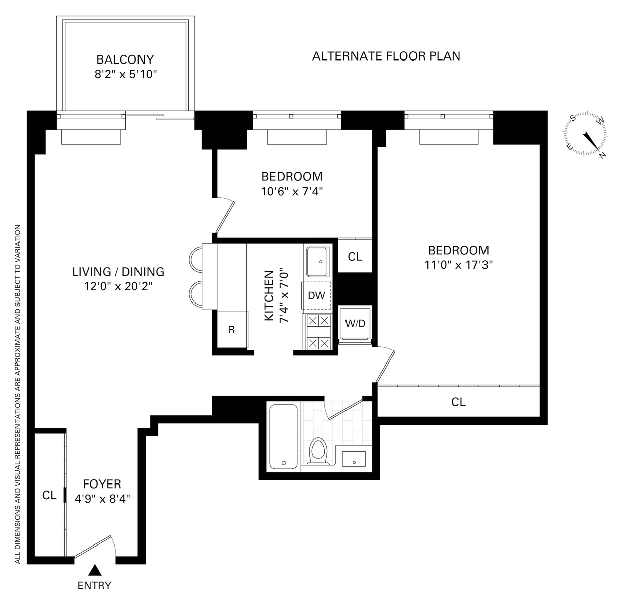 This thoughtfully designed layout begins with a welcoming entry foyer that opens into an expansive living room. A separate, windowed dining area offers exceptional flexibility and can easily be converted into a home office, nursery, or even a second bedroom - a configuration already implemented in many apartments within the building.