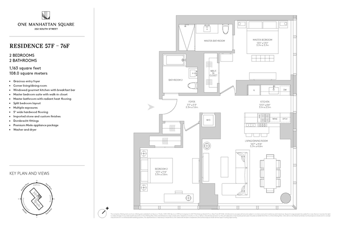 10' foot ceilings! Residence 69F is a 1,163 square foot two bedroom, two bathroom with an open gourmet kitchen and breakfast bar. This spacious corner residence faces North East and South East, with spectacular East River views and expansive city skyline. Warm, modern interiors are brought to life by the renowned design team at Meyer Davis Studio. This residence features imported stone and custom finishes, premium Miele appliance package, 5 wide stained oak flooring, master bath with custom wood cabinetry, marble tile walls and mosaic floors with radiant heat, undermount Wetstyle sink with glass vanity top and Dornbracht polished chrome faucets and a washer and dryer.