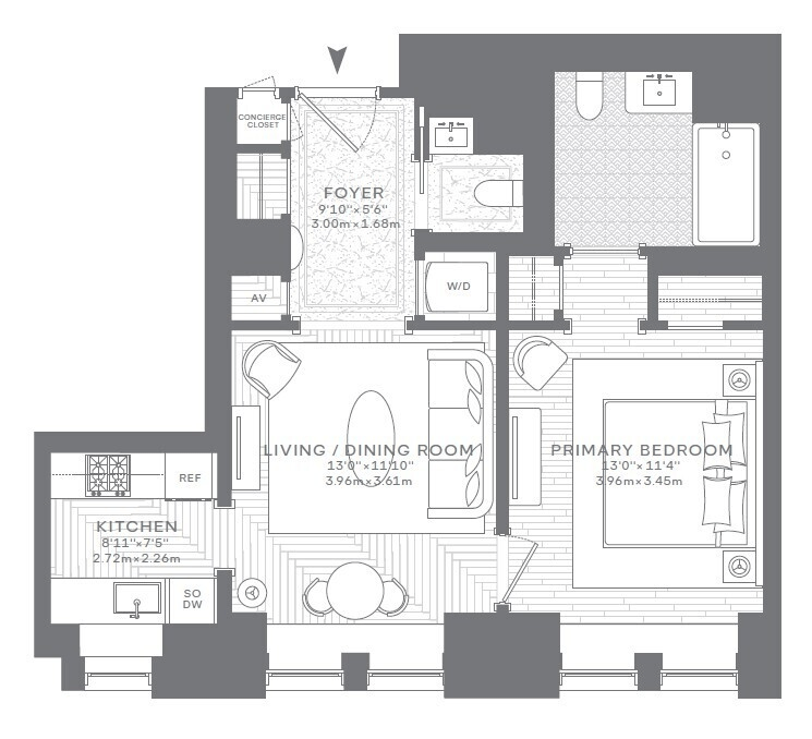 One Bedroom, One and One-Half Bathroom Apartment
