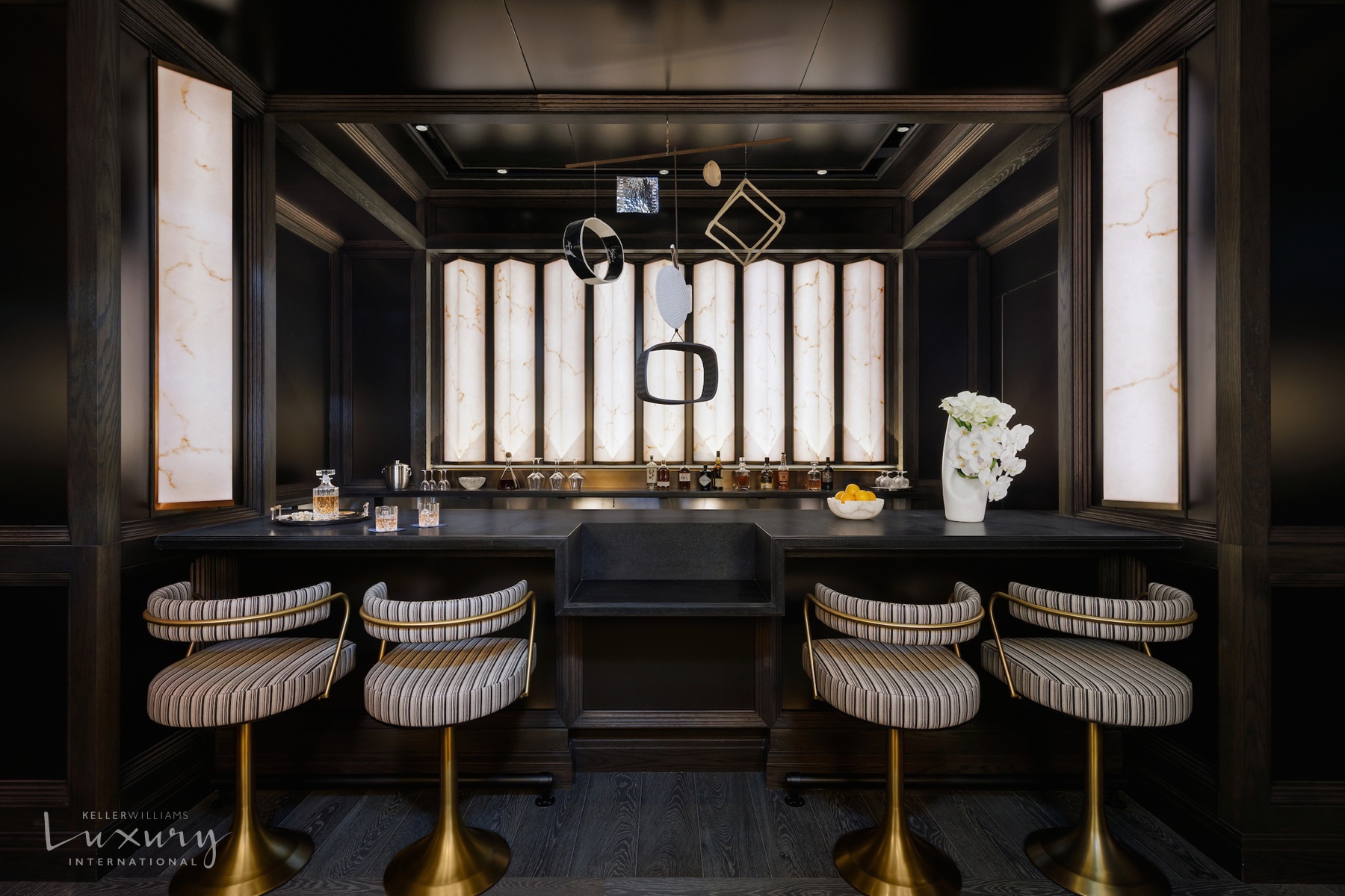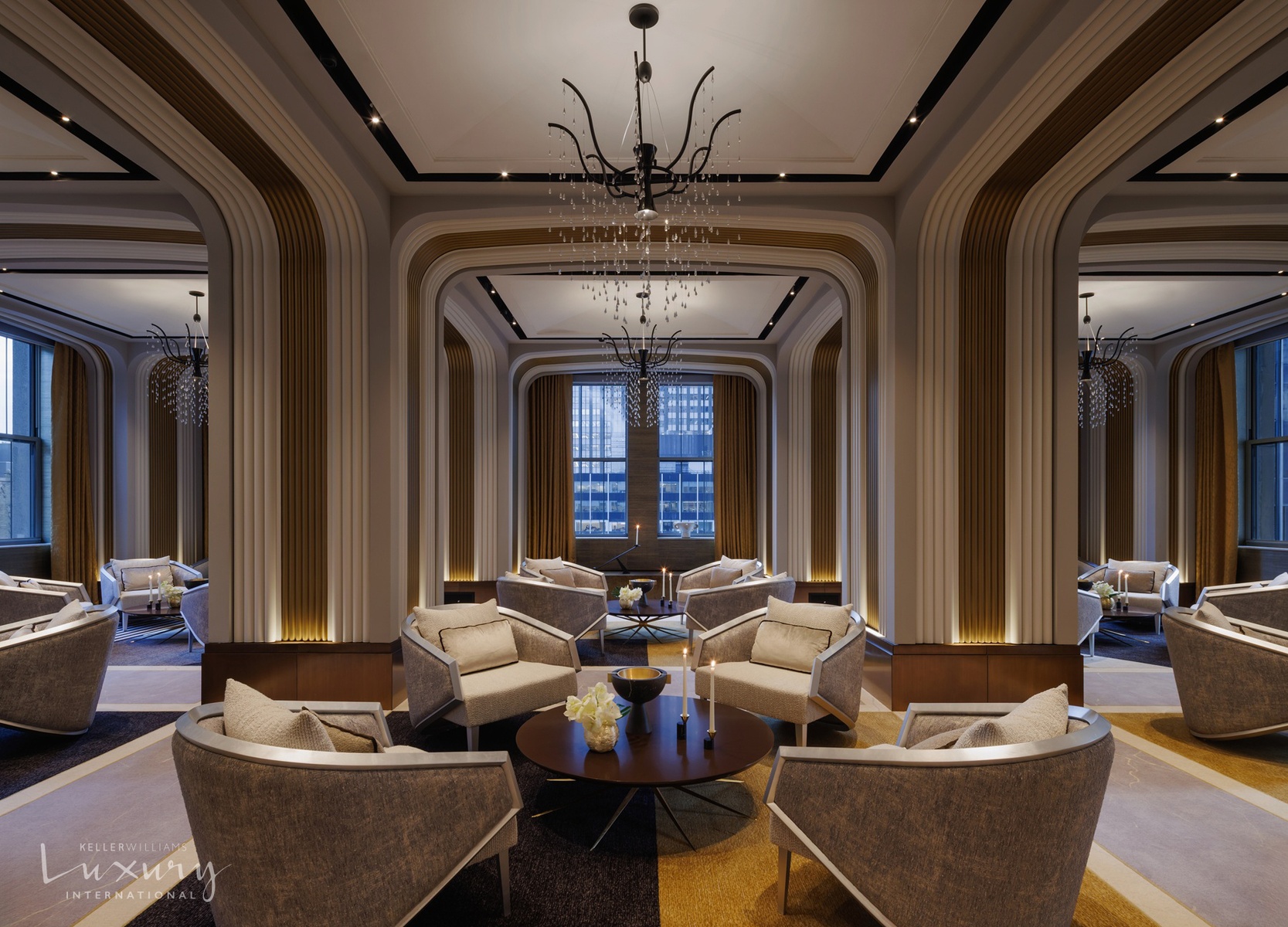 Features: Art Deco inspired architectural detailing such as custom paneled doors with antique bronze fixtures, high cove ceilings and striking oversized arched windows.