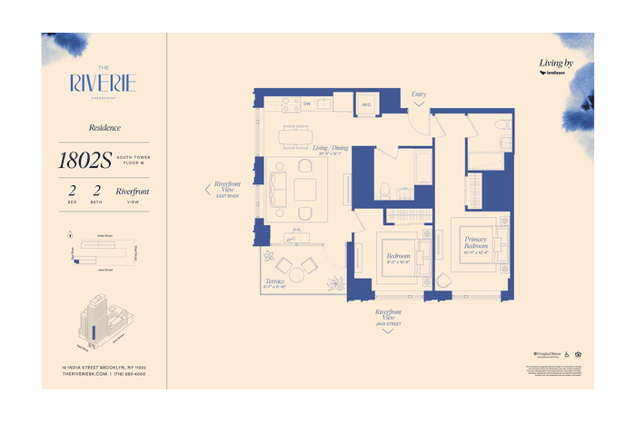 Anchored to the banks of the East River, The Riverie rises as a new beacon of serene riverside living and accessibility, with direct access to Manhattan by ferry at the India Street Pier. Elegant, light-filled studio to three-bedroom residences offer exceptional, sweeping skyline views of Manhattan, Brooklyn, and the riverfront. The building pairs refined design and natural beauty with sustainable innovation, including net-zero carbon operations and New York's largest geothermal residential system.