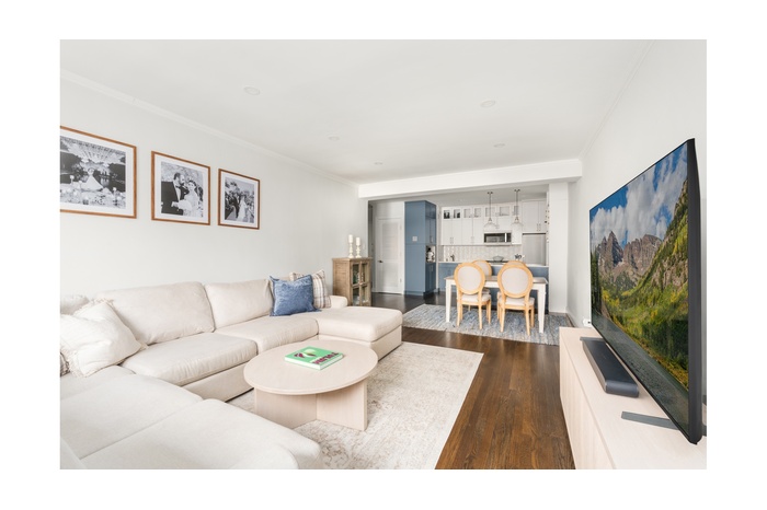 The sleek, open chef's kitchen is outfitted with high-end Bosch, Miele, and Liebherr appliances, quartz countertops, and a breakfast bar, seamlessly enhancing the airy, open feel. Generous outfitted closets are found throughout the apartment, along with the convenience of an in-unit washer and dryer.