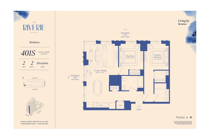 Anchored to the banks of the East River, The Riverie rises as a new beacon of serene riverside living and accessibility, with direct access to Manhattan by ferry at the India Street Pier. Elegant, light-filled studio to three-bedroom residences offer exceptional, sweeping skyline views of Manhattan, Brooklyn, and the riverfront. The building pairs refined design and natural beauty with sustainable innovation, including net-zero carbon operations and New York's largest geothermal residential system.