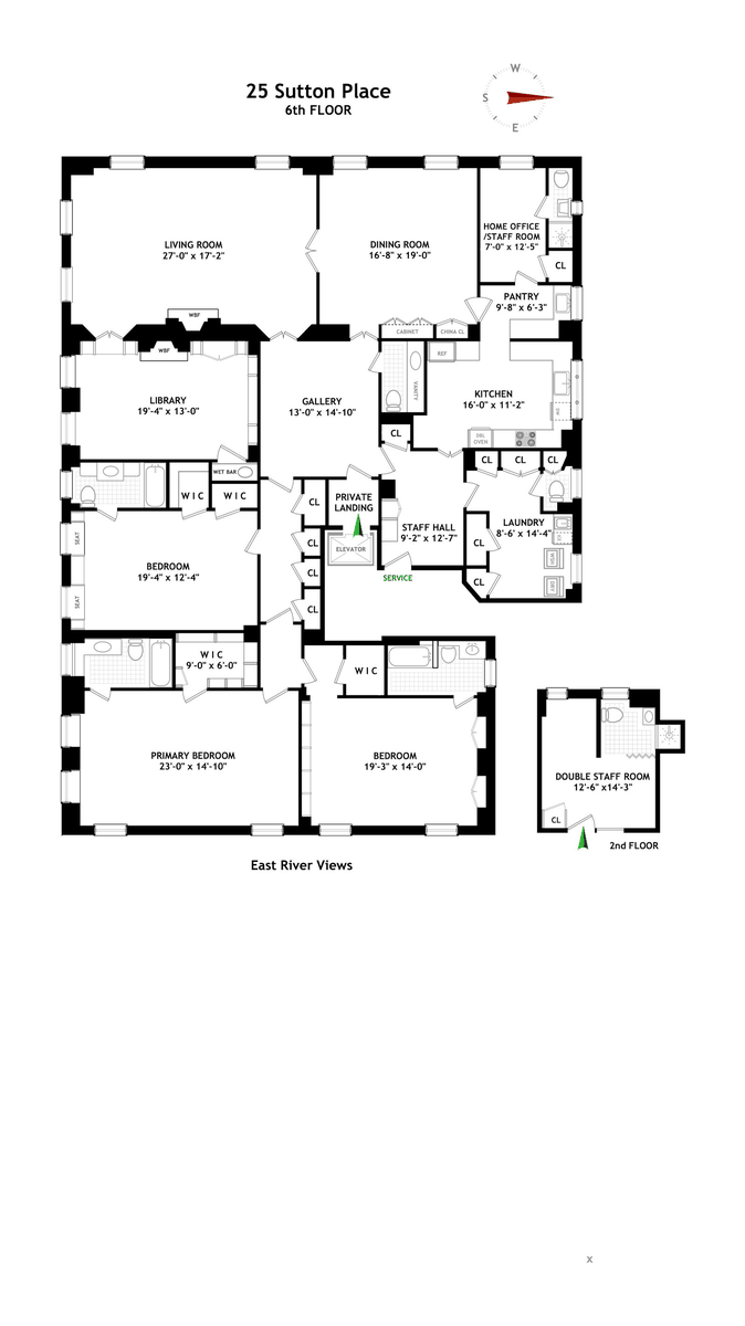 A private elevator vestibule opens to a sophisticated entrance gallery, complete with a powder room. The spacious corner living room is bathed in sunlight and features a beautiful wood-burning fireplace. Adjacent, the generously proportioned wood-paneled library boasts a wall of built-in bookcases, a wet bar, and its own wood-burning fireplace, creating a cozy yet refined space. The formal dining room is ideal for both large gatherings and intimate dinners and flows seamlessly into the living room. A separate hallway leads to the private bedroom wing, which includes three bedrooms. The sun-drenched corner primary bedroom offers direct river views to the south and east, creating a serene and magical retreat. This suite includes a custom-fitted walk-in closet and a large ensuite windowed bath. Two additional bedrooms, each with ensuite windowed baths and walk-in closets, are equally spacious, with one also offering river views. The large, windowed kitchen connects to a butler's pantry, laundry room, staff room, which is currently used as a home office with a full ensuite bath, and an additional half bath. A separate double staff room on the second floor of the building is also being offered for sale.