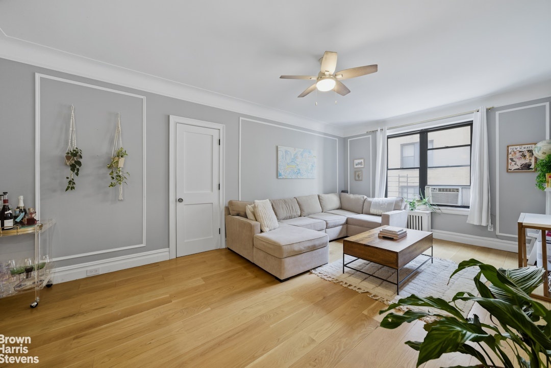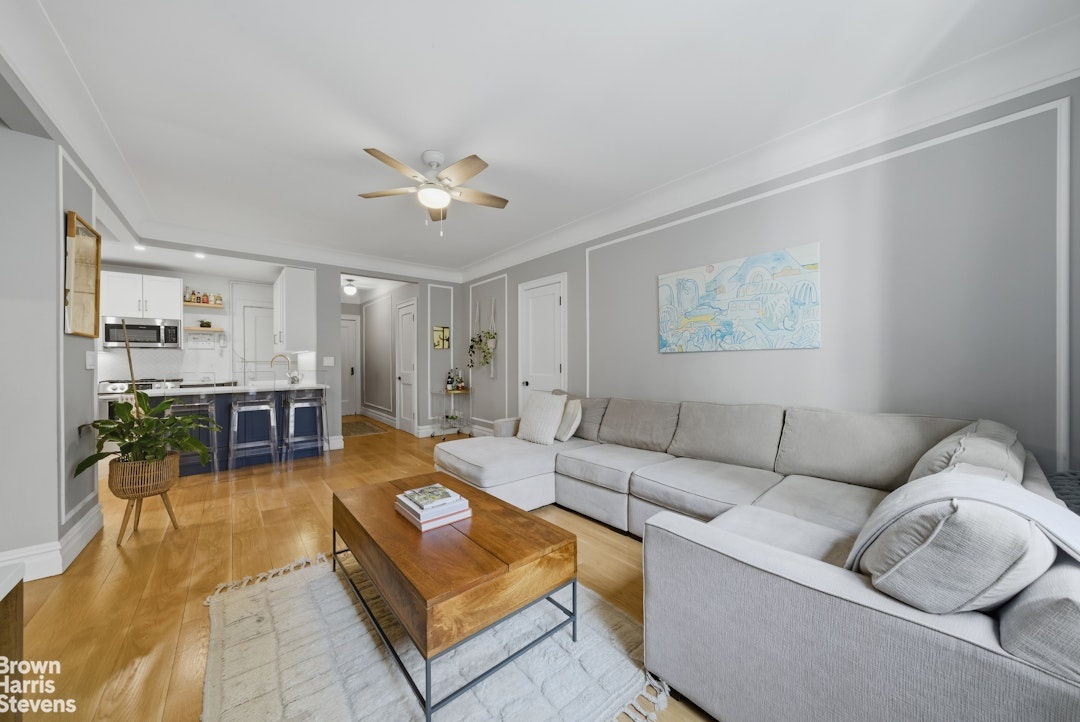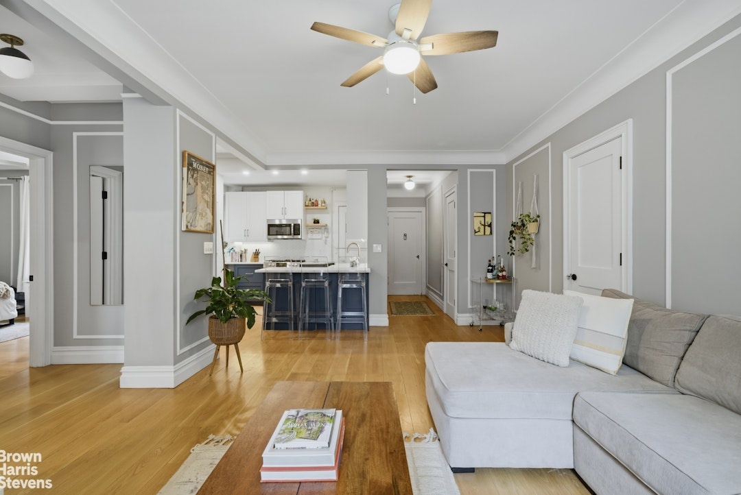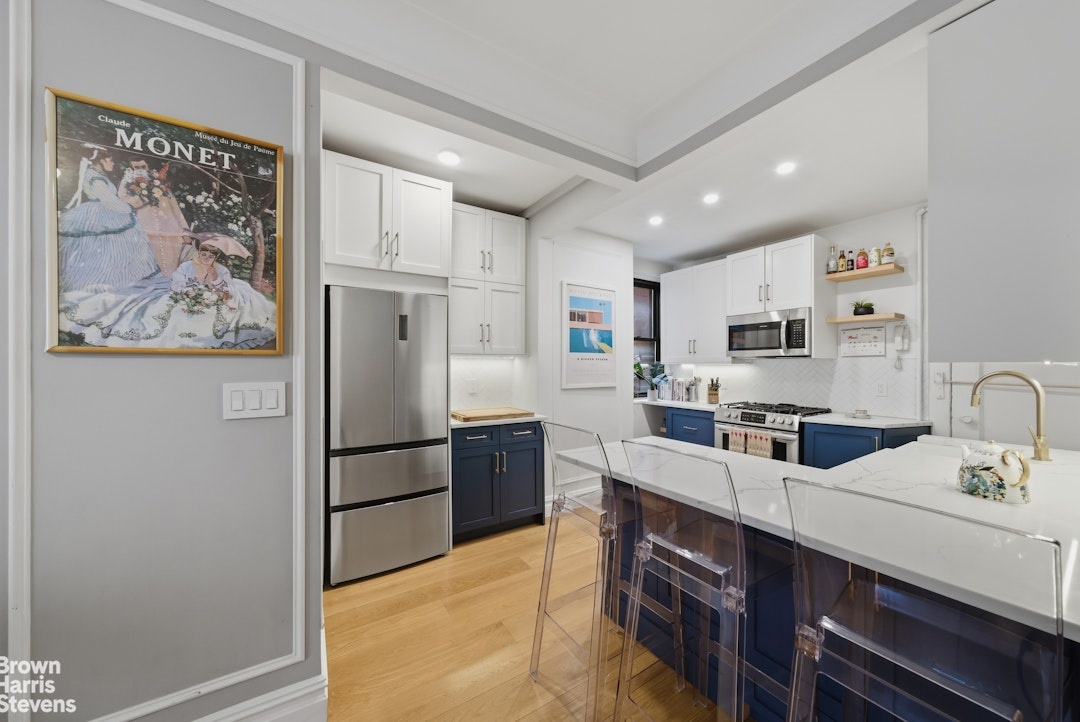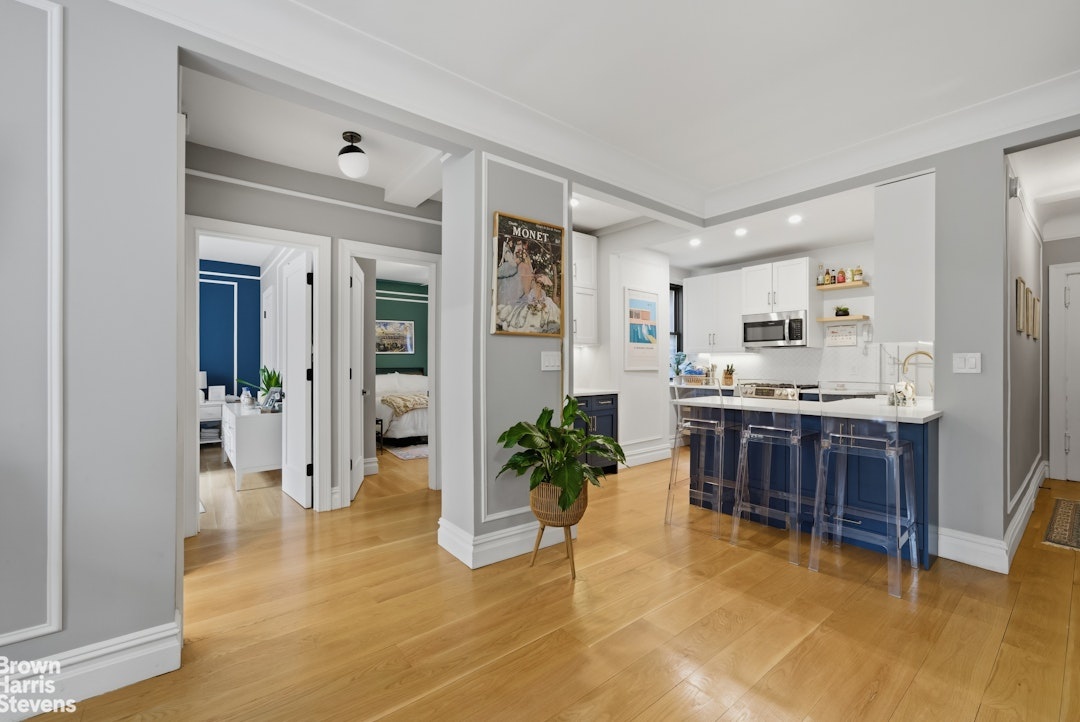 Upon entering this south-facing residence you're struck by the exceptional blend of classic pre-war charm, the 7-inch white oak flooring and the modern upgrades, which include multiple large windows flooding the space with natural light throughout the day. This thoughtfully designed layout begins with a welcoming foyer that opens into a spacious living and dining area, complemented by a versatile corner nook ideal for a home office.