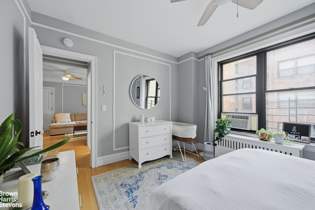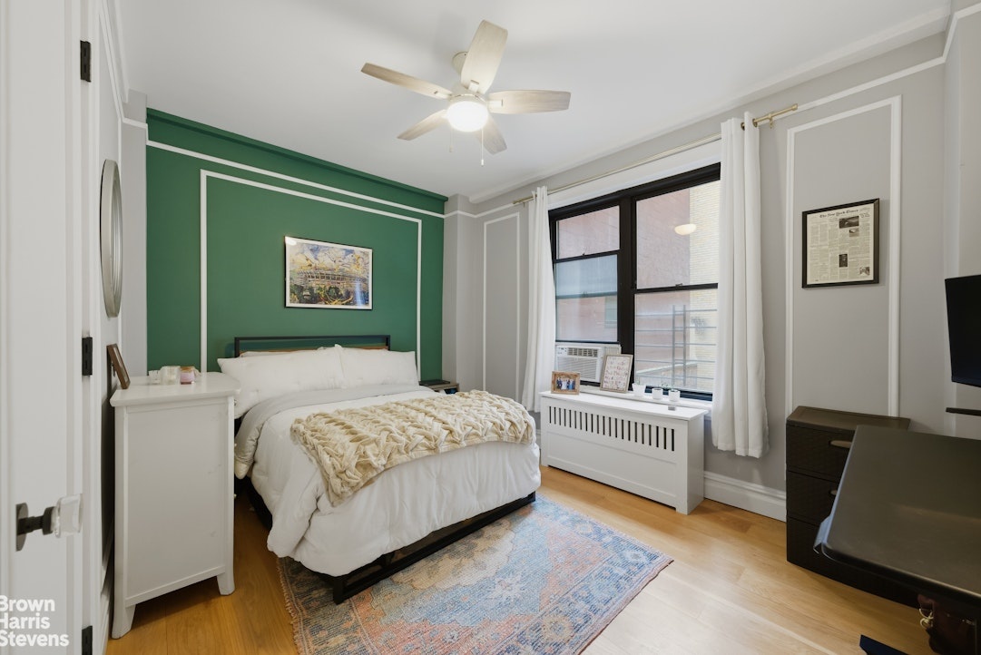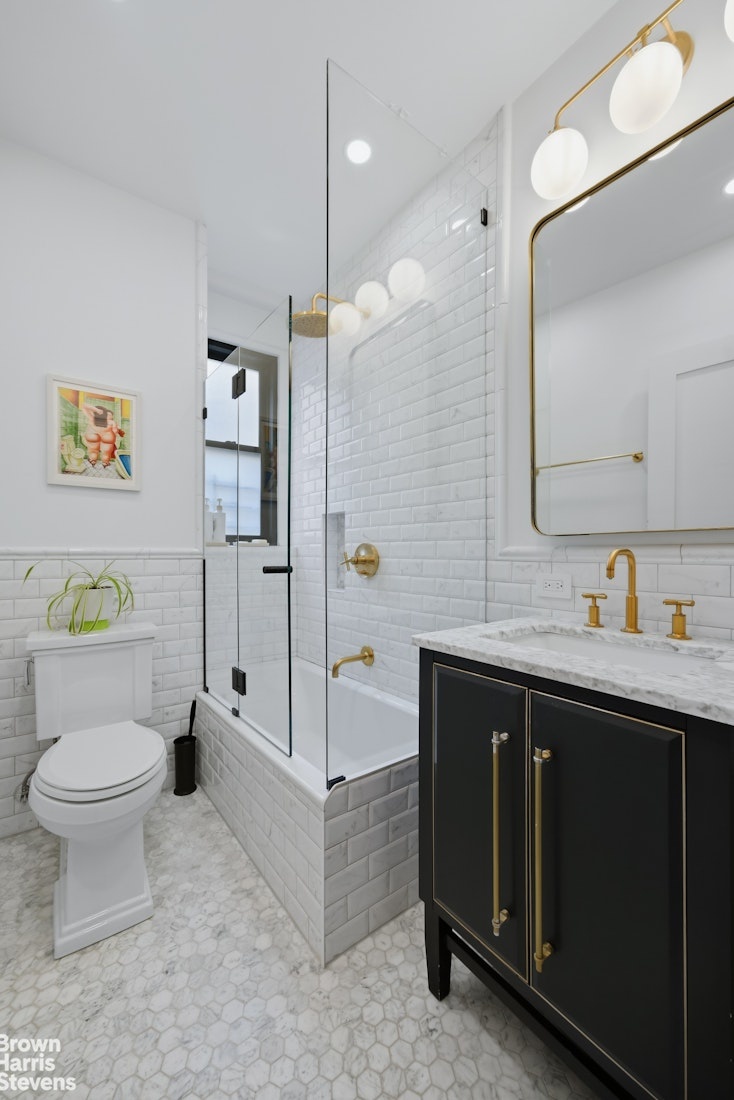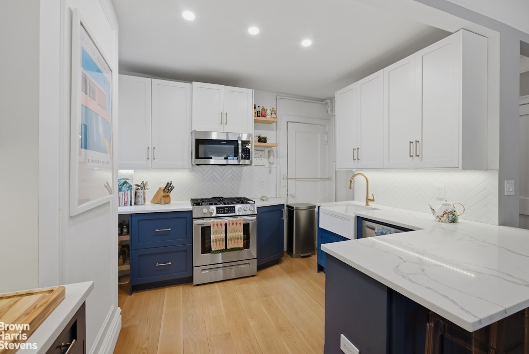 Upon entering this south-facing residence you're struck by the exceptional blend of classic pre-war charm, the 7-inch white oak flooring and the modern upgrades, which include multiple large windows flooding the space with natural light throughout the day. This thoughtfully designed layout begins with a welcoming foyer that opens into a spacious living and dining area, complemented by a versatile corner nook ideal for a home office.