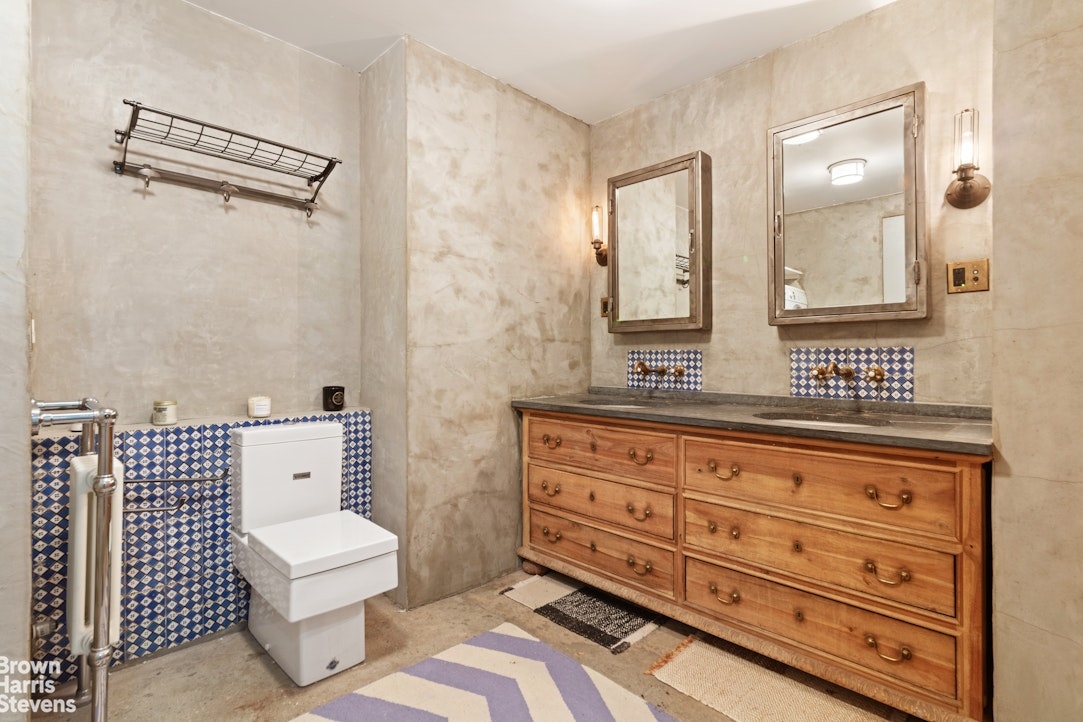 The enormous open chef's kitchen is reminiscent of a Mediterranean farmhouse and features an 8-foot long reclaimed pine work island, a 60-inch dual fuel professional Wolf range vented to the outside, gorgeous imported antique tiles and abundant storage and pantry space. Beyond the entertaining area, a long hallway lined with bookshelves leads to two spacious bedrooms and 3 tastefully renovated bathrooms. The primary bedroom suite is a pin-drop quiet sanctuary with ample closets and a charming en-suite bathroom replete with double sinks and a freestanding claw foot shower-tub. The bright guest bedroom is generously sized with two walk-in closets, and offers easy access to a spacious hall bathroom with a custom double vanity, Duravit commode, a separate shower room with dual rain shower heads and charming antique tiled accents throughout. Every inch of this enchanted home has been carefully curated using materials and finishes that respect and compliment the original architecture. From the aged brass switch plates with rotary dimmers, to the hand selected antique tiles, to the imported brass faucets from Herbeau, this rustic yet polished residence will warm your heart and soothe your soul. Additional amenities include central air conditioning, a Bosch washer-dryer and numerous storage closets throughout.