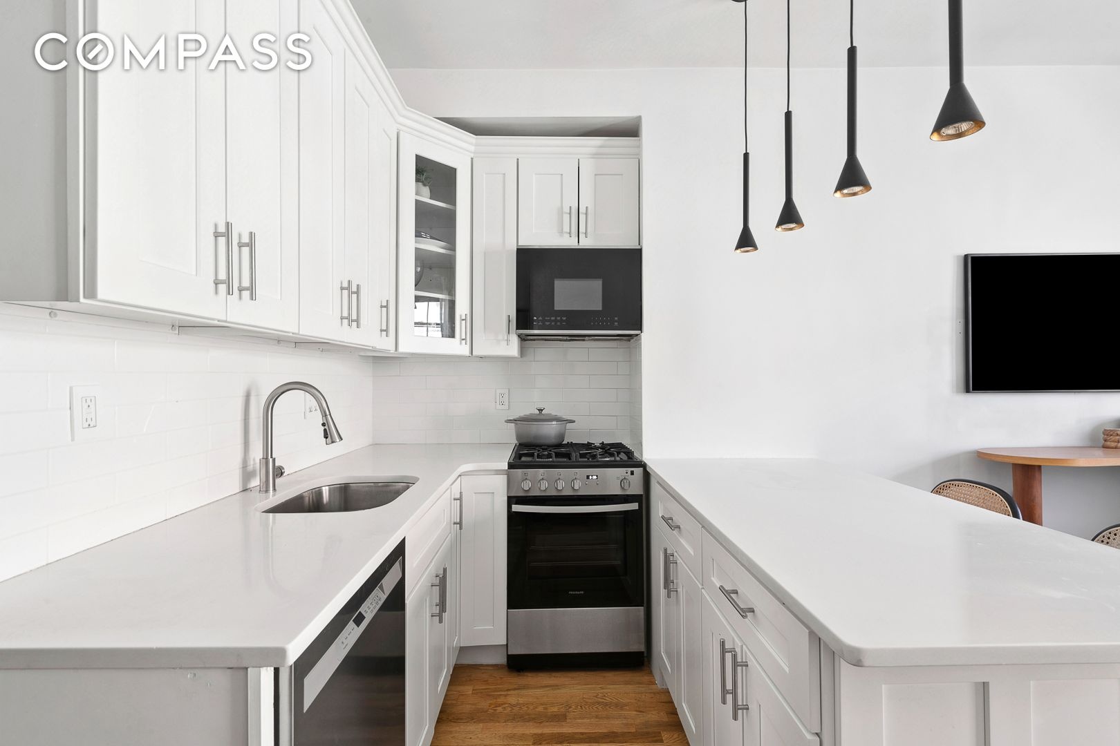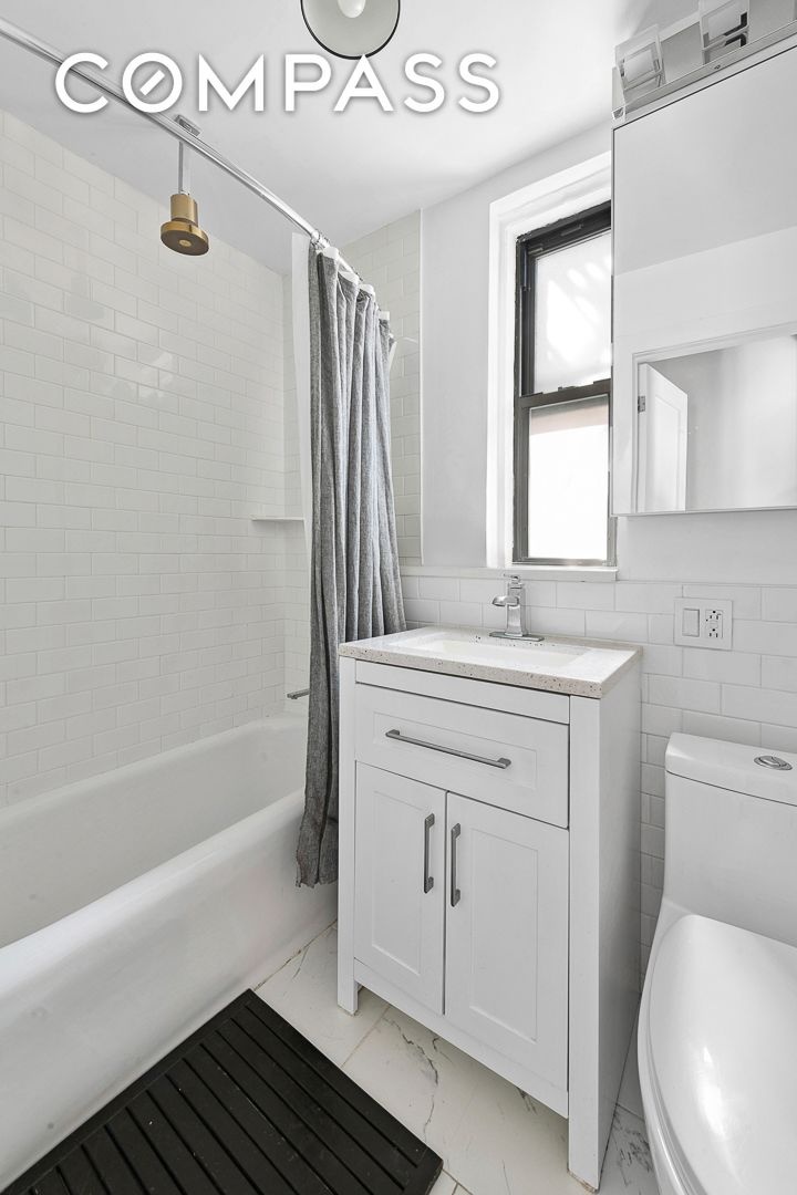 This thoughtfully curated residence blends classic pre-war charm with modern sophistication, featuring rich hardwood floors, soaring ceilings, and custom window treatments throughout. The renovated kitchen features stainless steel appliances and beautiful white granite countertops, with a breakfast bar that allows for in-kitchen dining. A windowed bathroom with a soaking tub is elegantly appointed ensuite, creating a seamless balance of style and functionality in the corner bedroom. Generous proportions and a well-designed layout provide an elevated sense of comfort and livability.