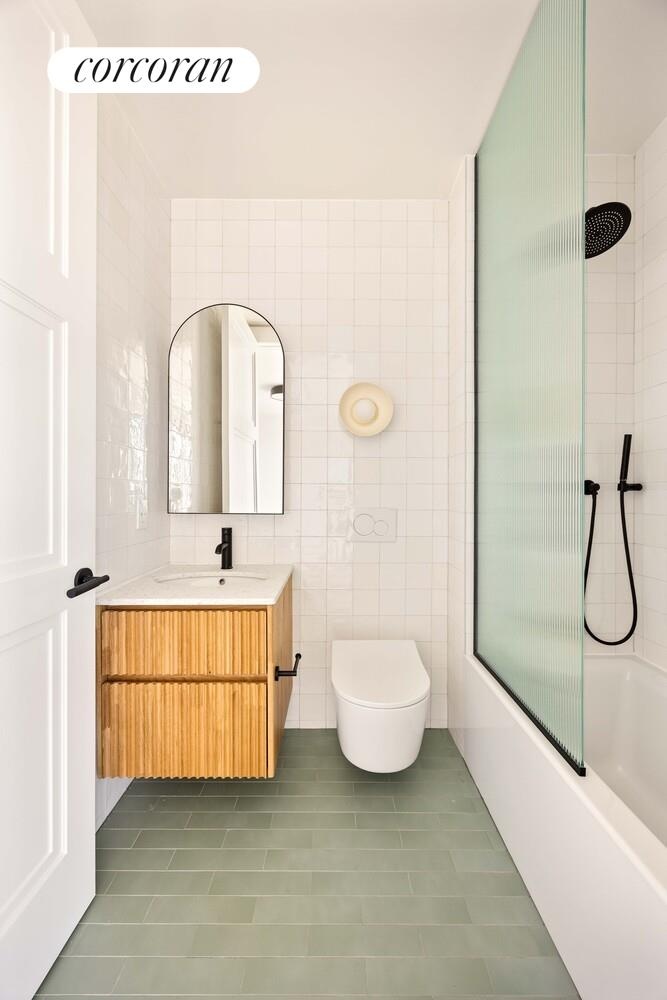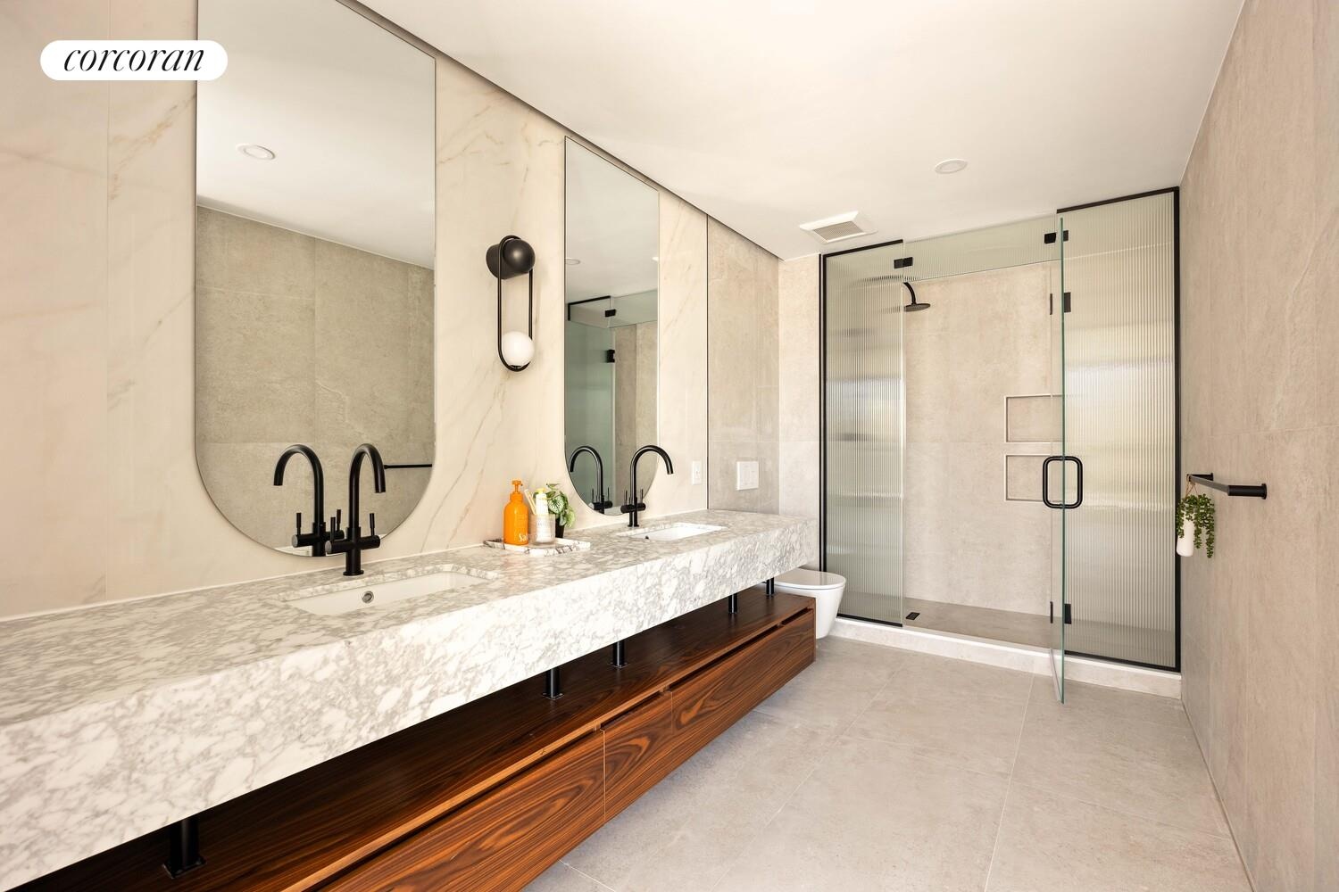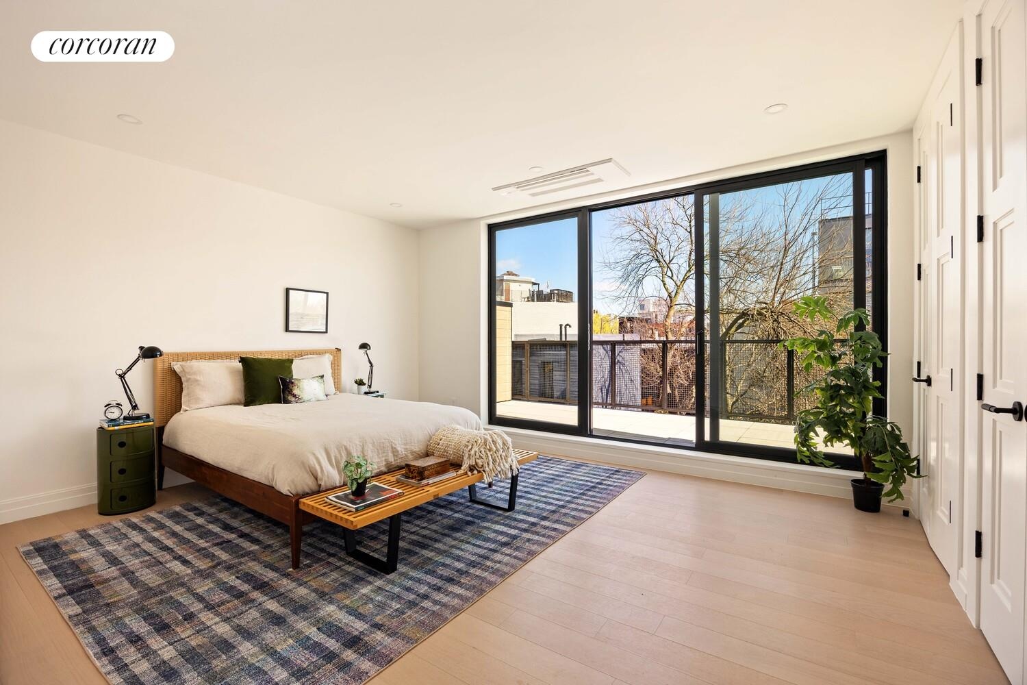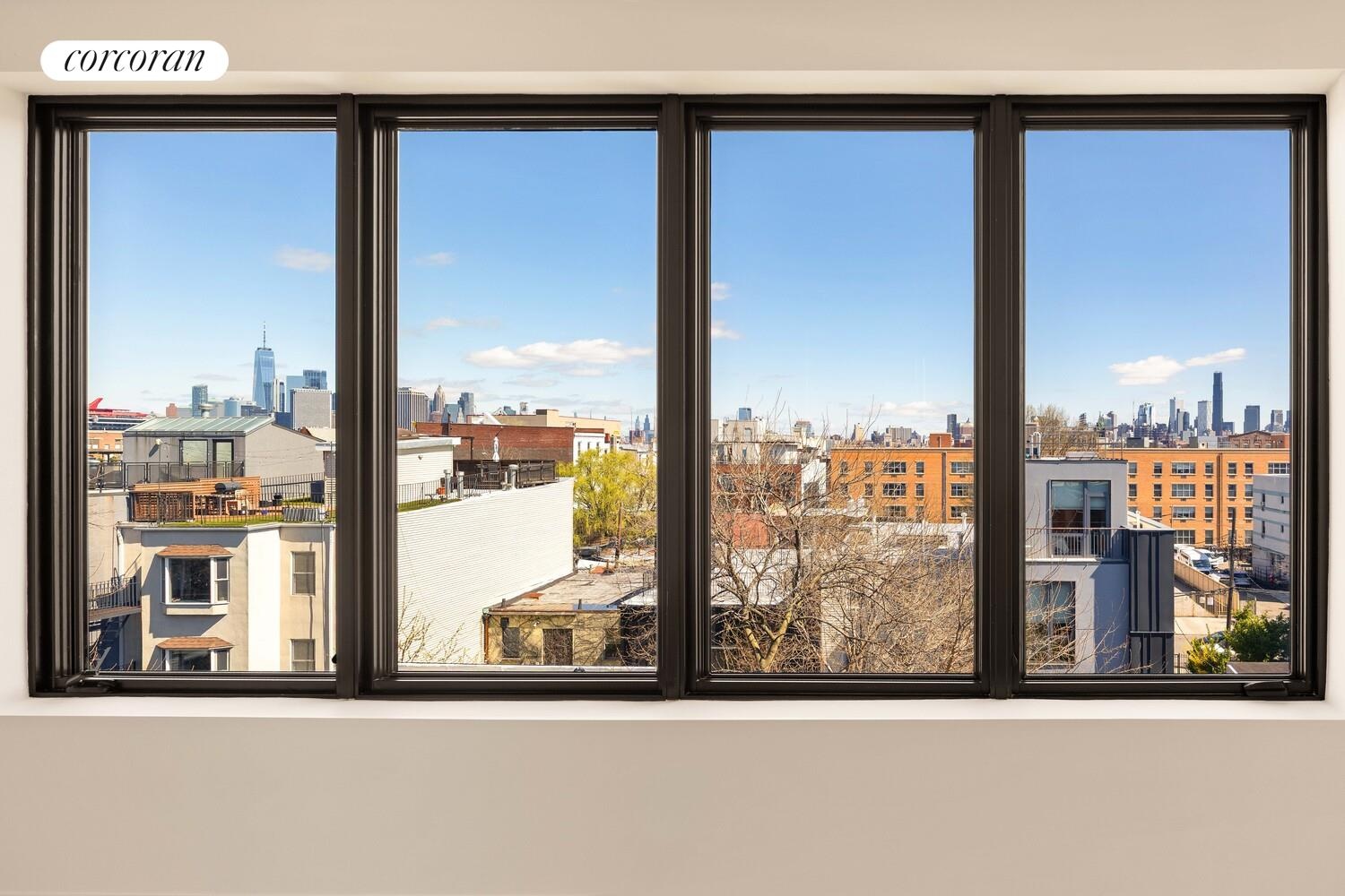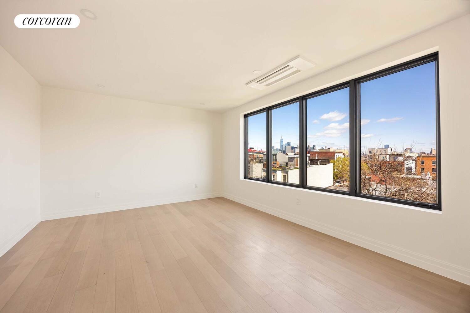 Enjoy a sculptural glass, steel and wood staircase to bring you upstairs to the primary suite above which features backyard views and a quiet location far from the street. Enjoy a double vanity, marble sinks and countertop, Waterworks fixtures, and an oversized glass shower. The second bedroom on this floor also enjoys an ensuite bath with a window, and includes a tub. Take this entire floor for yourself as there are THREE more bedrooms upstairs! The next floor up includes two bedrooms, each with their own ensuite baths, and that rare find, a full laundry room with a utility sink. A sexy and sunny bedroom one more flight up makes an incredible home office with water and skyline views, and the opportunity to step outside to the adjacent roofdeck for a quick escape.