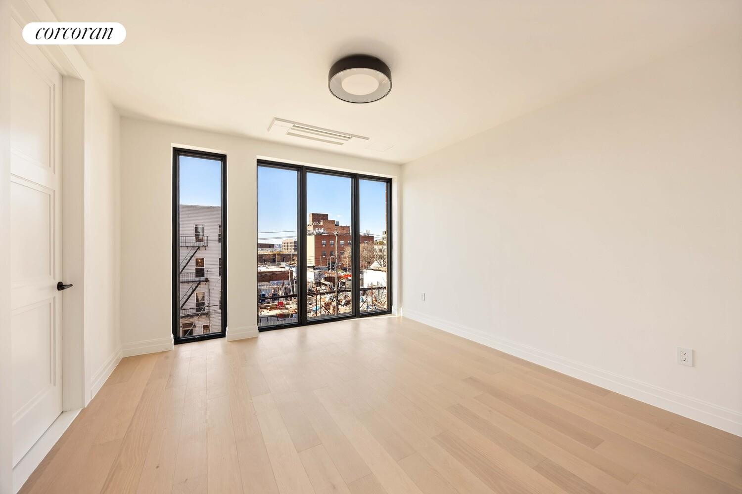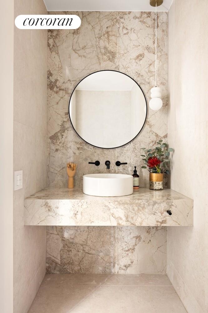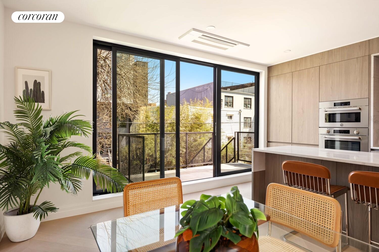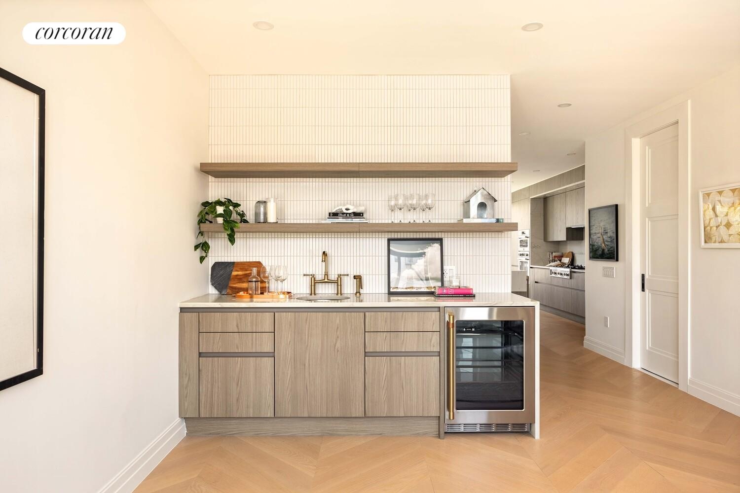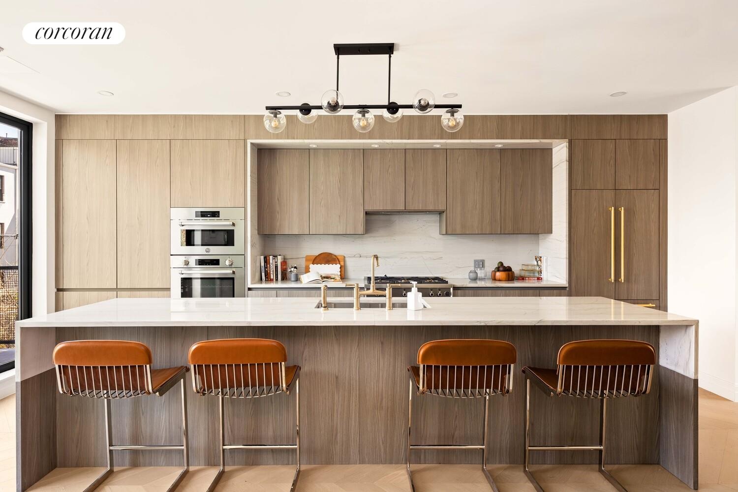 Flooded with light all day long through oversized windows in front facing South, and a wall of sliding glass doors in back to your private deck, you will never want to leave this floor! The magnificent kitchen has been outfitted with a suite of professional GE Café appliances, including a wine cooler, a double oven, and at its centerpiece, a fully vented Bertazzoni Induction Stove. Striking cerused oak cabinetry by Leicht was handmade in Germany and imported through a beloved local Red-Hook kitchen store and offers infinite space for grand entertaining and every kitchen tool you could ever desire. Astra Mont Blanc Quartzite countertops are as practical as they are timelessly beautiful, and the huge center island beckons all of your family and friends to lend a hand, or just keep you company while cooking. The extra width of this property affords you a generous formal dining room in back, and an even larger living room in front that also includes a convenient wet bar with an elegantly tiled backsplash, and a gas fireplace as well, perfect for cozying up!