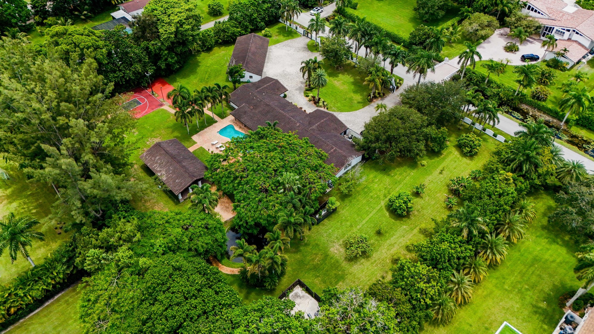 DISCOVER THE ULTIMATE COUNTRY LIFESTYLE AT SUNSHINE RANCHES! THIS 6-BED, 6-BATH ESTATE SPRAWLS ACROSS 2.16 ACRES, BOASTING A GRAND MASTER WING WITH A LIVING AREA, BAR, AND WALK-IN CLOSET. THE GOURMET KITCHEN FEATURES EXOTIC GRANITE, CHERRY WOOD CABINETS, AND HIGH-END APPLIANCES. ENJOY CHISELED EDGE MARBLE FLOORS, HI-TECH SECURITY, AND A DETACHED 1-BED GUEST HOUSE WITH A 4-CAR GARAGE. OUTSIDE, A COVERED PATIO, NEW DECK, AND POOL AREA AWAIT, ALL SECURED BY IMPACT GLASS. WITH A GAS GENERATOR, RESORT-STYLE PAVILION, AND AMPLE STORAGE, THIS PROPERTY EPITOMIZES LUXURY COUNTRY LIVING.
