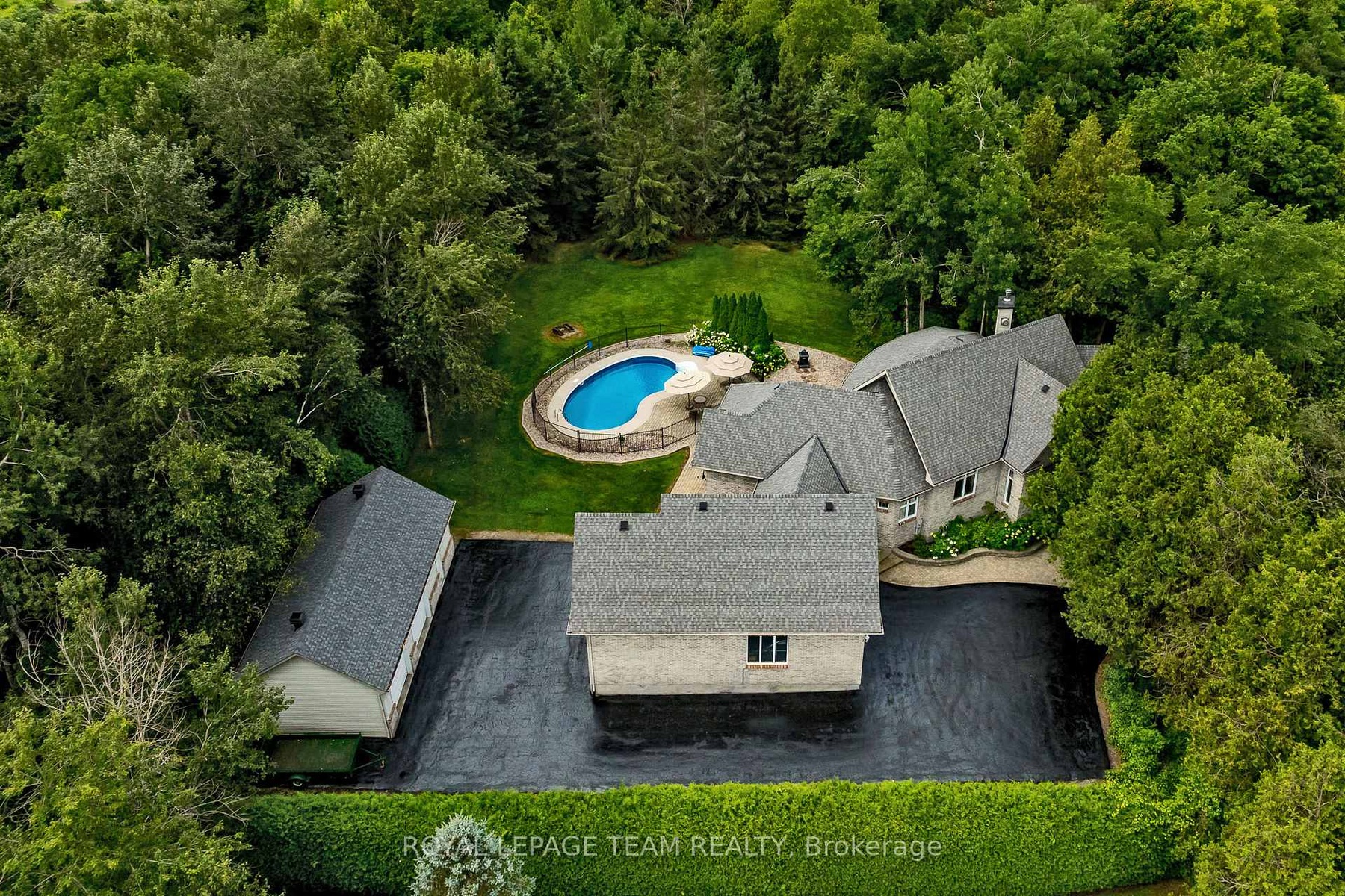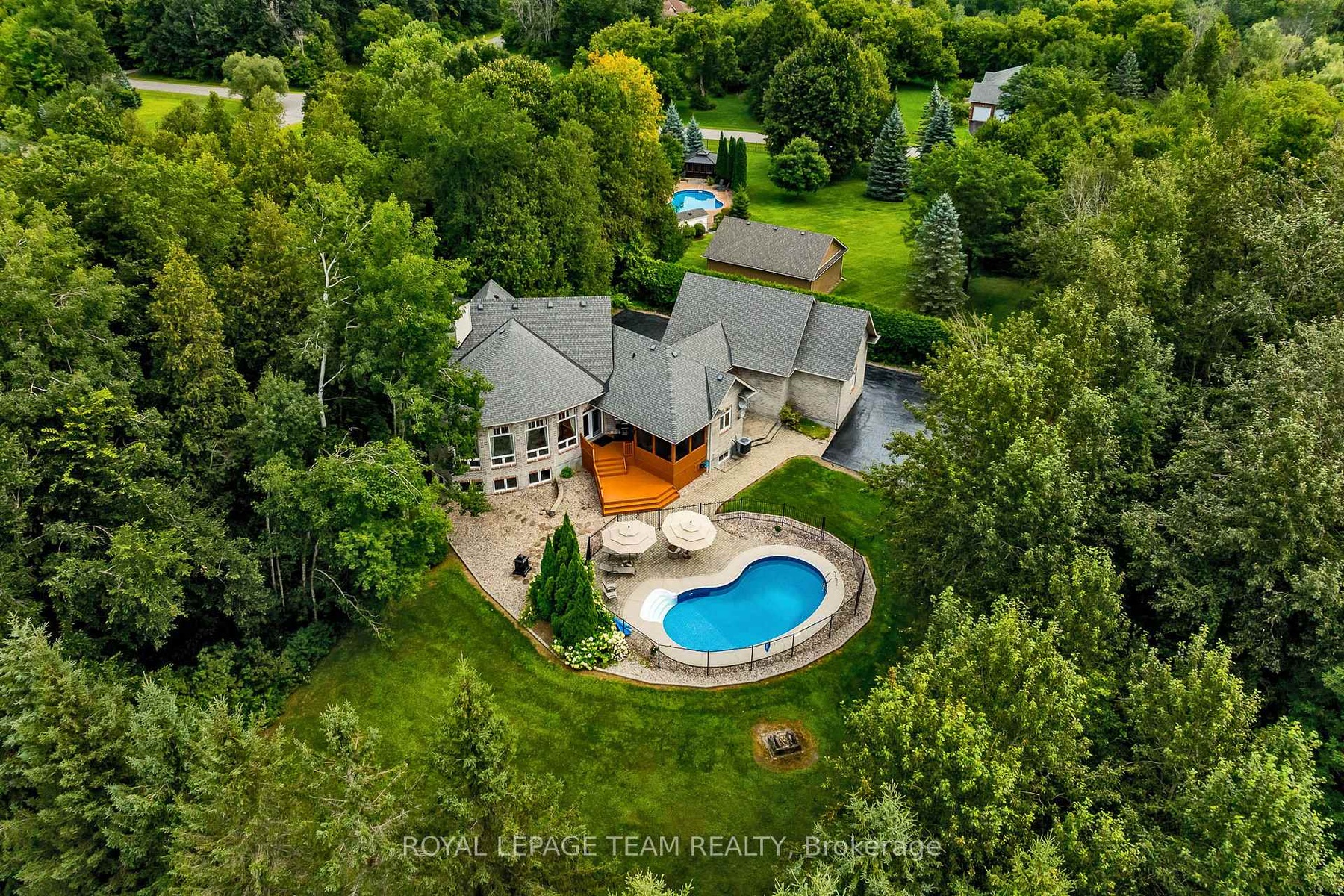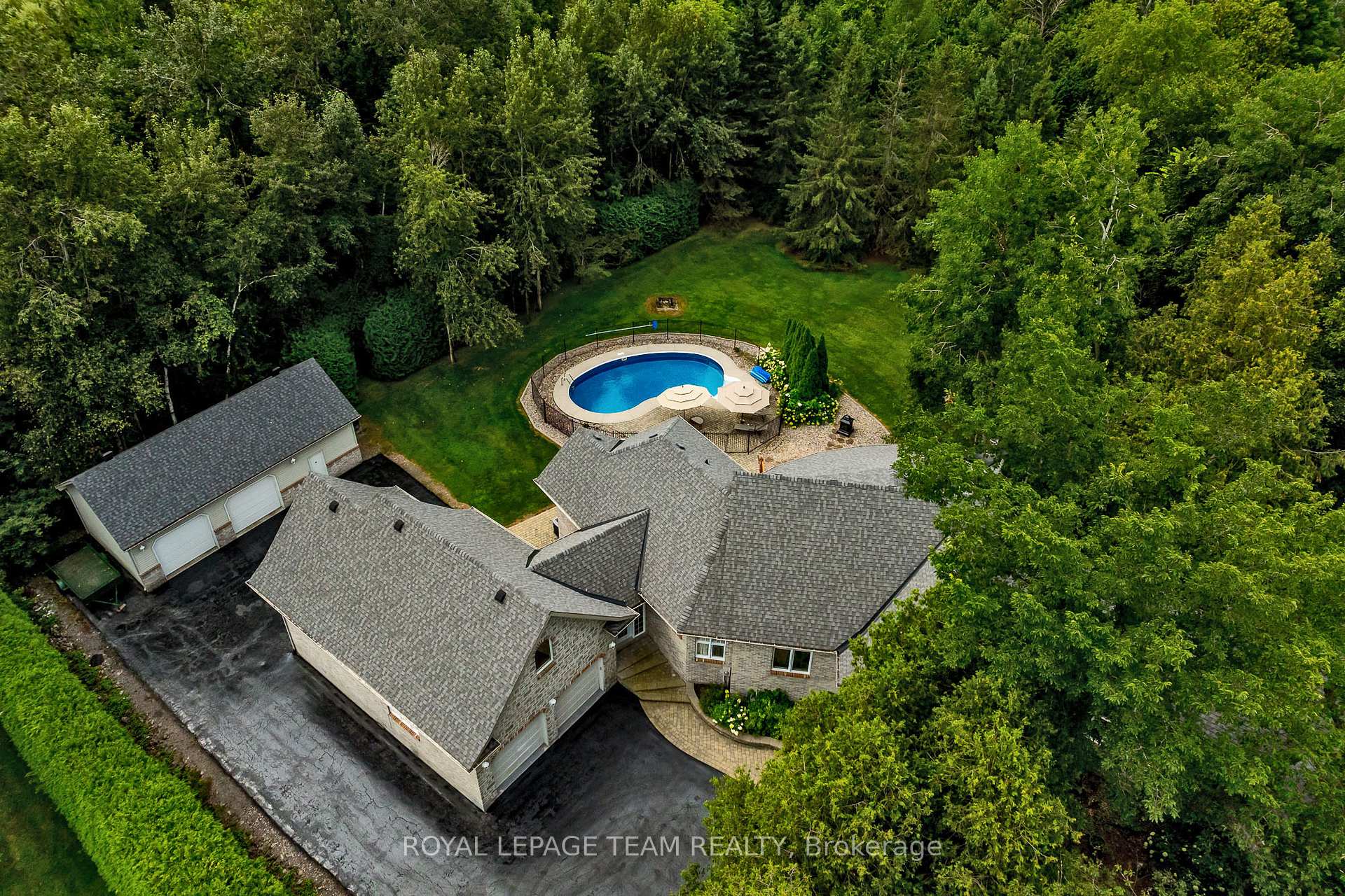 Perched majestically atop a gentle hill and secluded by a lush canopy of mature trees, this magnificent family home offers unparalleled privacy and a lifestyle defined by elegance. A private paved drive winds through the verdant landscape, leading you to a residence designed for both grand entertaining and quiet reflection. The heart of the home is the expansive living room, where soaring high ceilings and a massive wall of windows frame breathtaking views of the backyard oasis. At the center of it all sits a large gas fireplace, serving as a centerpiece that radiates warmth throughout the open-plan space. The gourmet kitchen is a chef's dream, boasting abundant cabinetry, a spacious layout, and a dedicated pantry area for seamless organization of all your culinary essentials. Bedrooms are masterfully set off to one wing of the home for privacy. The primary suite is a true sanctuary, complete with its own private porch, a cozy fireplace, and a spa-like ensuite featuring a walk-in shower and a large corner tub positioned to soak in tranquil views of the surrounding forest. A second upstairs bedroom also enjoys the luxury of a private ensuite, ensuring comfort for family and guests. For those who value transitions, a thoughtfully designed all-season entryway connects the house to the attached double-car garage, which includes a separate insulated workshop and a loft area above.The lower level expands the living space significantly, offering three generous bedrooms, a large professional office, and an expansive storage area. Stepping outside, the backyard is an entertainer's paradise, centered around a sparkling inground pool and a screened-in porch that provides a bug-free vantage point for summer evenings. A detached two-car garage with an extra work area provides ample space for the hobbyist or car enthusiast. More than just a house, this is a legacy property-a magnificent family home destined to create cherished memories for generations to come.