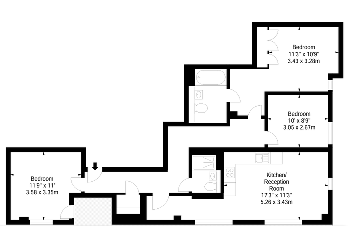 The property comprises three generously sized bedrooms and two modern bathrooms, offering comfortable accommodation for families or professional sharers.