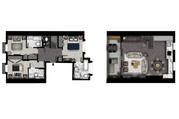 Each of the three spacious bedrooms benefits from its own luxurious en-suite bathroom, finished in natural marble with bespoke vanity units, mirrored cabinets, and high-end fittings including rainfall showers, bathtubs, and integrated Aquavision TVs. Additional features include Toto-style VitrA smart WCs and premium Zucchetti Italian fittings.