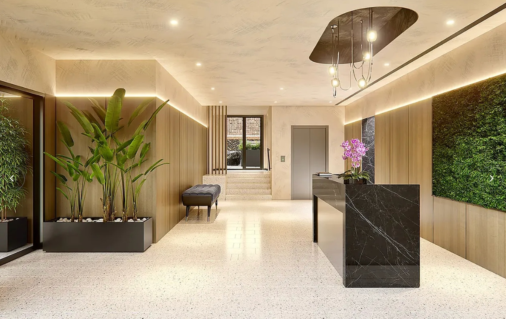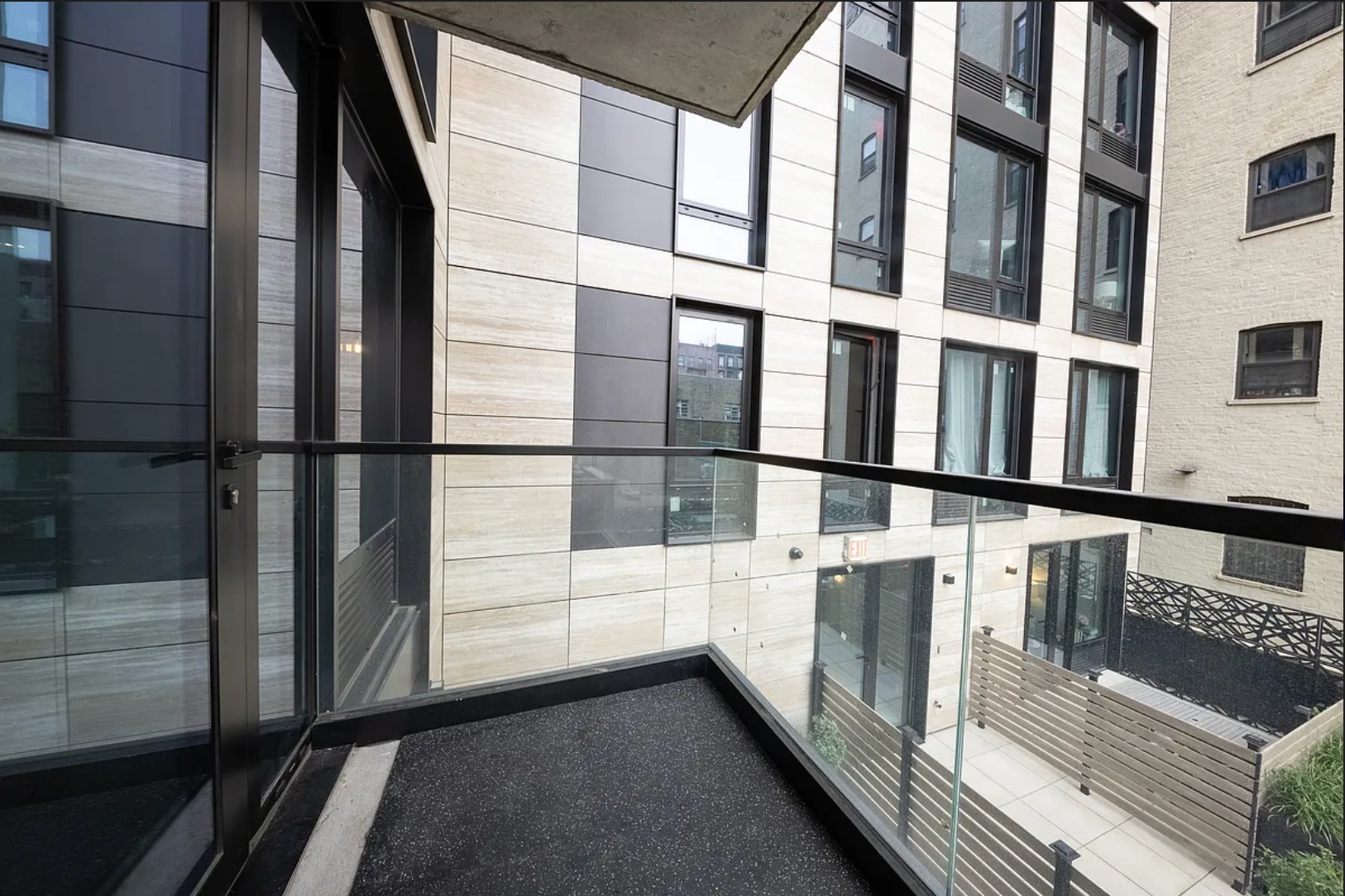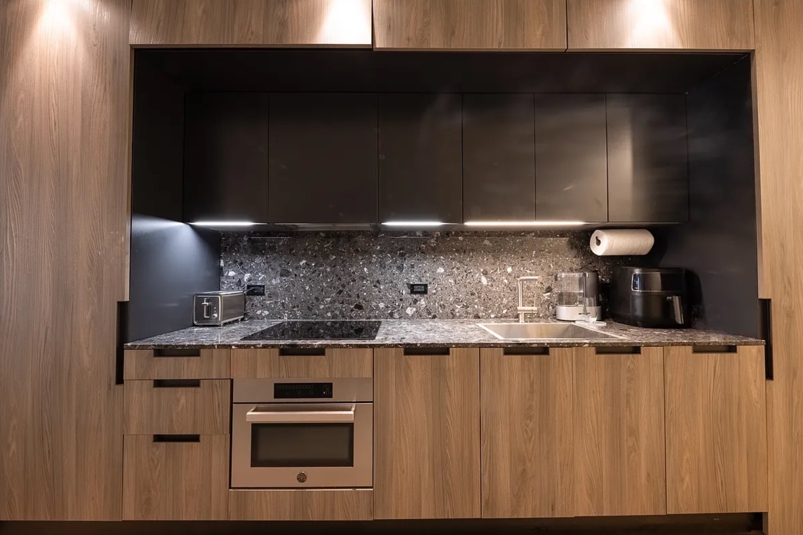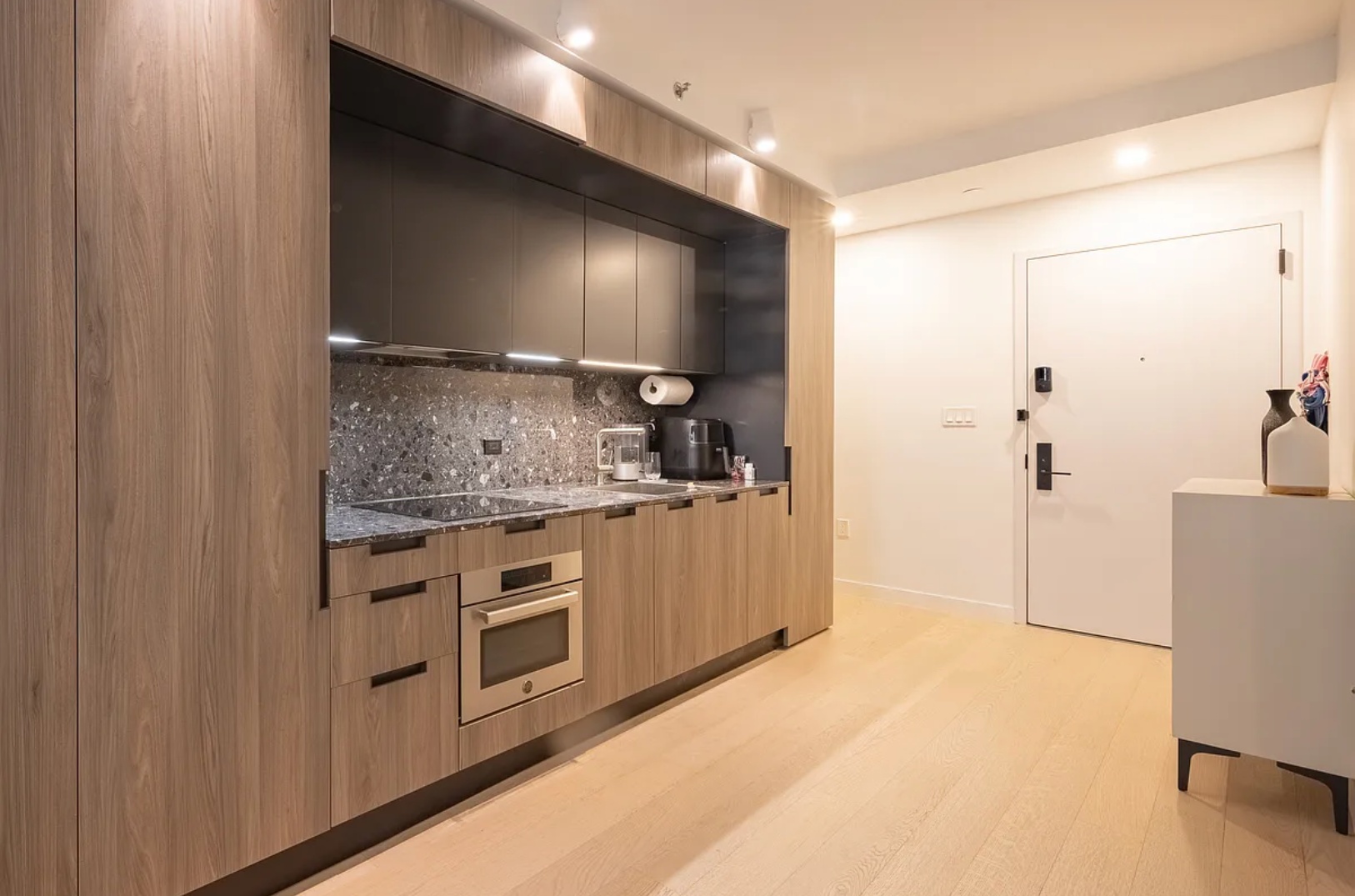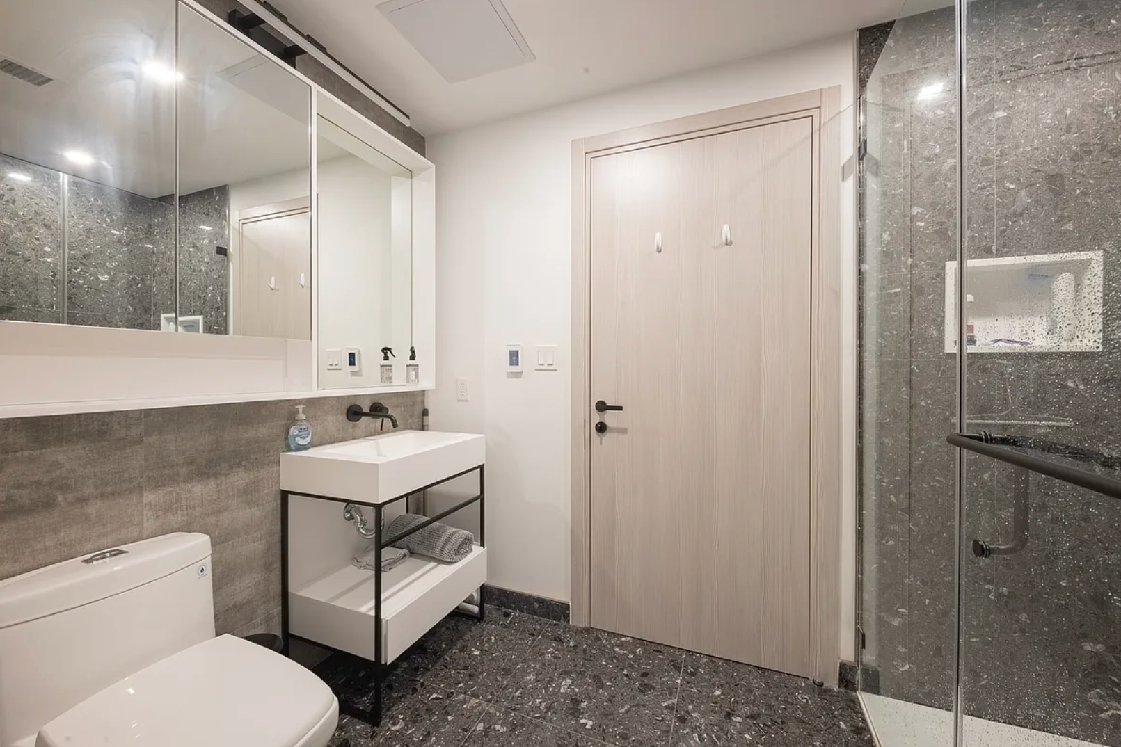 The open-concept living and dining area flows effortlessly to a private balcony overlooking a tranquil courtyard, while the chef’s kitchen impresses with Italian terrazzo countertops, custom cabinetry, and a full suite of premium Bertazzoni and Blomberg appliances. The spa-inspired bathroom features terrazzo walls, a double vanity, walk-in rain shower, and a deep soaking tub.