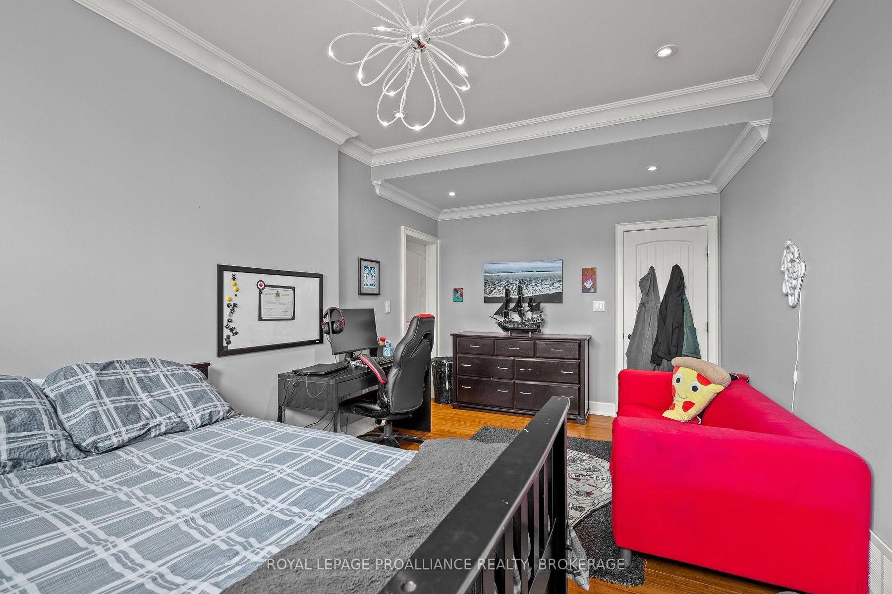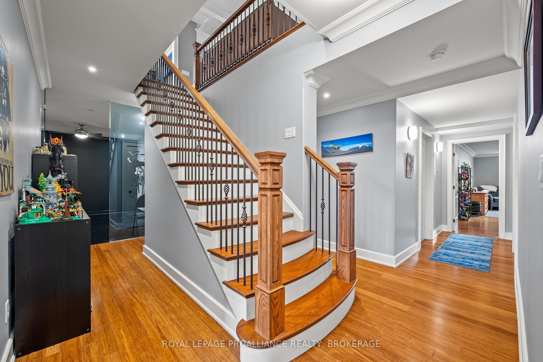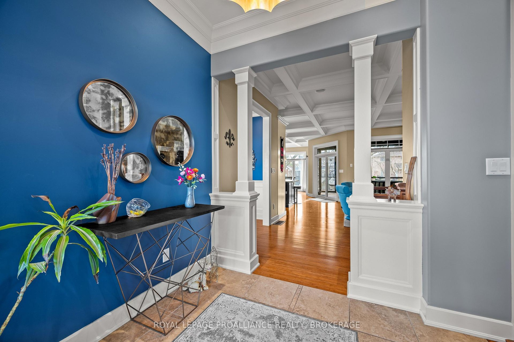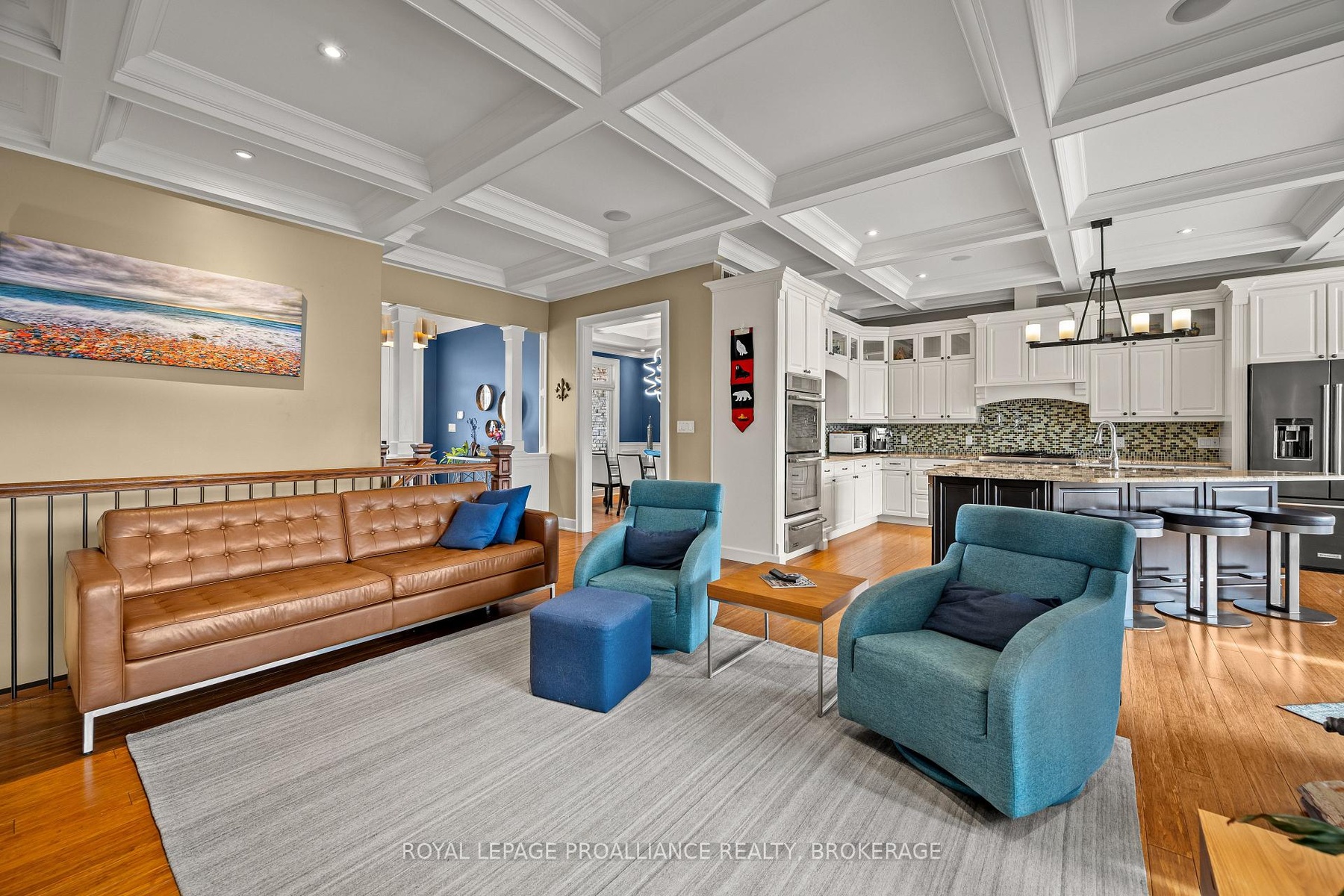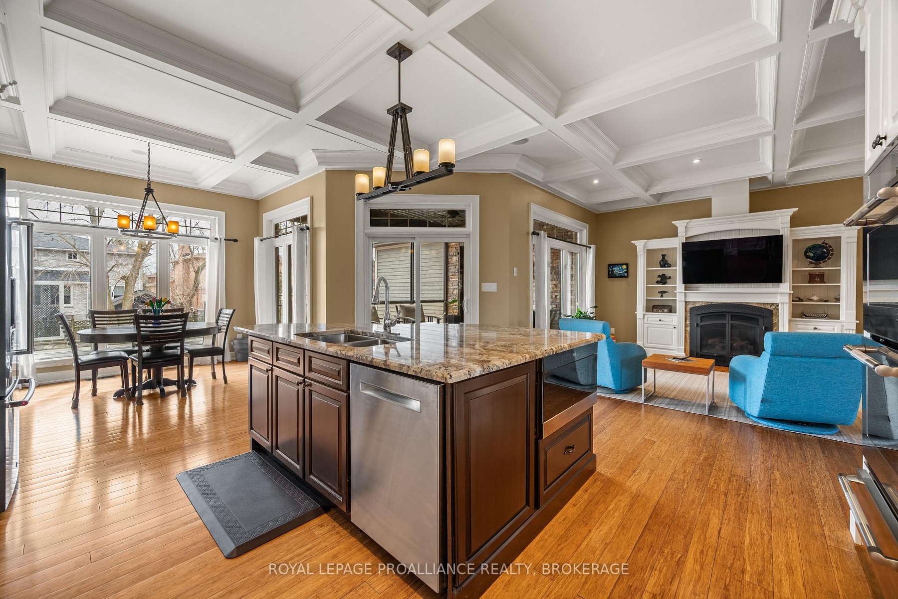 Executive custom-built elevated bungalow in the highly sought-after Westwoods neighbourhood, known for its excellent school district & established surroundings. This meticulously maintained home showcases jaw-dropping finishes throughout, including coffered ceilings, wainscotting, crown moulding, soaring ceilings, custom built-in detailed trimwork, & upgraded light fixtures throughout. The heart of the home is a stunning chef's kitchen featuring a massive granite island with breakfast bar, premium appliances (Thermador gas stove, Jennair built-in oven) & eat-in area, seamlessly flowing into a spacious & elegant living area with a gas fireplace. A stunning Lanai with skylights & multiple access points offers the perfect place to unwind, while built-in ceiling speakers on both levels of the home elevate everyday living & entertaining. The primary suite is a retreat of its own host to a massive walk-in closet with built-ins, & spa-like ensuite. The main floor is finished off with 2 additional generously sized bedrooms, a full bathroom, a main floor laundry room & a 2pc powder room. The fully finished basement adds incredible versatility with 3 additional bedrooms, a full bathroom, a dry sauna, custom gym, & a wet bar within the spacious recreation area. The backyard is a private oasis, complete with an inground heated saltwater pool & hot tub (2021), while the front yard benefits from an inground irrigation system. Car enthusiasts & hobbyists will appreciate the monstrous custom attached garage that accommodates 3 cars (2 in tandem & 1 on the side), featuring a commercial-grade door, epoxy flooring, metal-clad walls & ceiling, storage loft, & a rear roll-up door providing direct backyard access, truly a rare & impressive space that must be seen to be appreciated. A standout offering combining craftsmanship, functionality, & lifestyle in one of Kingston's most desirable communities.