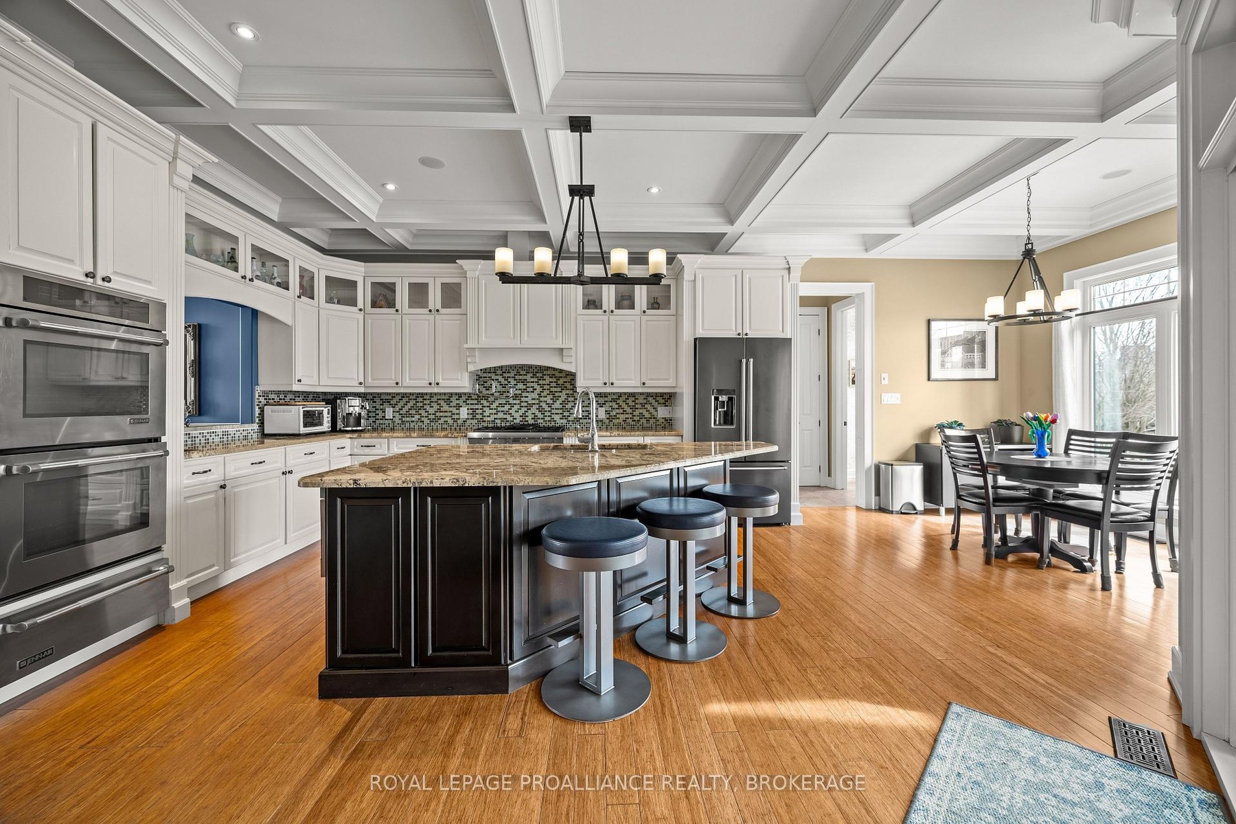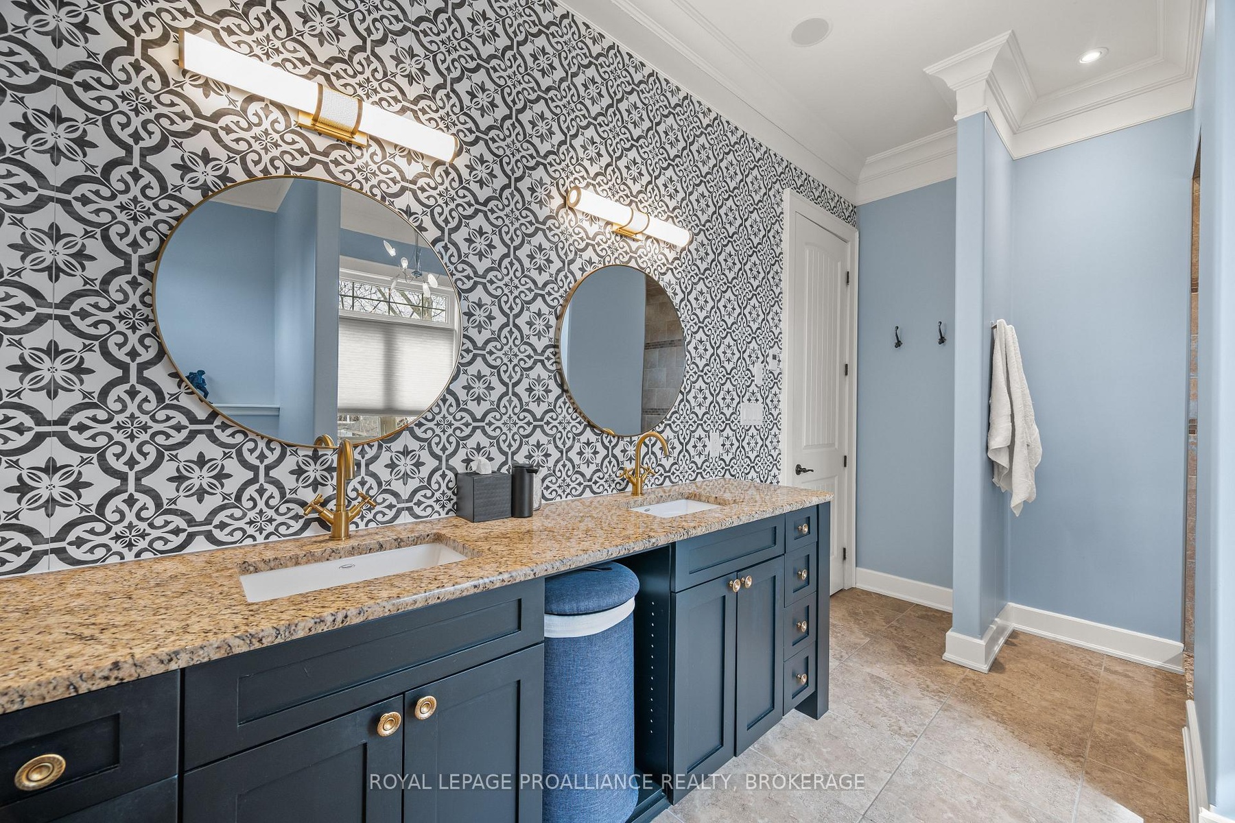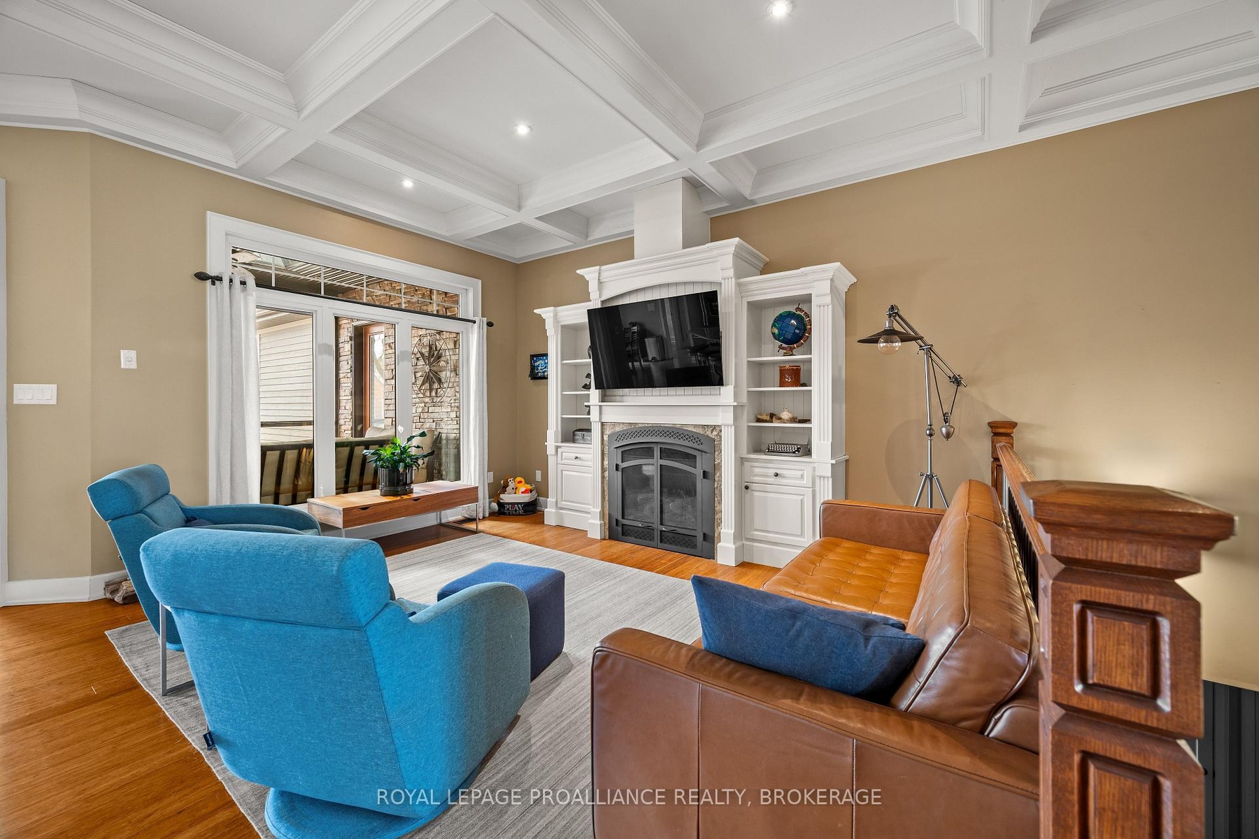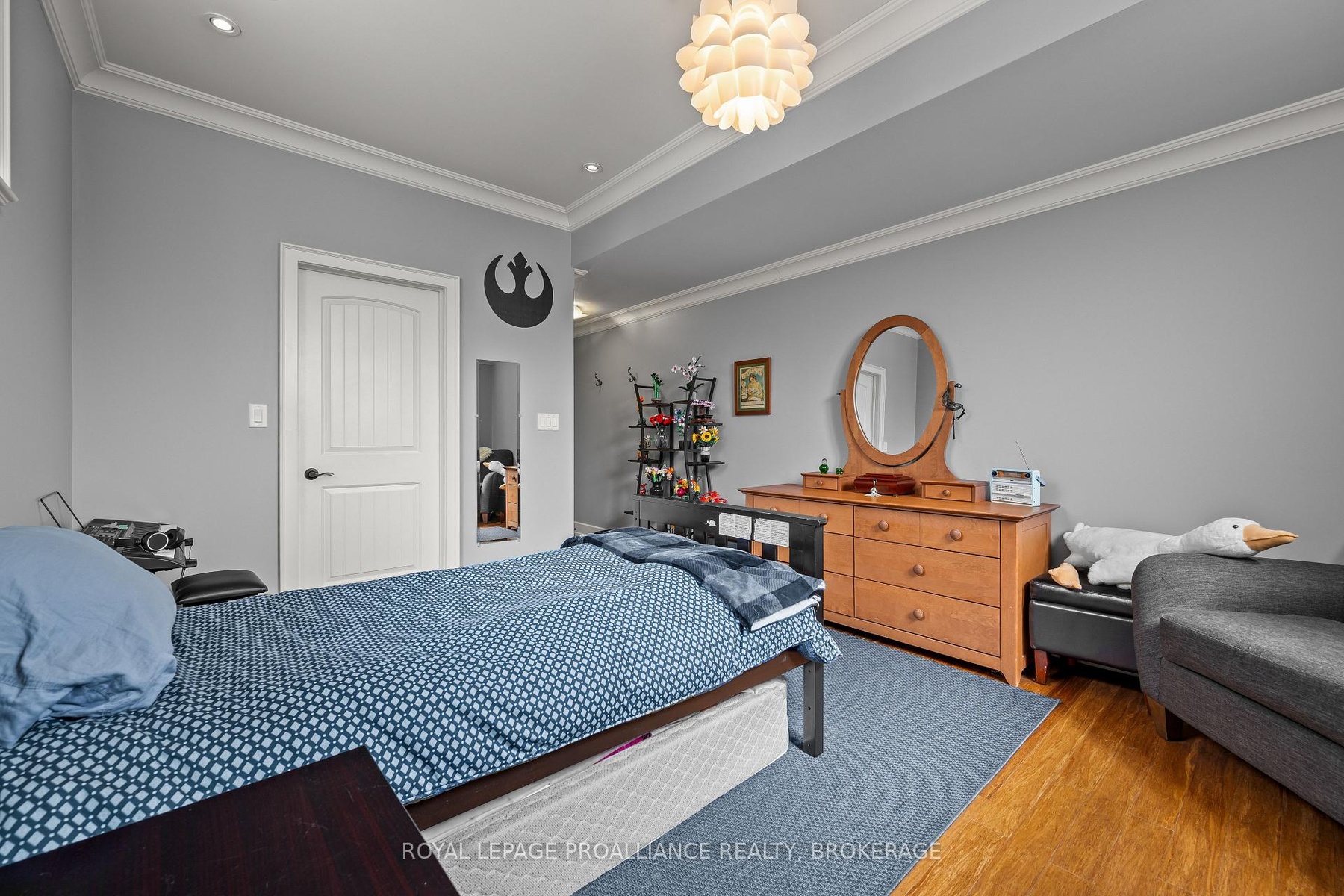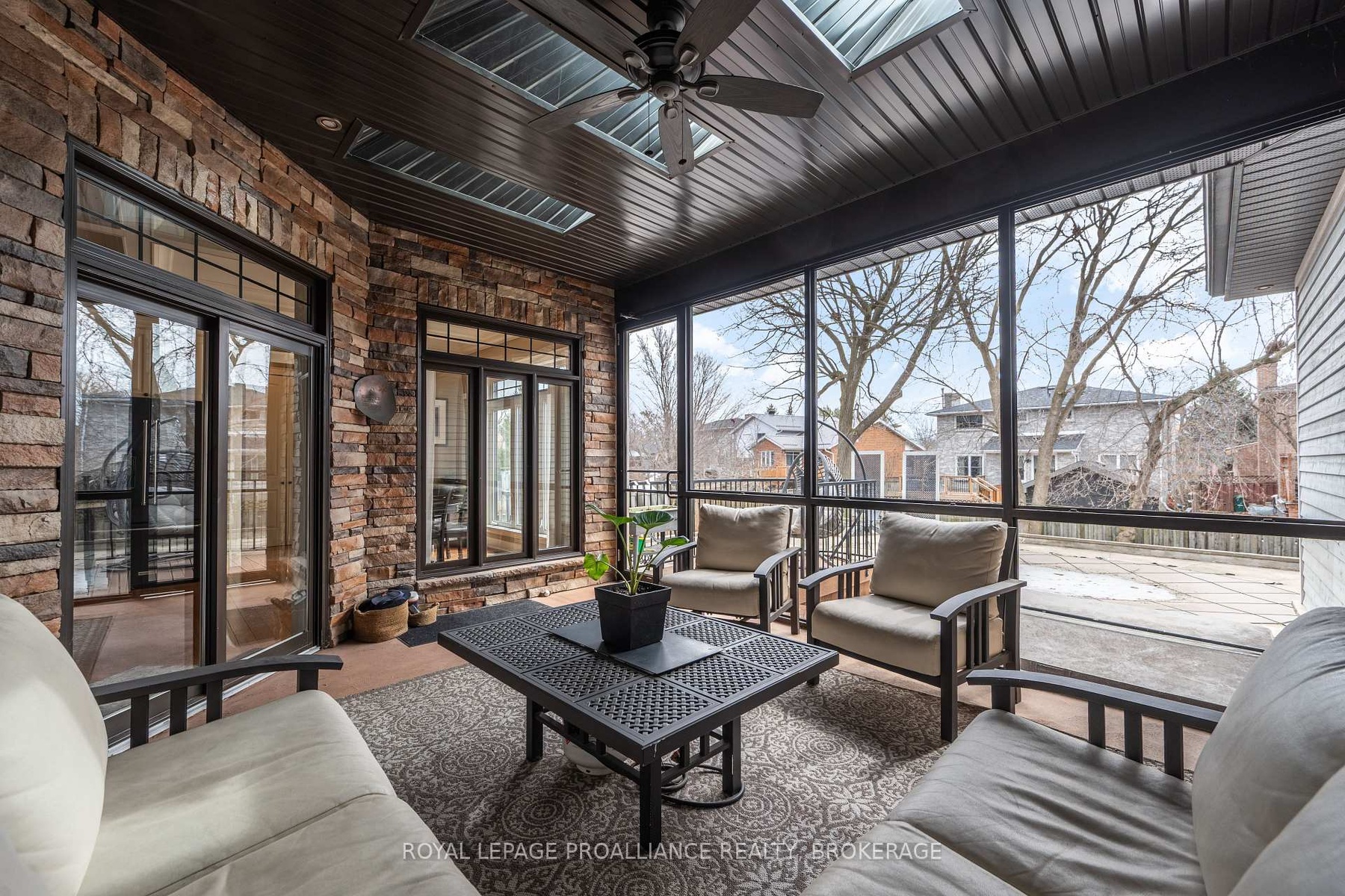 Executive custom-built elevated bungalow in the highly sought-after Westwoods neighbourhood, known for its excellent school district & established surroundings. This meticulously maintained home showcases jaw-dropping finishes throughout, including coffered ceilings, wainscotting, crown moulding, soaring ceilings, custom built-in detailed trimwork, & upgraded light fixtures throughout. The heart of the home is a stunning chef's kitchen featuring a massive granite island with breakfast bar, premium appliances (Thermador gas stove, Jennair built-in oven) & eat-in area, seamlessly flowing into a spacious & elegant living area with a gas fireplace. A stunning Lanai with skylights & multiple access points offers the perfect place to unwind, while built-in ceiling speakers on both levels of the home elevate everyday living & entertaining. The primary suite is a retreat of its own host to a massive walk-in closet with built-ins, & spa-like ensuite. The main floor is finished off with 2 additional generously sized bedrooms, a full bathroom, a main floor laundry room & a 2pc powder room. The fully finished basement adds incredible versatility with 3 additional bedrooms, a full bathroom, a dry sauna, custom gym, & a wet bar within the spacious recreation area. The backyard is a private oasis, complete with an inground heated saltwater pool & hot tub (2021), while the front yard benefits from an inground irrigation system. Car enthusiasts & hobbyists will appreciate the monstrous custom attached garage that accommodates 3 cars (2 in tandem & 1 on the side), featuring a commercial-grade door, epoxy flooring, metal-clad walls & ceiling, storage loft, & a rear roll-up door providing direct backyard access, truly a rare & impressive space that must be seen to be appreciated. A standout offering combining craftsmanship, functionality, & lifestyle in one of Kingston's most desirable communities.